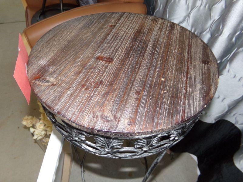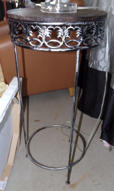 Plant stand measures 32" tall and 15" diameter. It has a faux wood top with a metal frame.