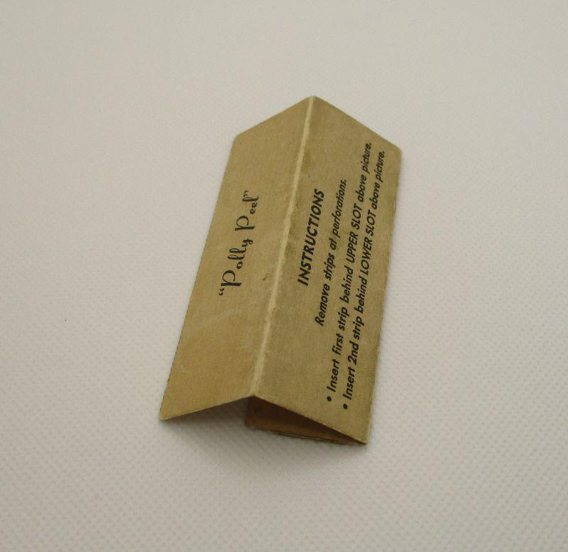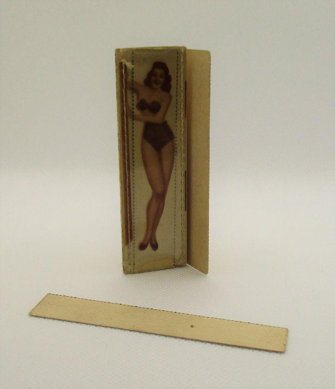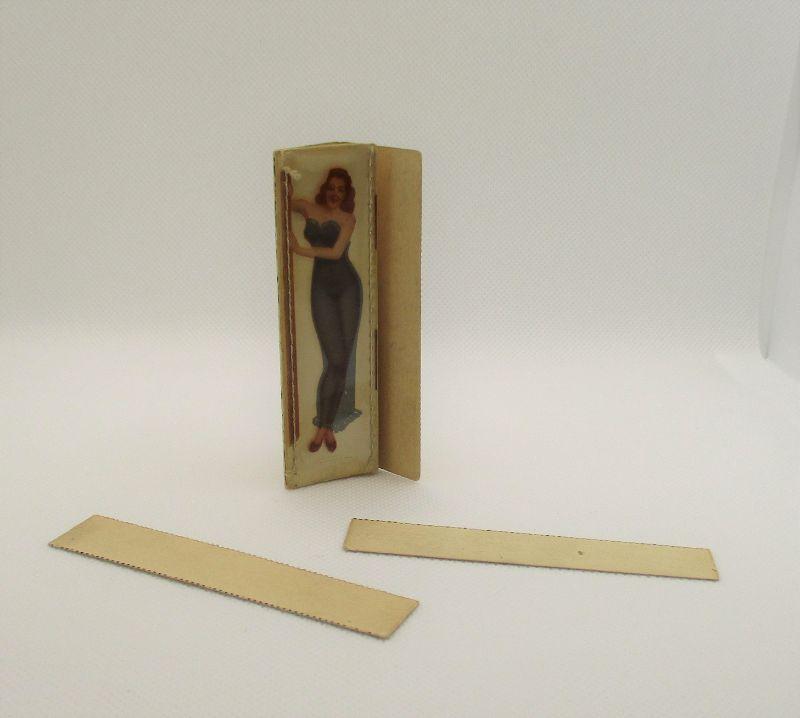 This is about 3.5" long and as you slide the cards in, the pin-up loses some clothes until she is fully exposed.
