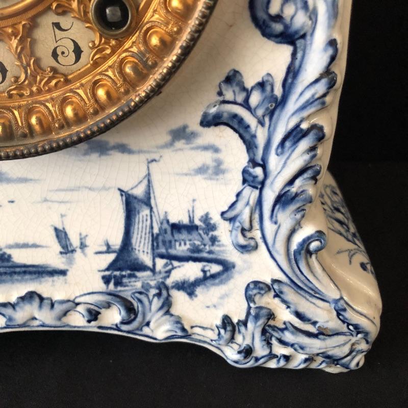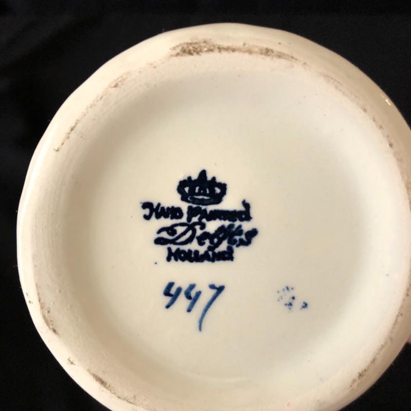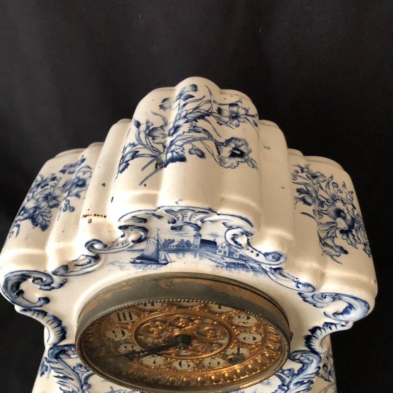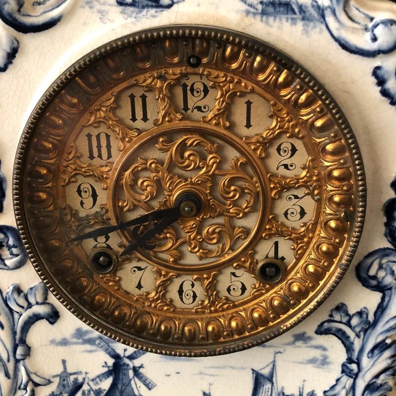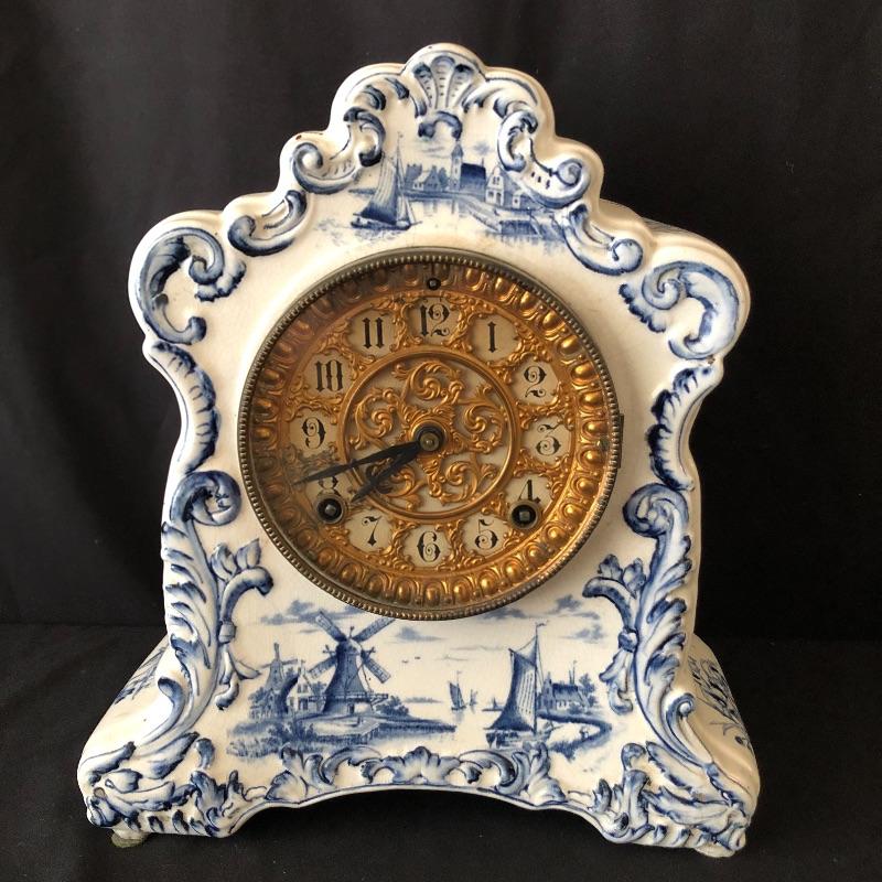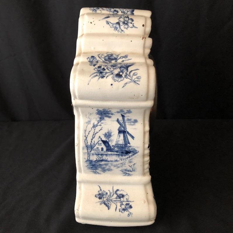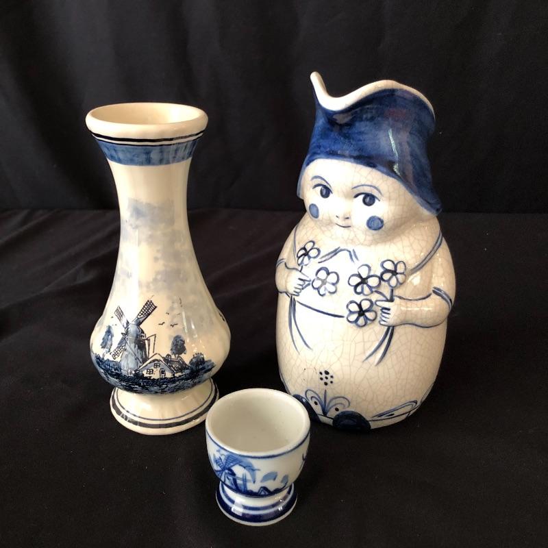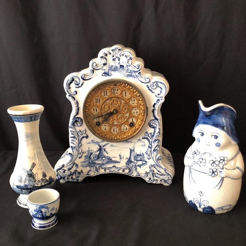 This Dutch inspired assortment of porcelain includes a beautiful mantle clock that comes with key. The clock depicts a Dutch scene with an ornate clock face; it winds up and the pendulum does work, but we cannot guarantee beyond that. It has a makers mark that appears to say Tioca or something similar. Also included is a vase numbered 447 and marked Delfts of Holland, a quaint Dutch style pitcher and an egg cup.