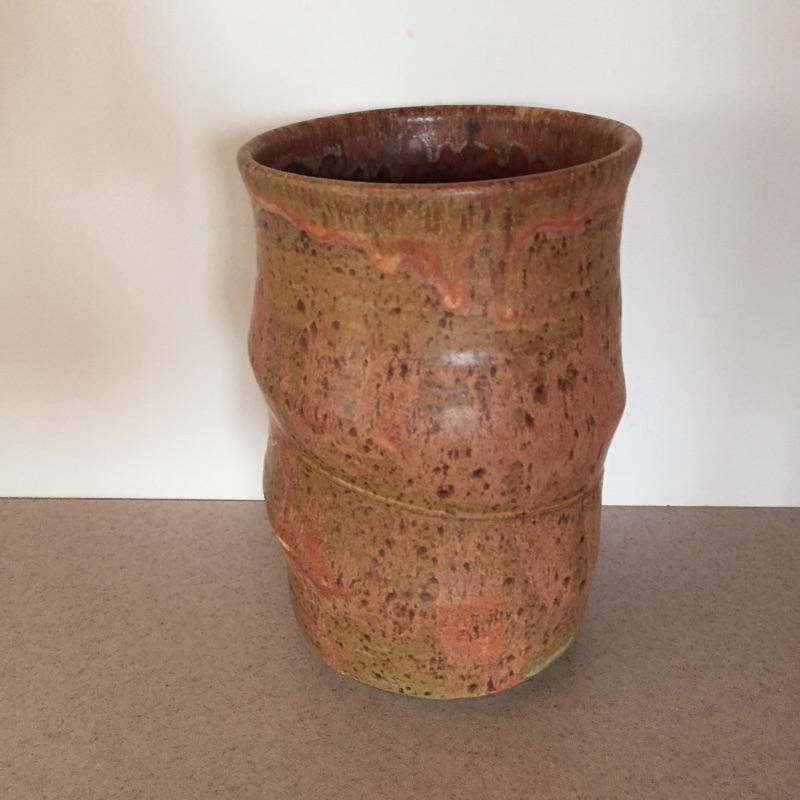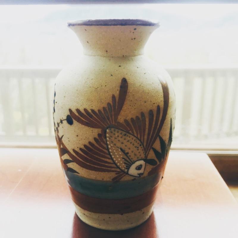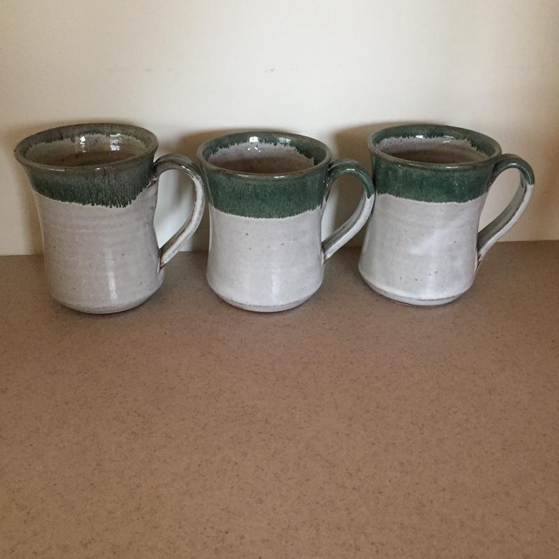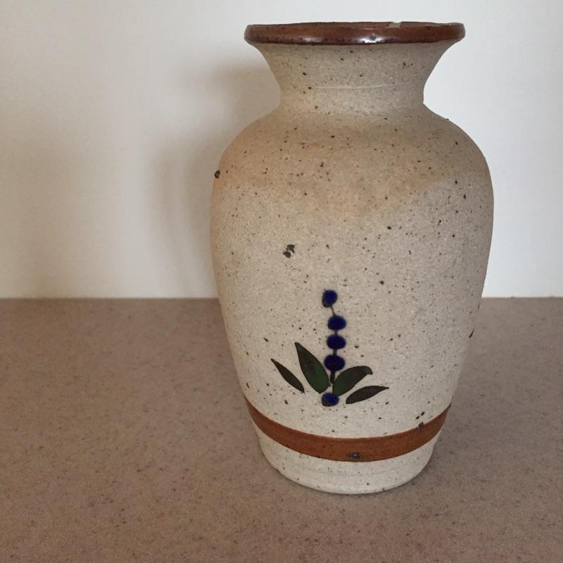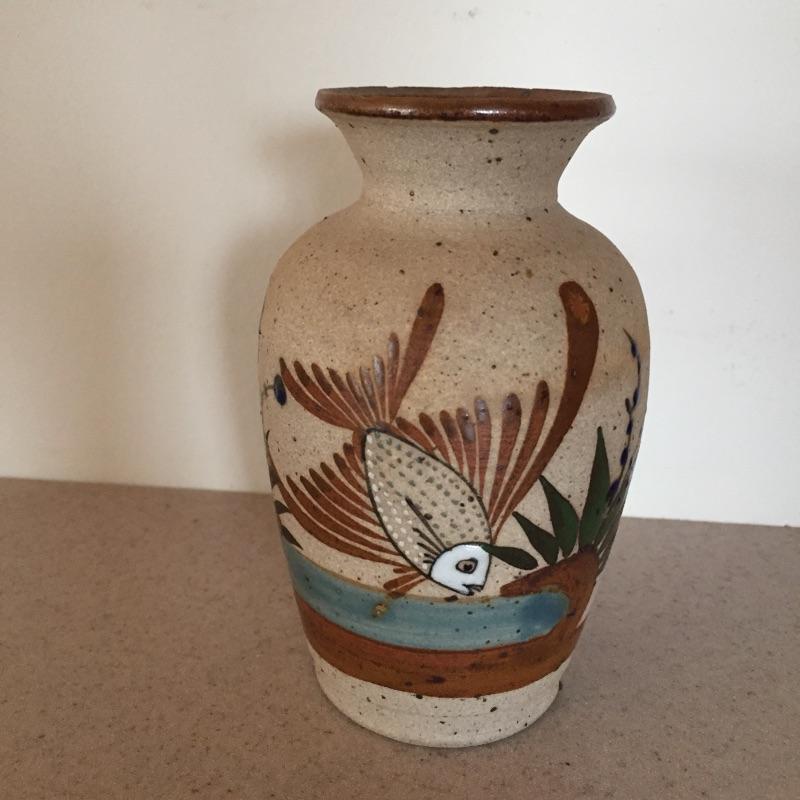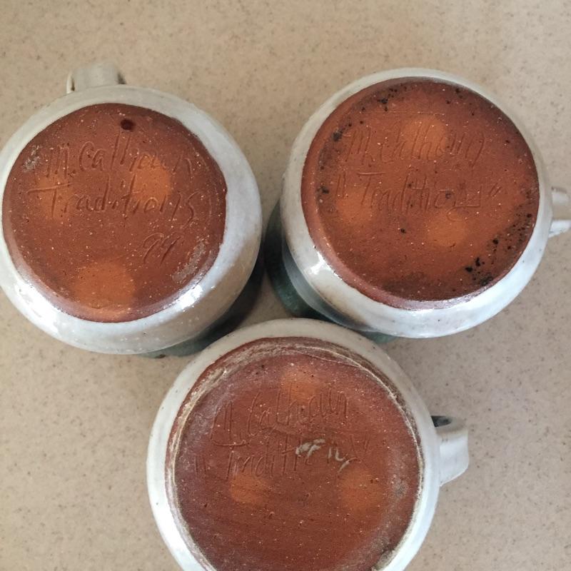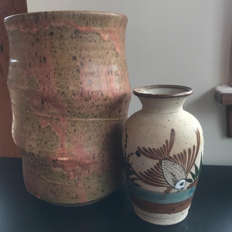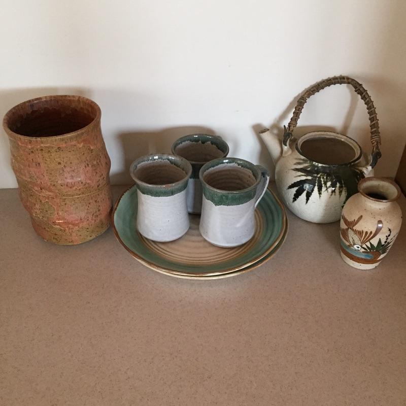 Delightful collection of pottery includes three mugs , pair of plates , pitcher and more. Get your collection started or add to it. One mug has chip - see pictures. Largest vase measures 8” tall x 5.5” D.
