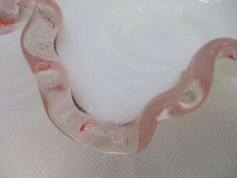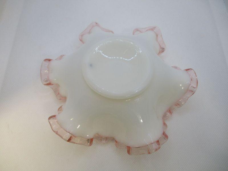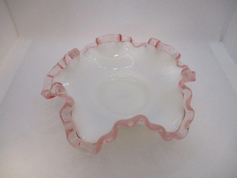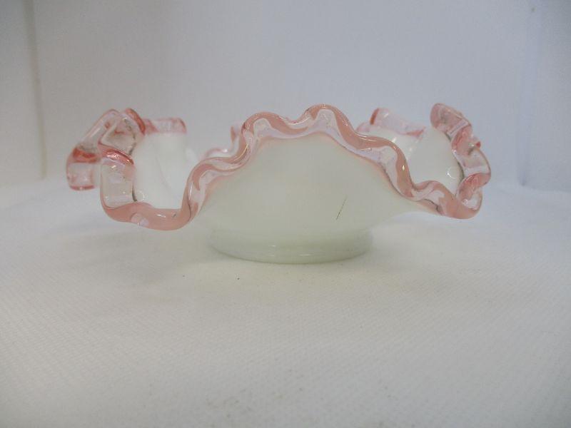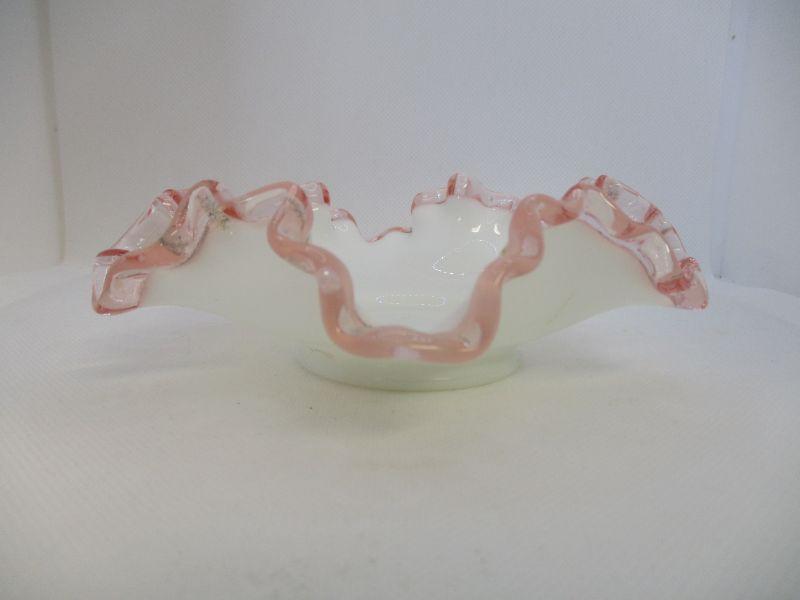 This is a pretty dish that may be Fenton. It's not marked and that could be because that this was made during the paper lable period of Fenton. If it is Fenton, I believe that it was made between 1944-1947. The bowl is about 6.25" at the widest and in excellent condition.