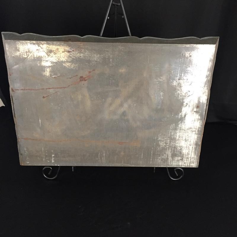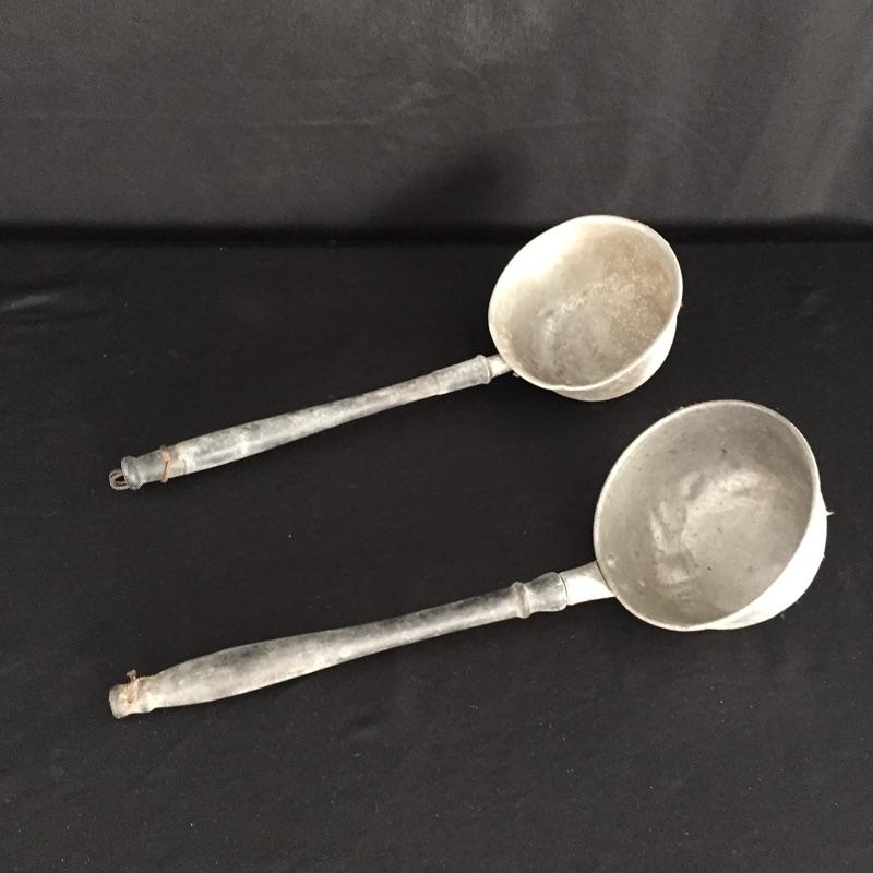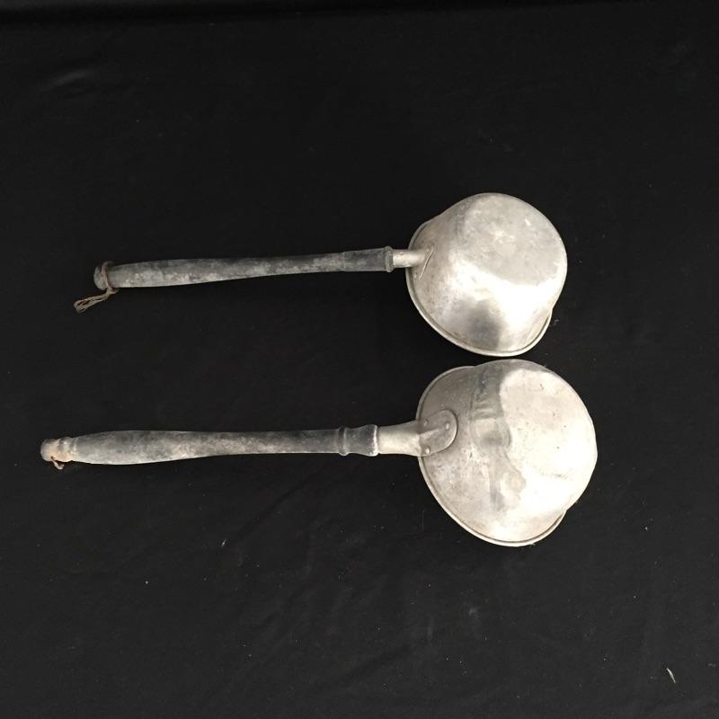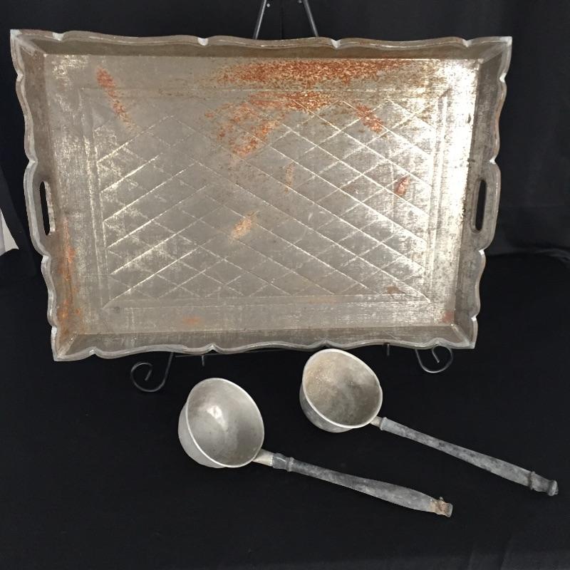 Rustic metal tray and a pair of metal ladles with wooden handles. Use the tray for drinks or just decor. Tray measures 25” x 17” and has surface rust - See pictures.