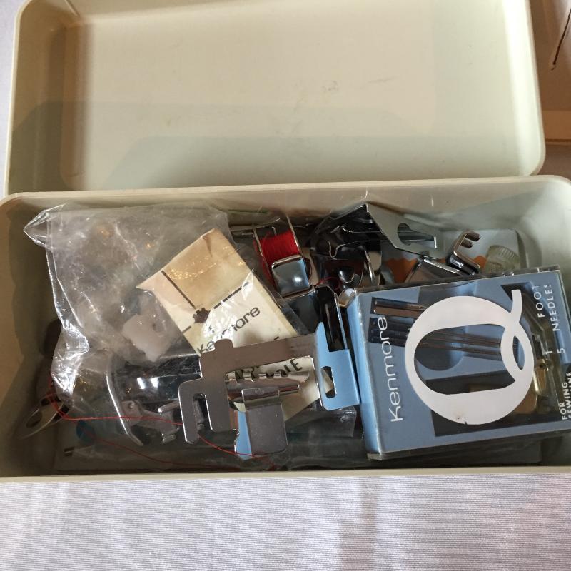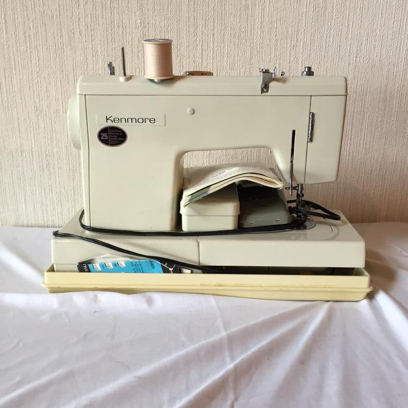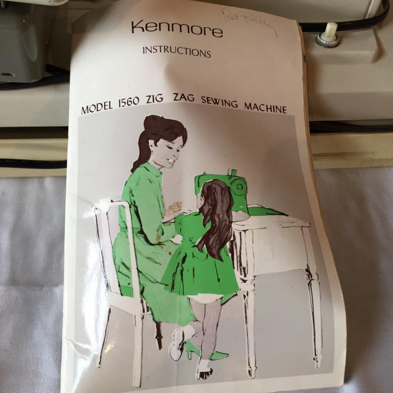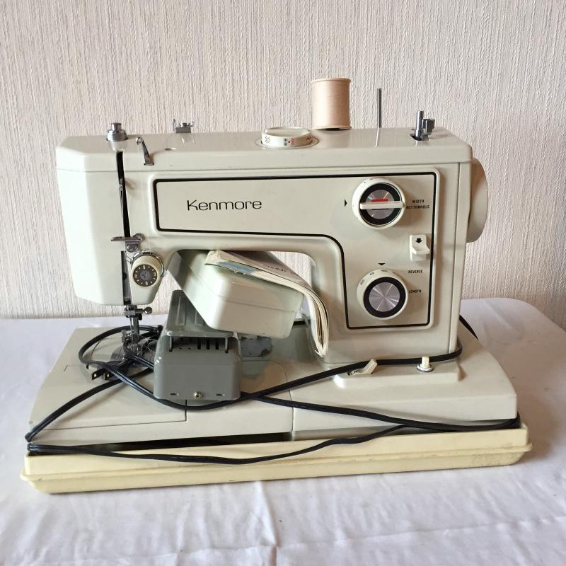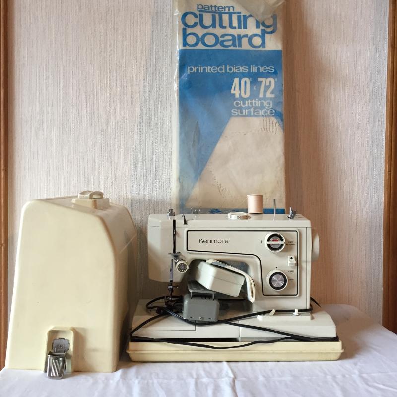 Sears Sewing Machine model 1560 with cover case and a cutting board. Get your sewing groove on. Sewing Machine Measures 13.5” x 7.5” x 16.5”.