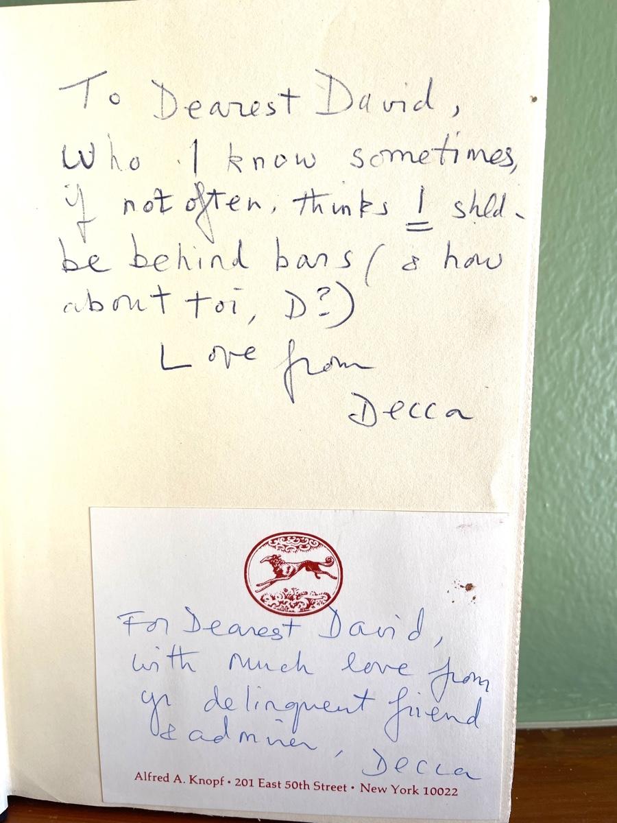 LOT 7 - SIGNED Jessica Mitford - Kind & Unusual Punishment - The Prison Business. Signed with personal inscription by Jessica Mitford using her nickname "Decca". This book is in acceptable condition with some light marks and edge tears on covers. A few pages have texts that is underlined in pen. This book was part of the David-Pleydell-Bouverie library at Bouverie Ranch in Glen Ellen. This item can be viewed at our Green + Cate Showroom in Sebastopol from July 15th - July 18th between the hours of 9am-5pm. For the benefit of the Bouverie Preserve of Audubon Canyon Ranch