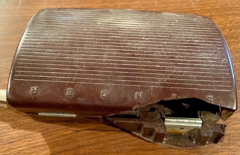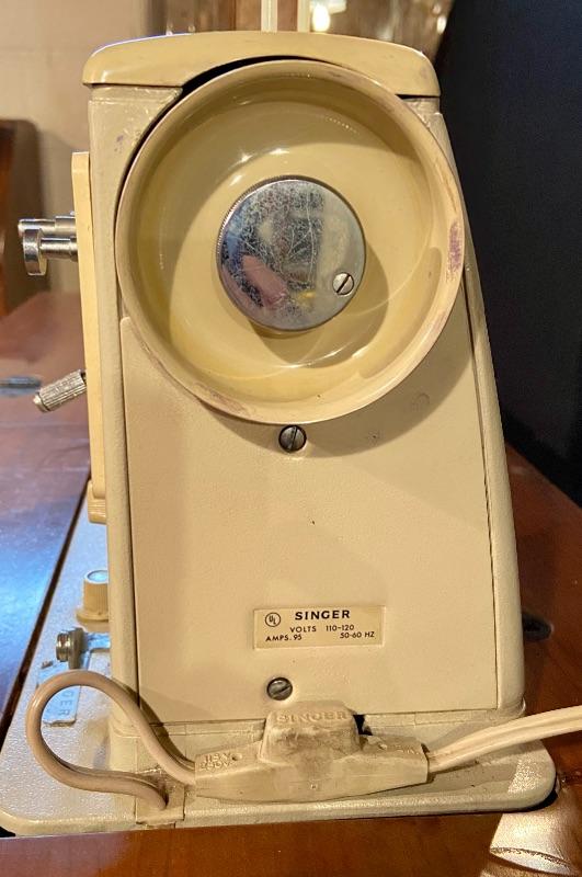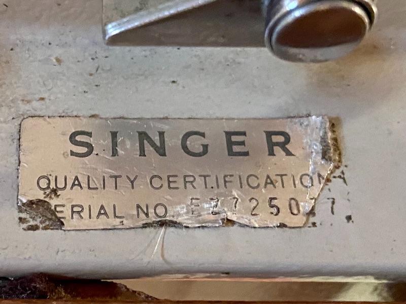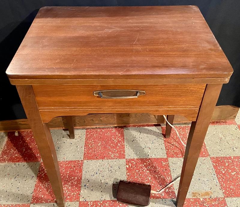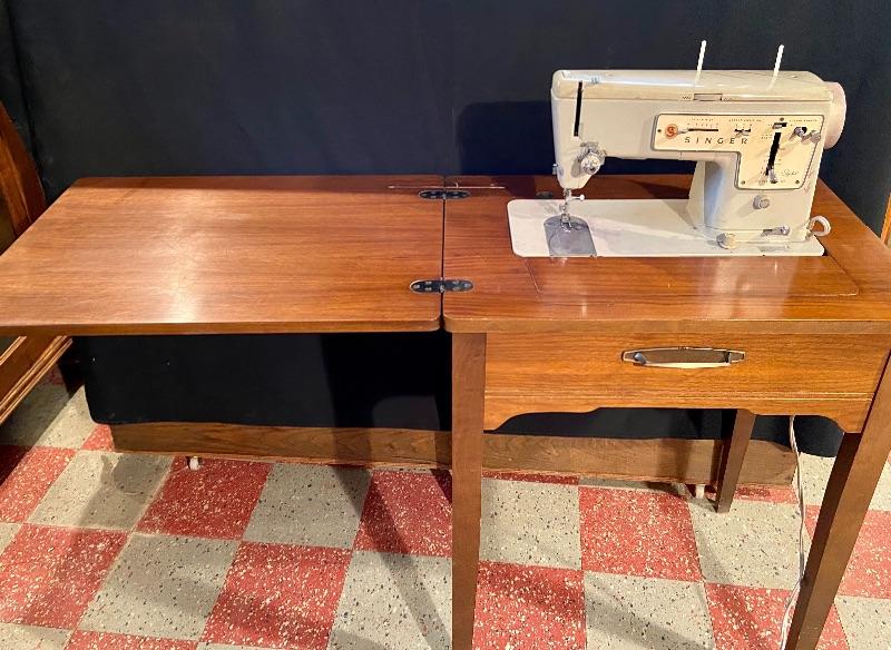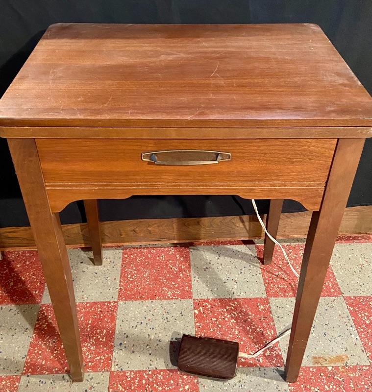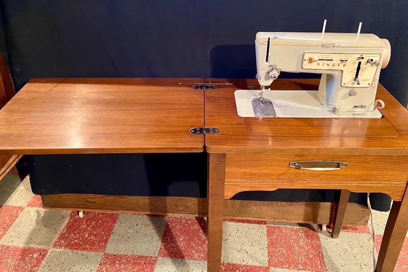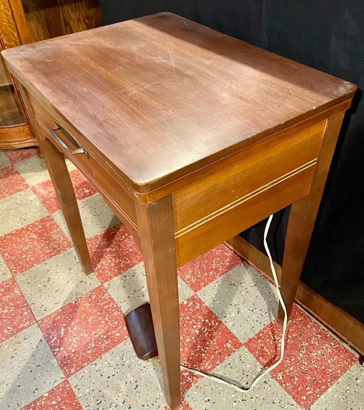 Antique Singer sewing machine that folds away to a side table. Dimensions 24Lx17.75Wx30H & opens to 47.75Lx17.75Wx30H. MHW