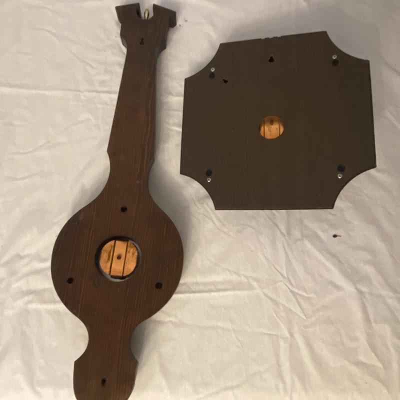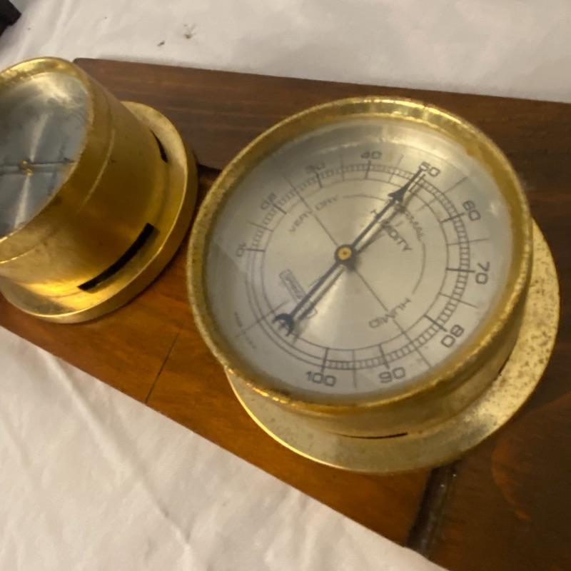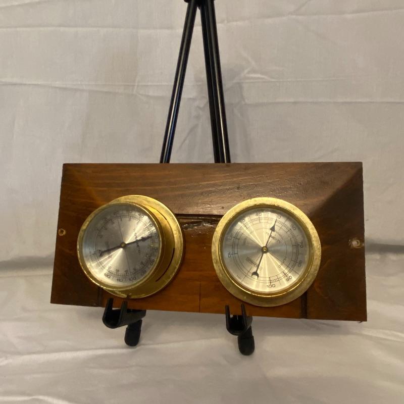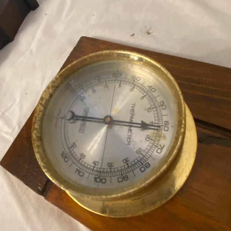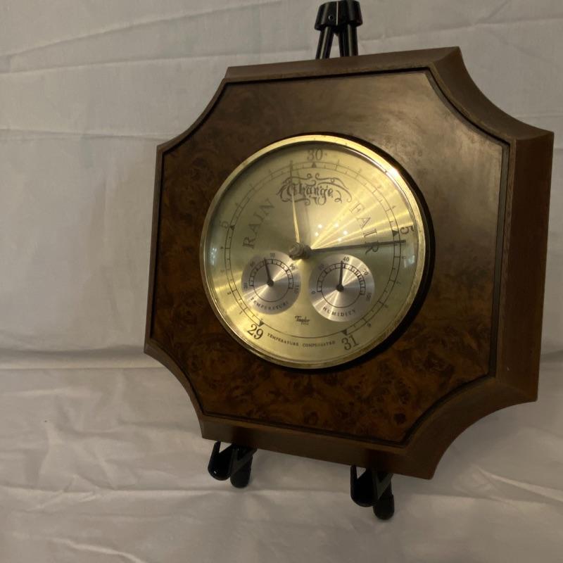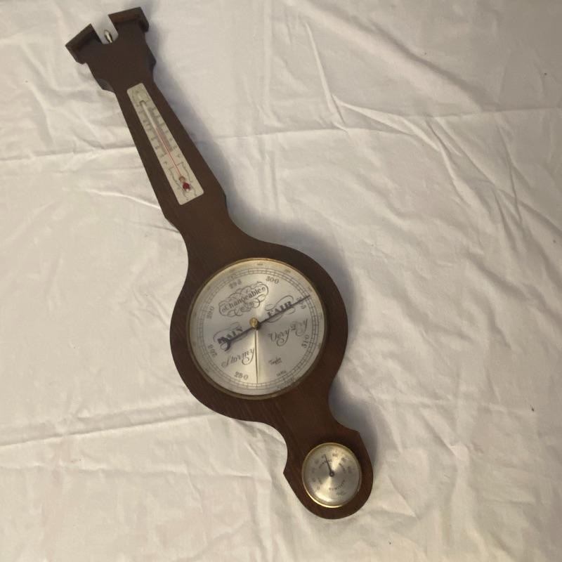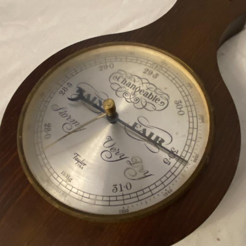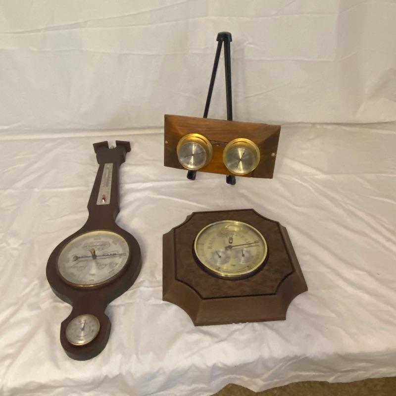 Lot includes 3 Barometers. A Taylor Rain Fair barometer and thermometer made in the USA, on solid wood base, 26” long. Taylor Rain Fair barometer on plastic wood-imitation base. 11.5” x 11.5”. Homemade barometer attached to 11.5” x 5.5” stained wood from the house. Shipping available.