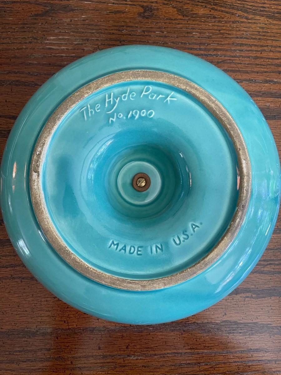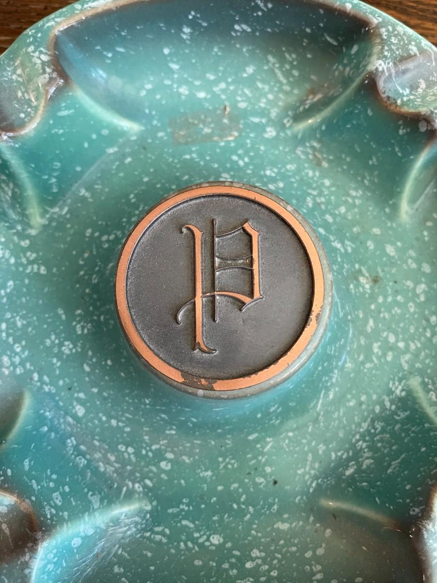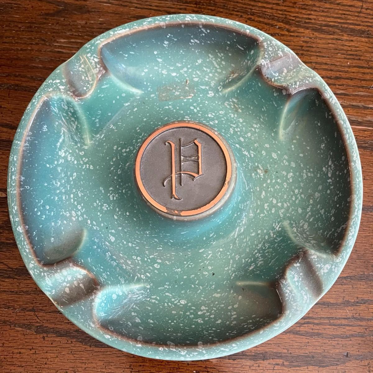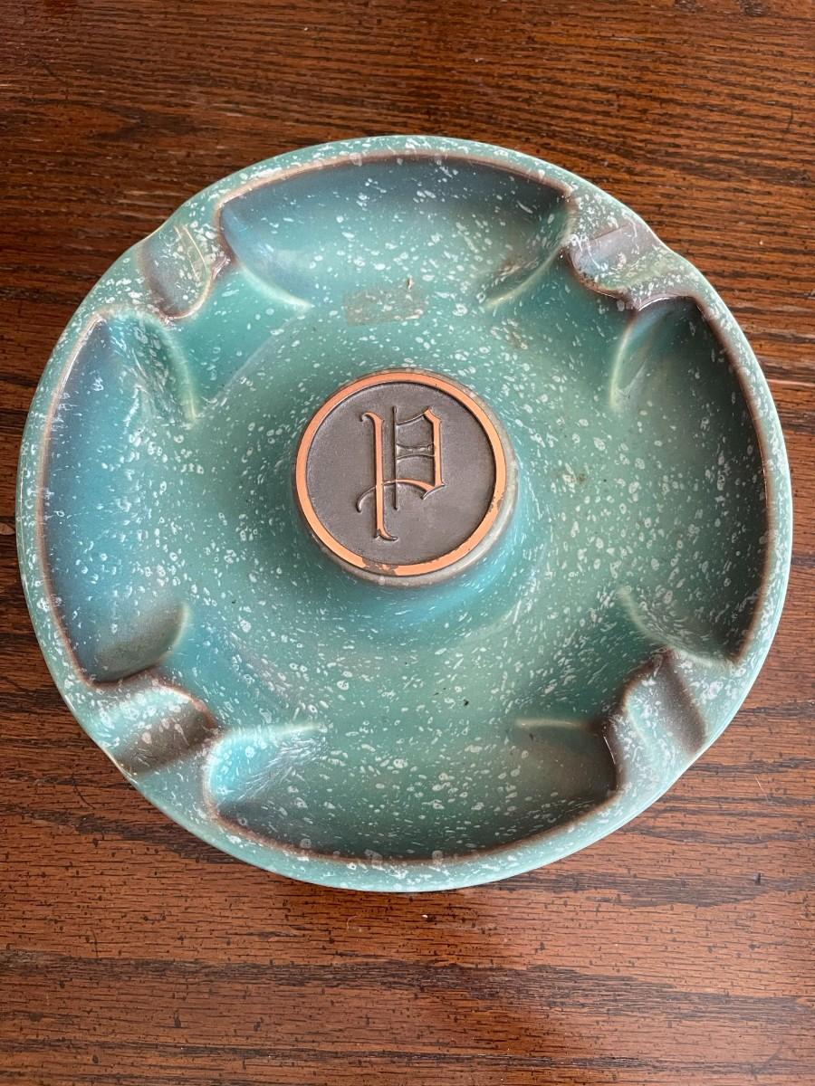 Vintage Roseville Pottery, The Hyde Park, No. 1900, blue/green with white speckling, Round Ashtray, "P" Monogram medallion, Made in the USA. Thick heavy pottery.