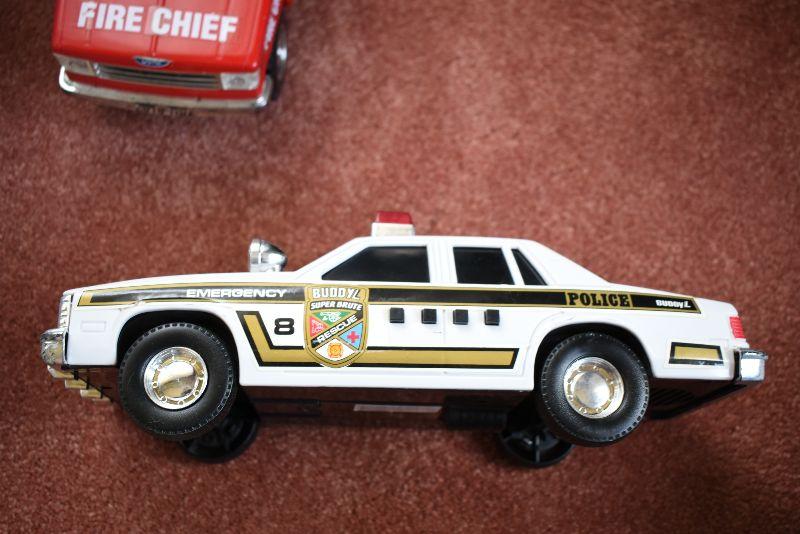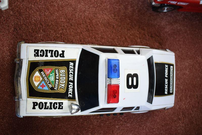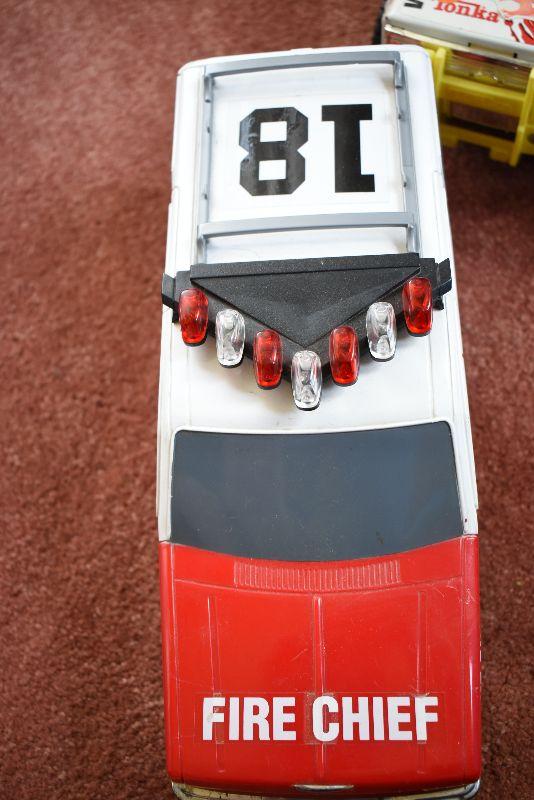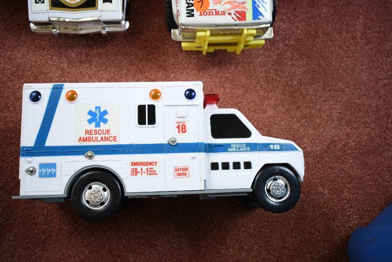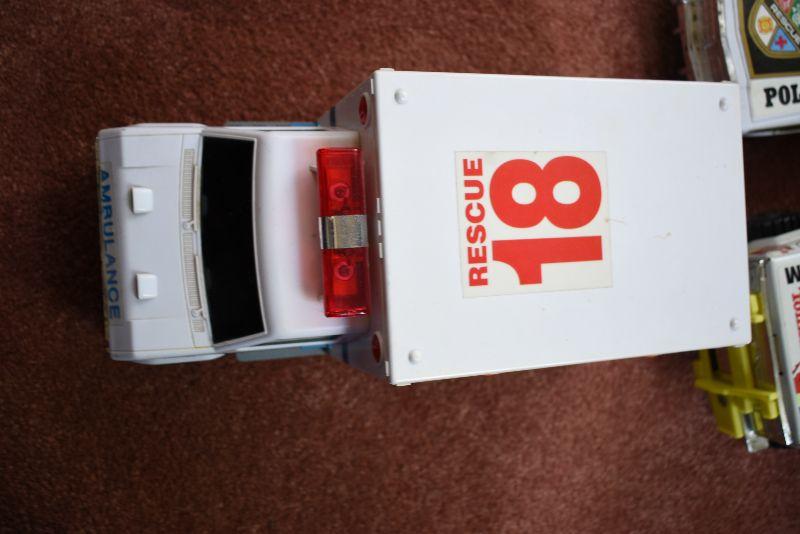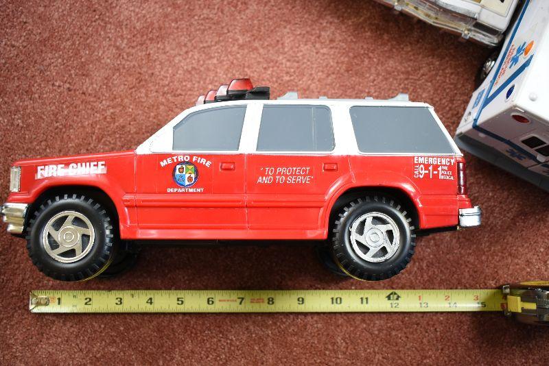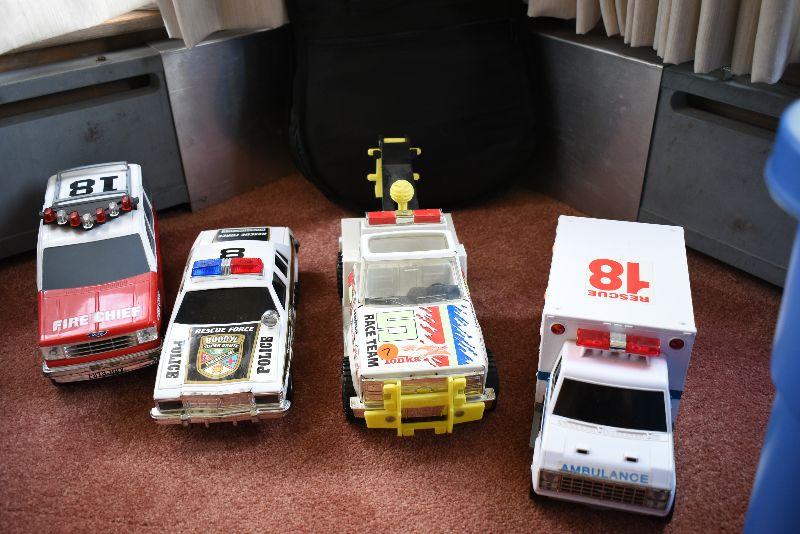 Tow truck, police car, fire chief and ambulance.
