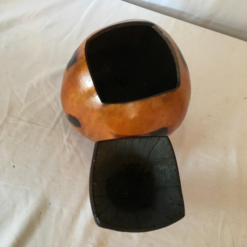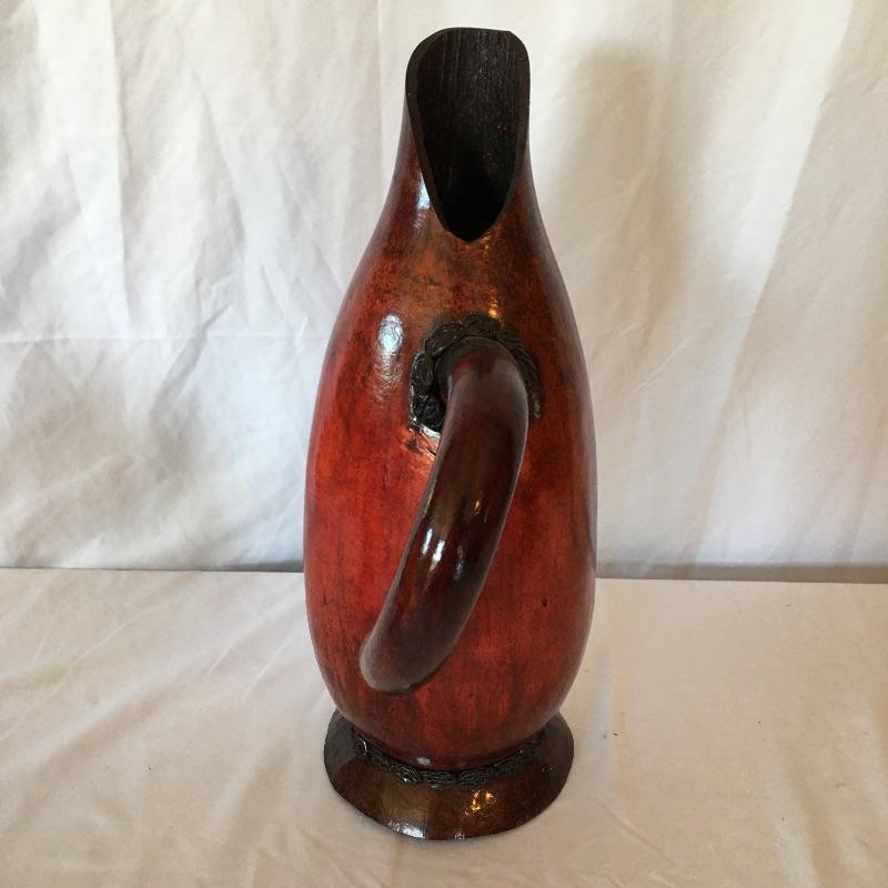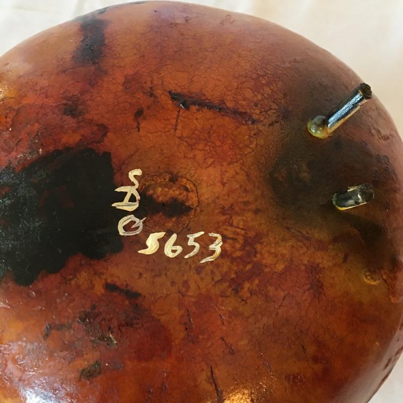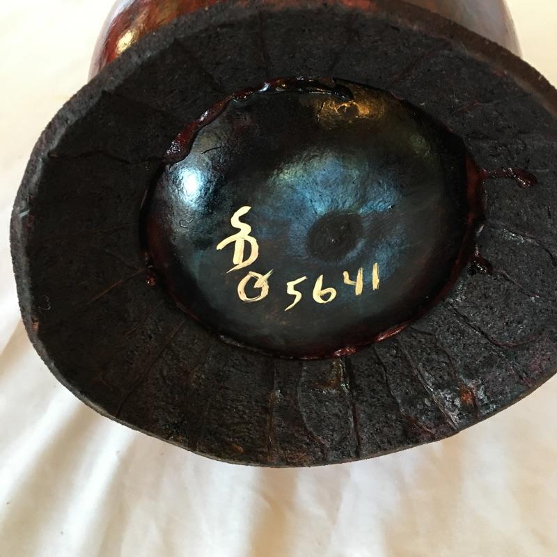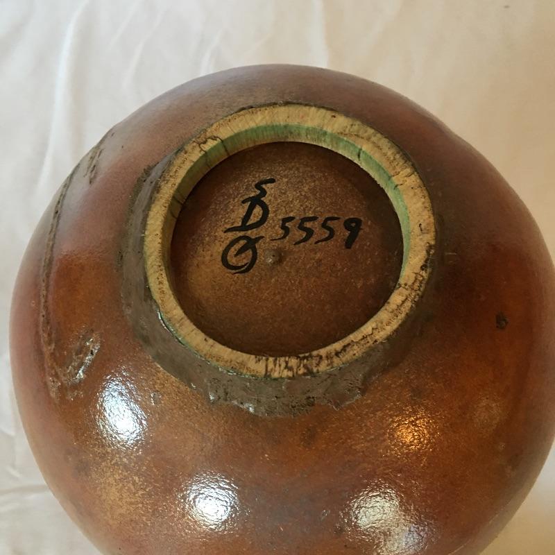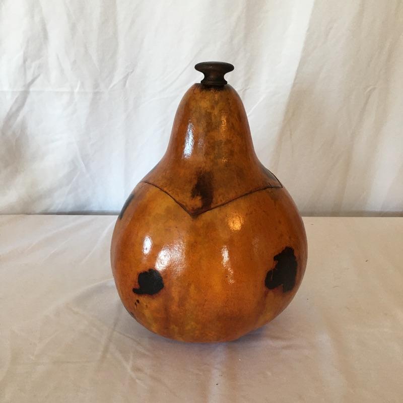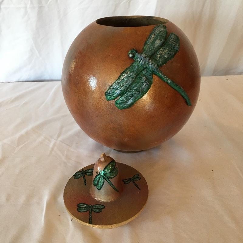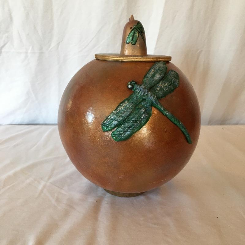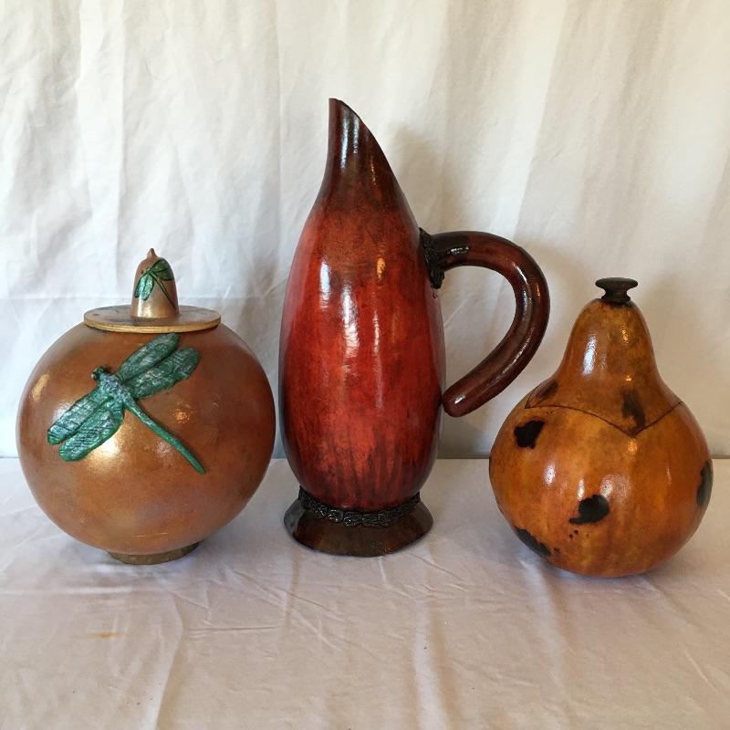 This trio of SDQ gourds by Susan Davis includes pitcher, gourd with gourd lid and a gourd with a wooden lid and dragonfly decorations. Tallest gourd measures 5.5” x 9.5” x 17.5”.