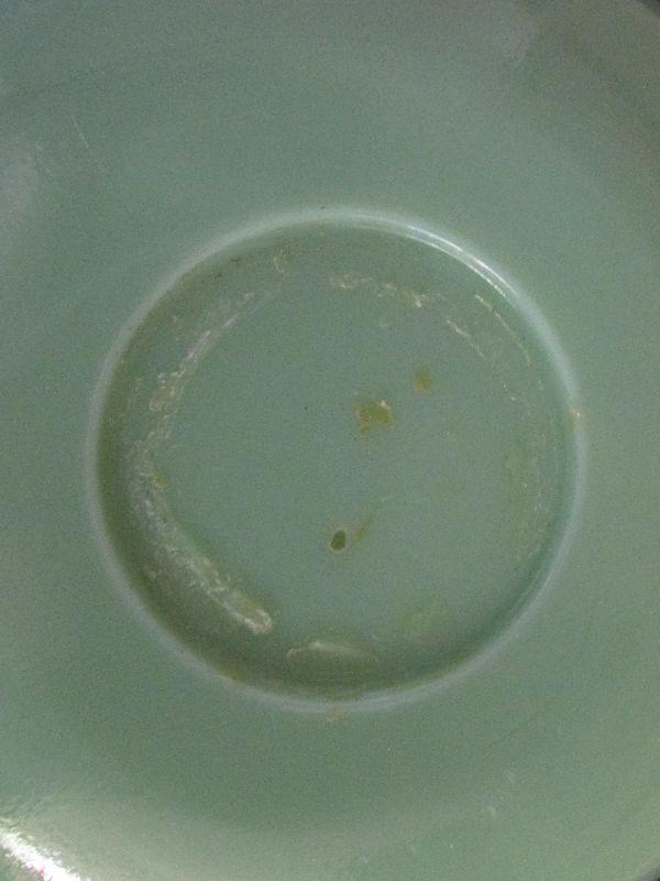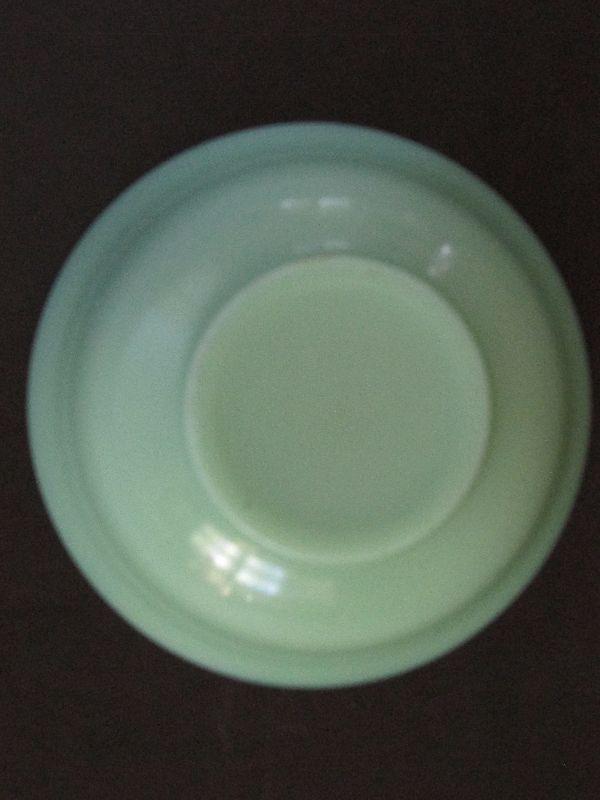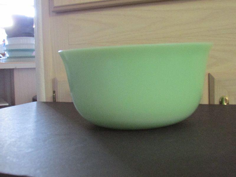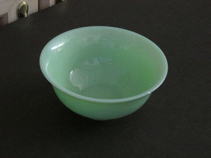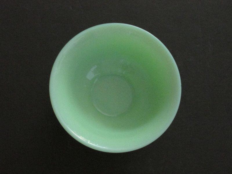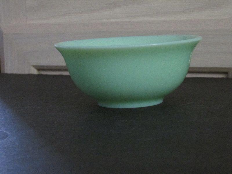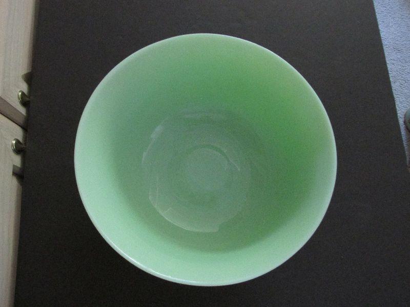 Two jadeite mixing bowls of different sizes. Unknown makers not marked. Small bowl is 2.25" tall and diameter of 5.5". Large bowl is 5" tall and diameter of 9.75". Small bowl has small chip on rim shown in photo and some wear on bottom rim. Larger bowl has small indented circle on botton with glue like substance stuck to it.