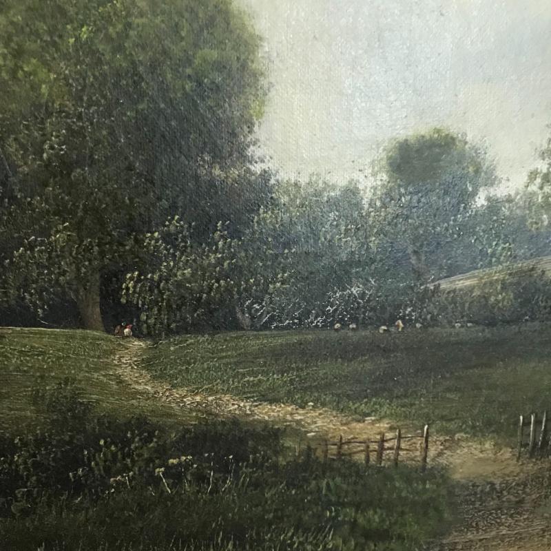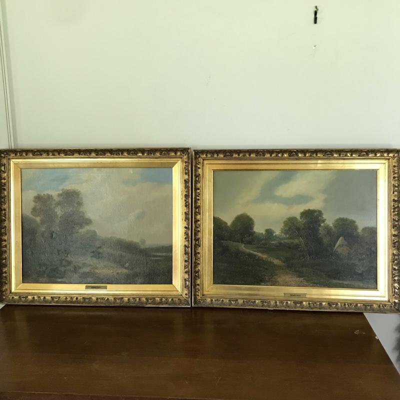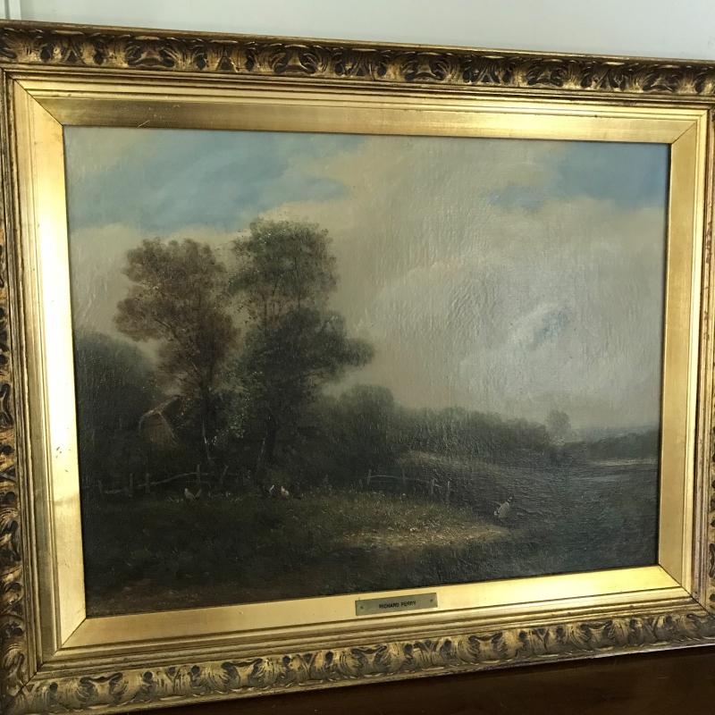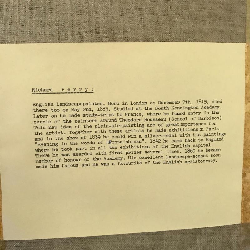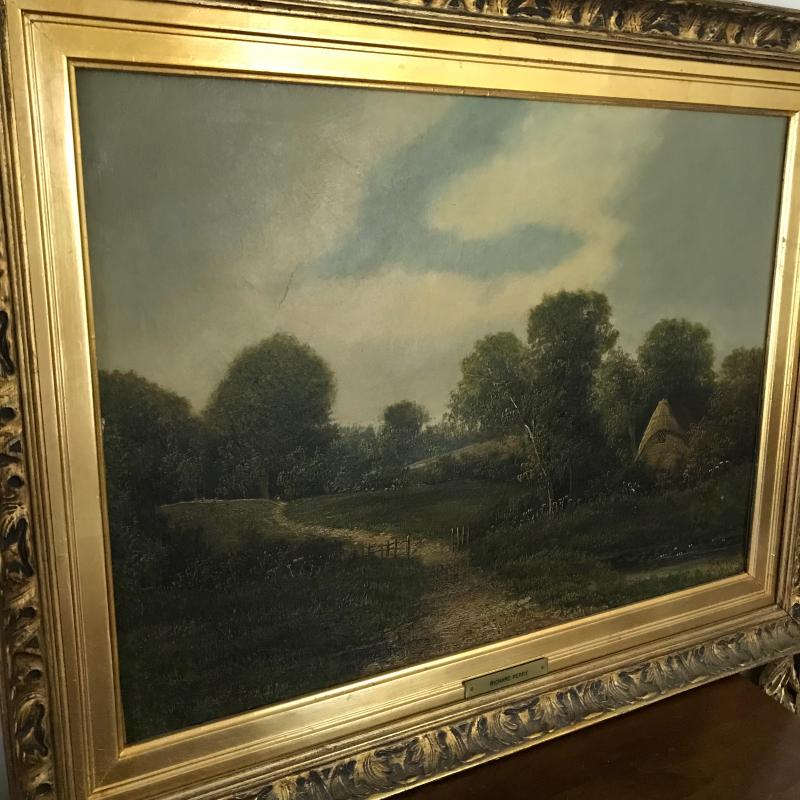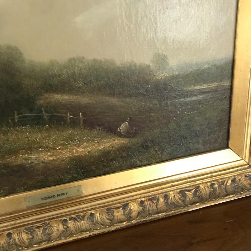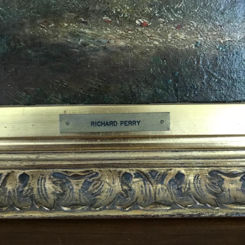 Two serene scenes painted on canvas by Richard Perry (1815-1883). Both measure approx. 24.5” x 19.5”. Frames in good condition with minimal blemishes, appears to be an oil painting, see photos. Shipping is available, please call UPS prior to bidding for a quote as art is costly to ship.