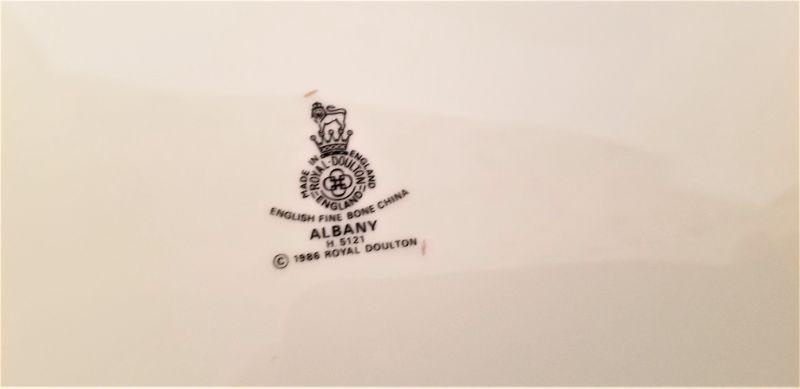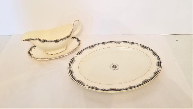 Royal Doulton China in the "Albany" pattern, made 1986 - large platter and gravy boat with underplate. Platter measures 13.5", gravy boat is 9" x 4". Good condition.