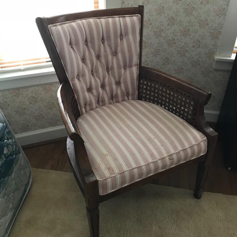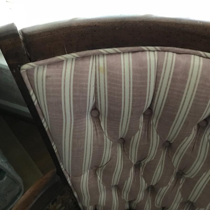 This comfy upholstered chair is sturdy with some stains on the fabric. See pics. Approx. 30”l x 26”w x 33”h. Lot is available for local pick up in Flat Rock, NC only.