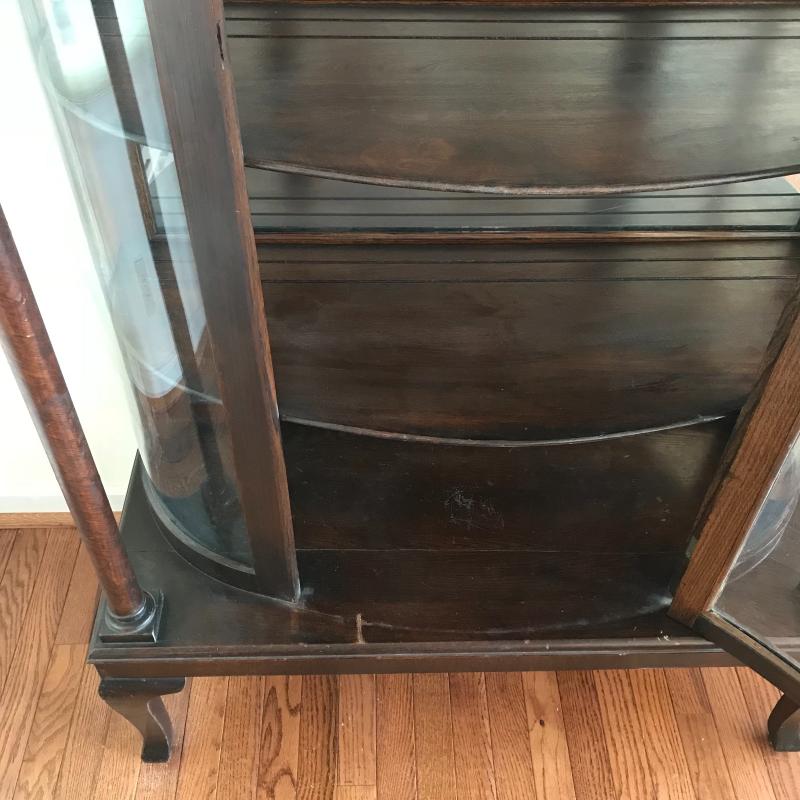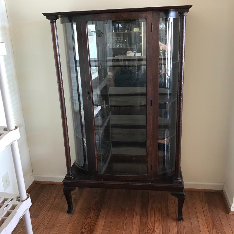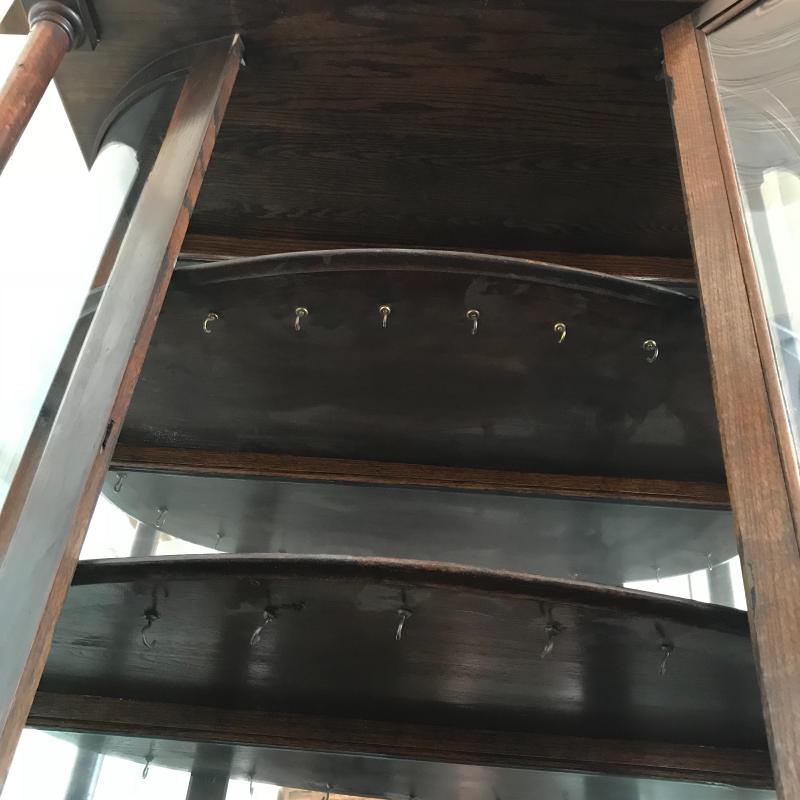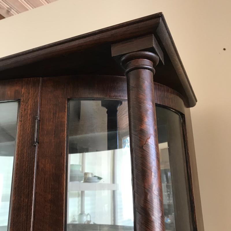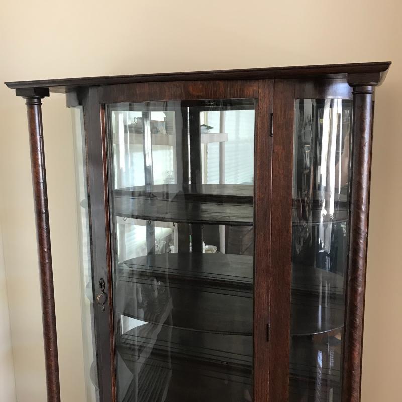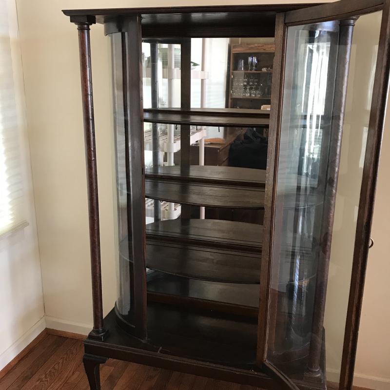 Gorgeous antique glass and wood display cabinet. Curved glass sides. Two pillars connecting the rectangular top and base with stunning cherry colored wood grain. The middle shelves include hooks for teacups and mirrored backing is framed by wood on each level. This stellar piece is in great shape, some wear is noted in photos. No shipping.