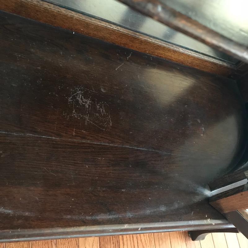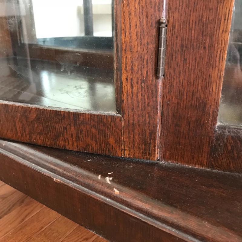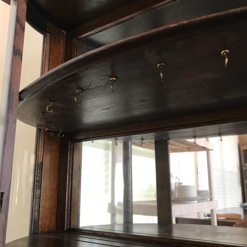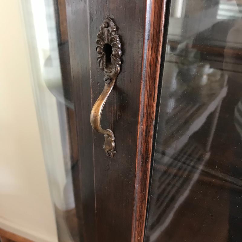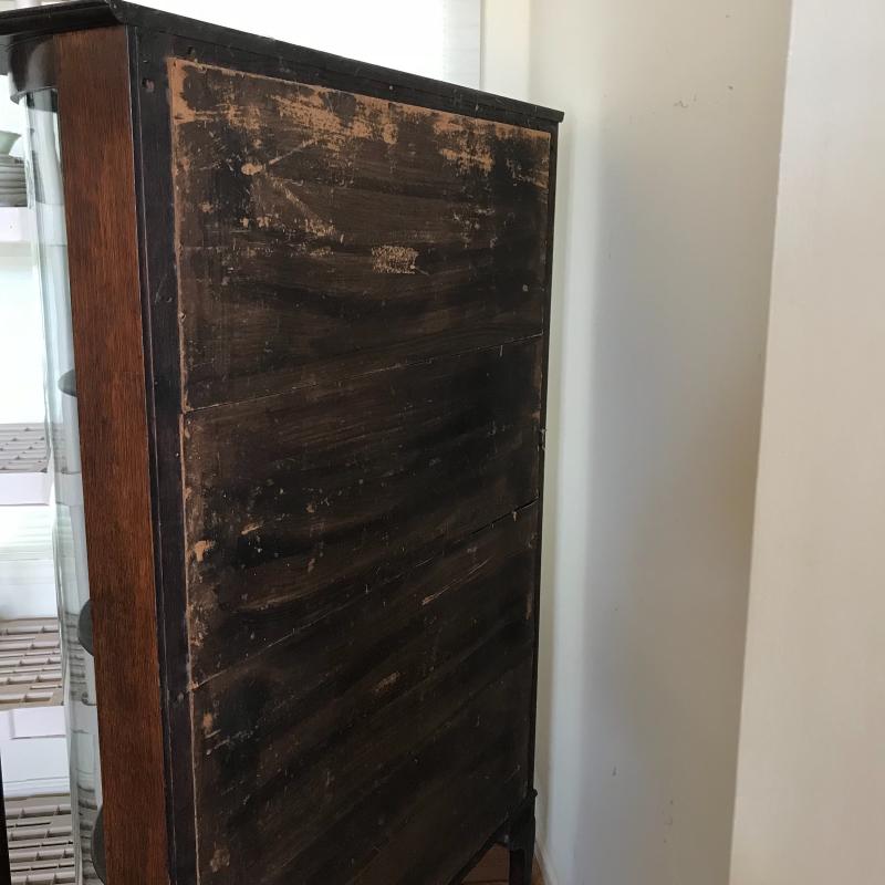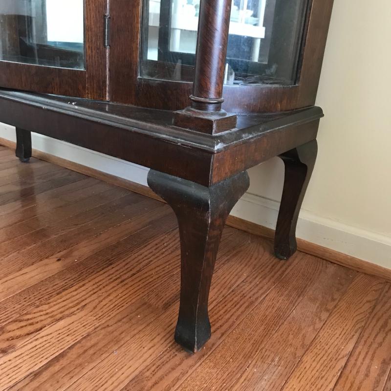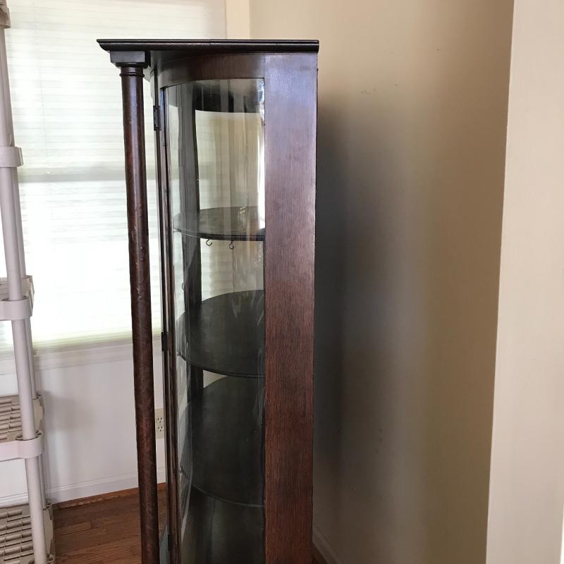 Gorgeous antique glass and wood display cabinet. Curved glass sides. Two pillars connecting the rectangular top and base with stunning cherry colored wood grain. The middle shelves include hooks for teacups and mirrored backing is framed by wood on each level. This stellar piece is in great shape, some wear is noted in photos. No shipping.