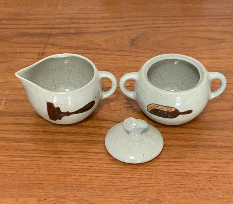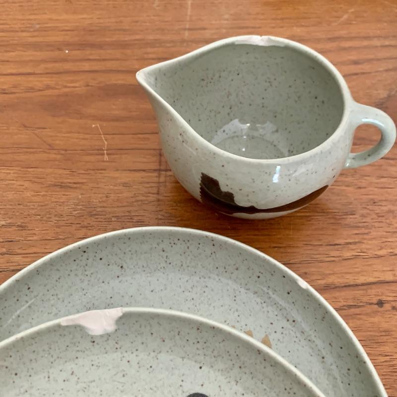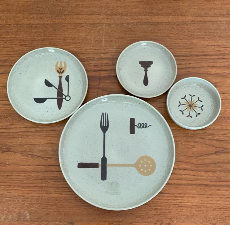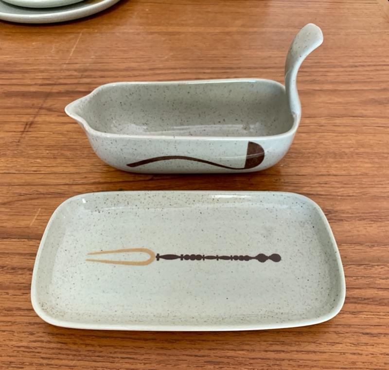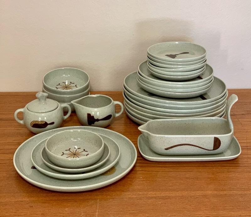 Classic Mid Century Eames Era stoneware dinner set by Winfield China /Pottery Company of Pasadena. Pattern is GOURMET and was produced in the 1950s /60s. Set includes, 8 plates (10 1/8”), 5 salad /bread plates (7 3/8”), 7 dessert plates (5 5/8”), 4 fruit bowls (4 3/4”), covered sugar, open creamer and gravy boat with under plate. This set has been in storage and has seen little use. All are in excellent condition with the exception of 2 salad /bread plates and the creamer which were chipped during a move. Total of 29 pcs.