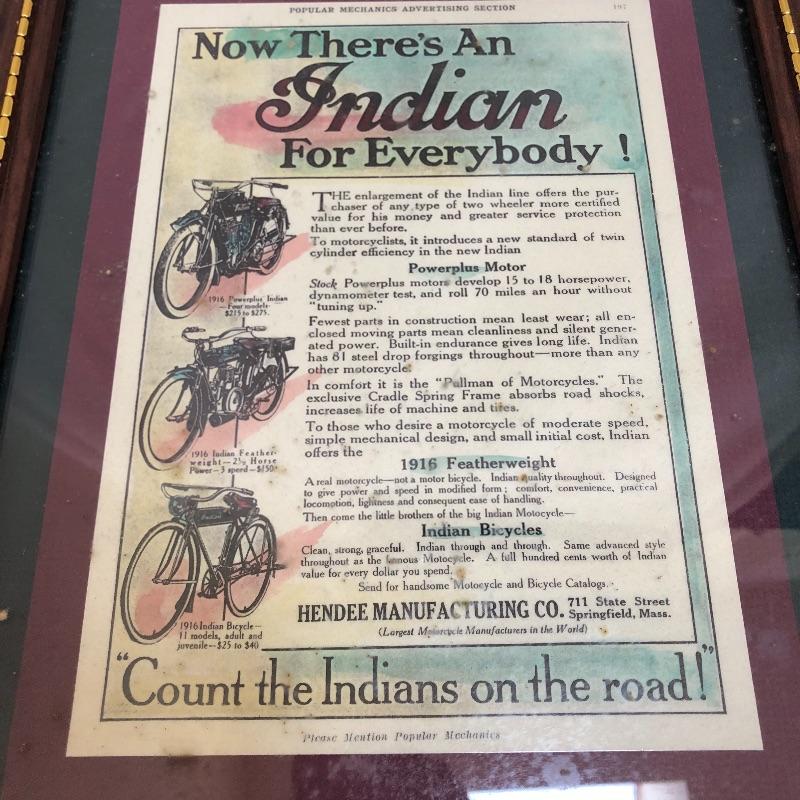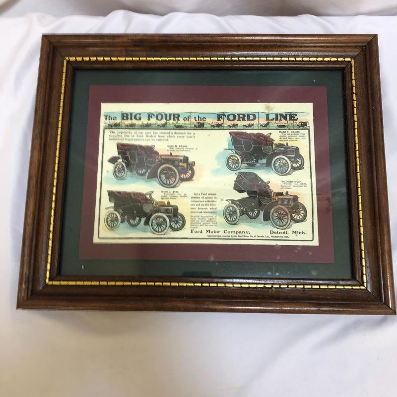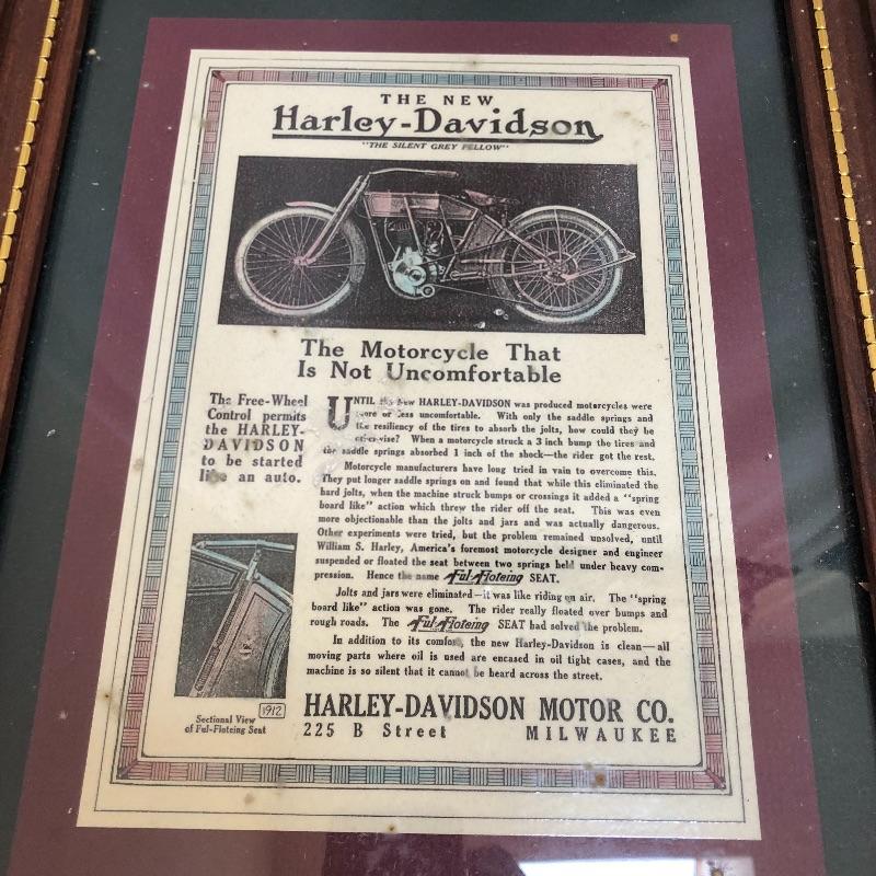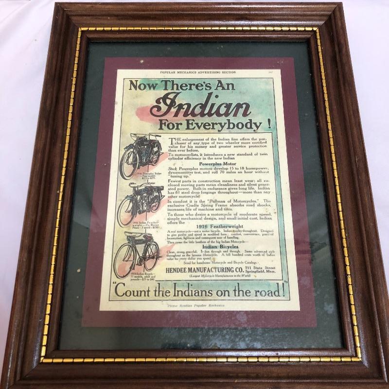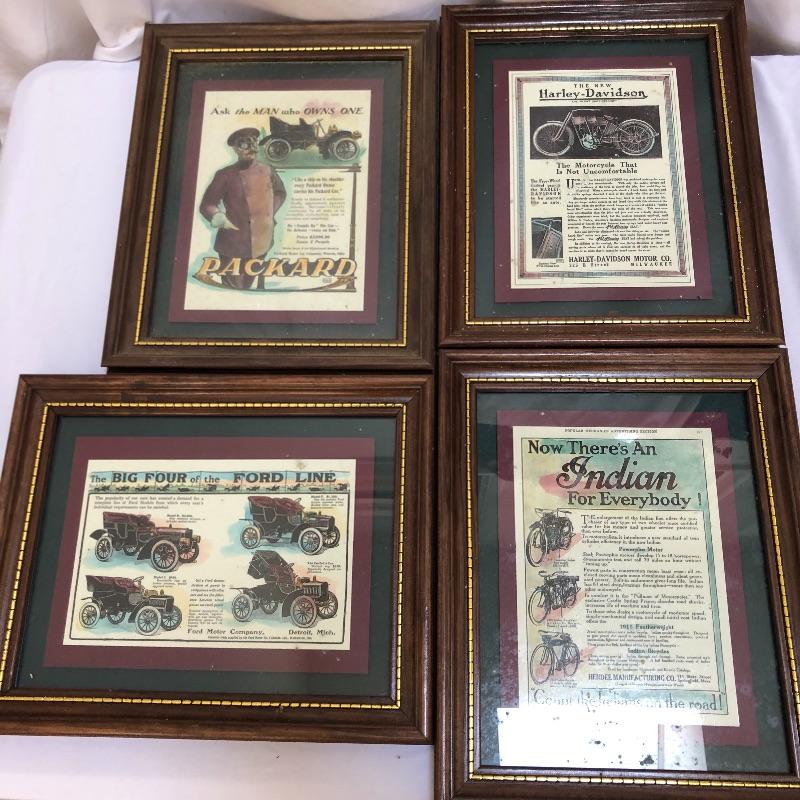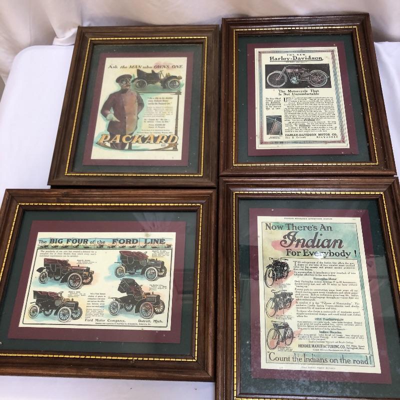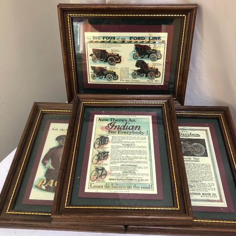 Blue Owl’s Heritage Collection of Old time transportation vehicles is a great find for the gear head. Lot includes four pieces of framed art with Indian, Harley Davidson, Packard and Ford.