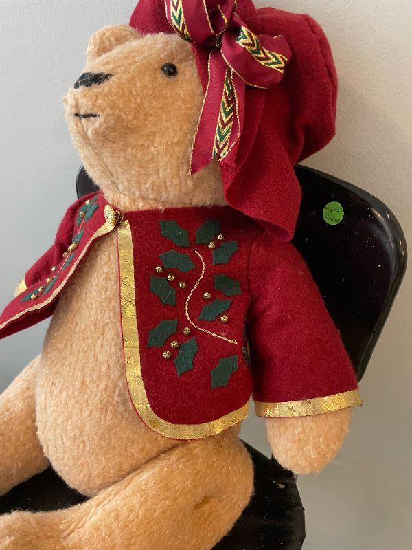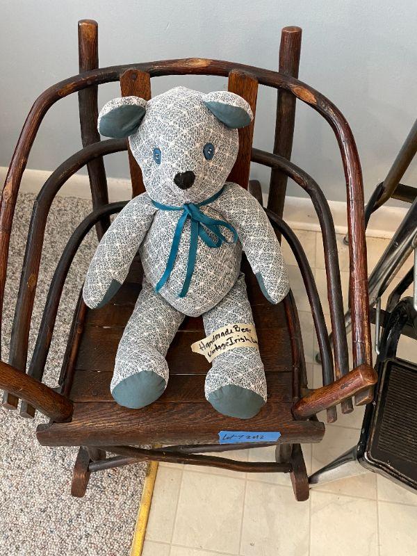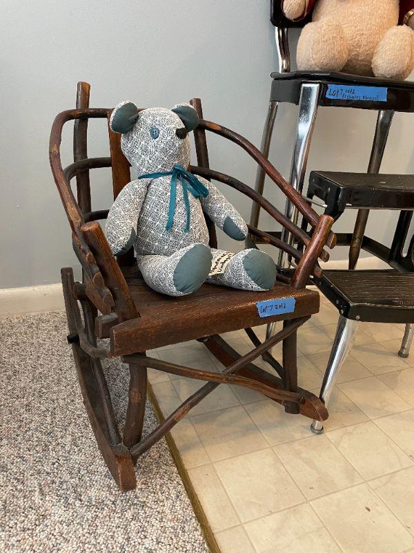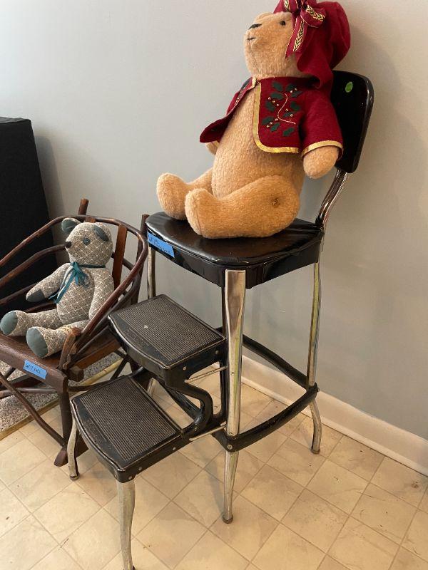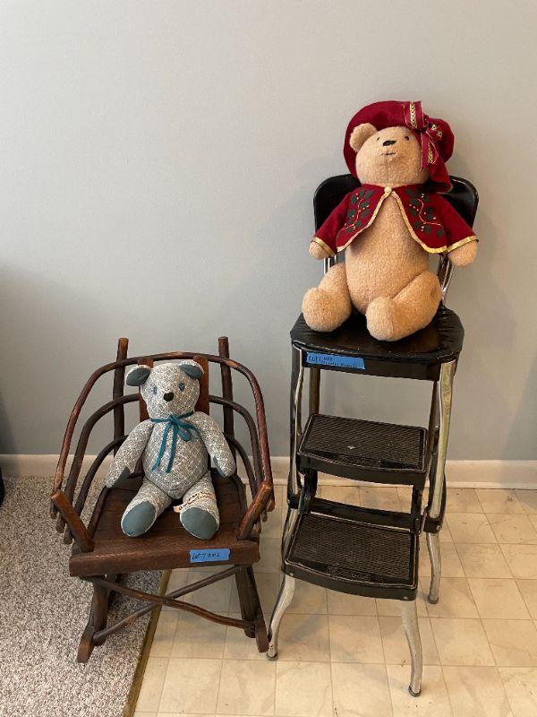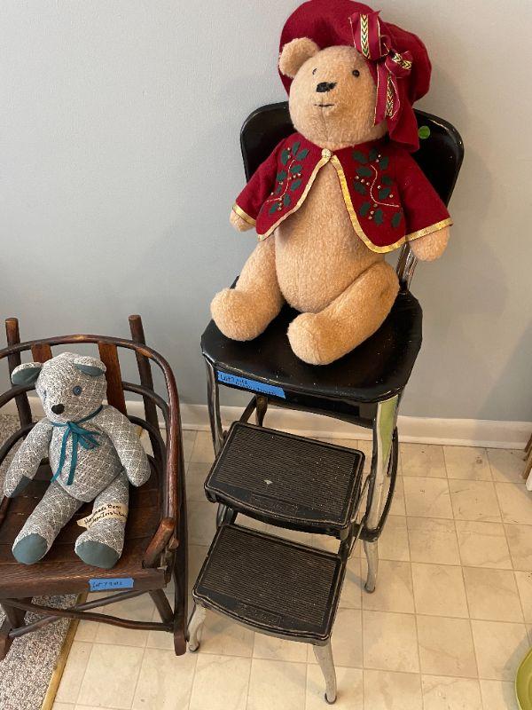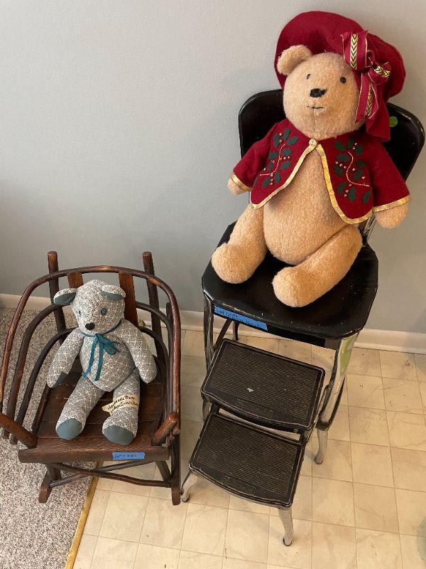 Vintage wooden rocking chair 9 17'' L x 22'' W x 23'' tall), 1950's metaloid step-up chair ( 14'' W x 36'' tall x 21'' L), teddy bear and lace Irish handmade teddy bear.