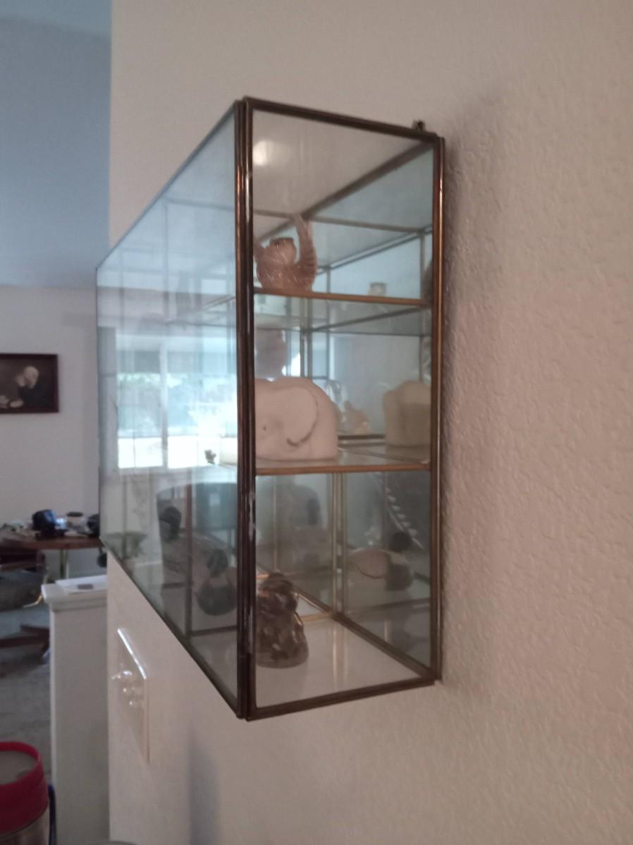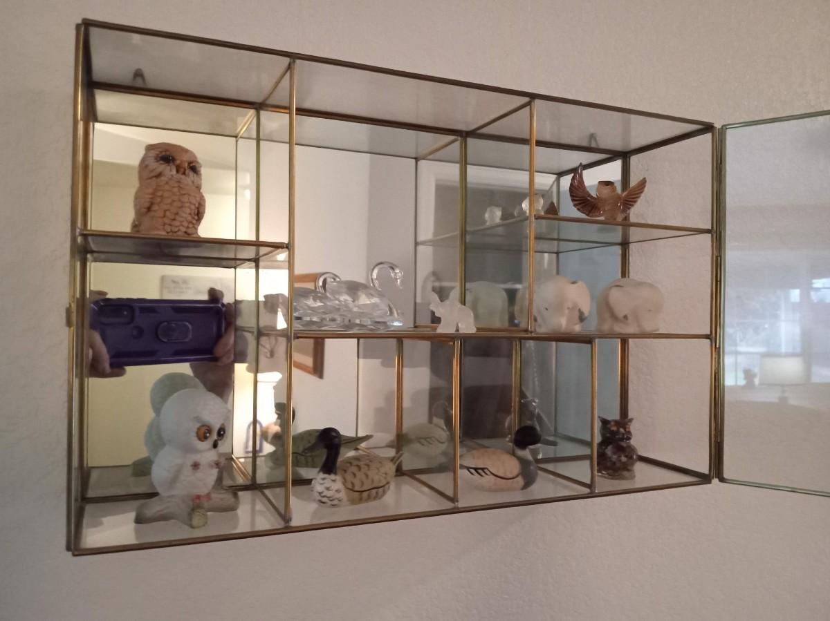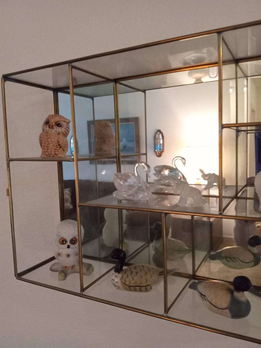 SECTIONED DISPLAY CASE WITH MIRRORED BACK AND SWING OPEN GLASS DOOR IT MEASURES 15" X 9.5" X 4"