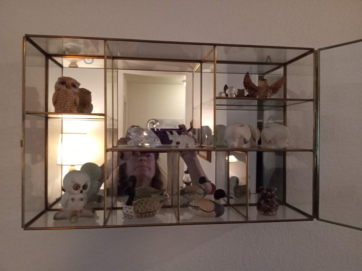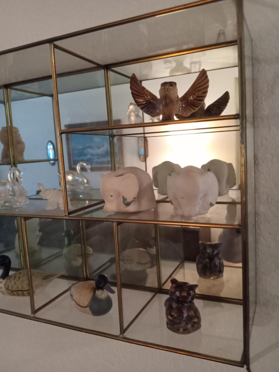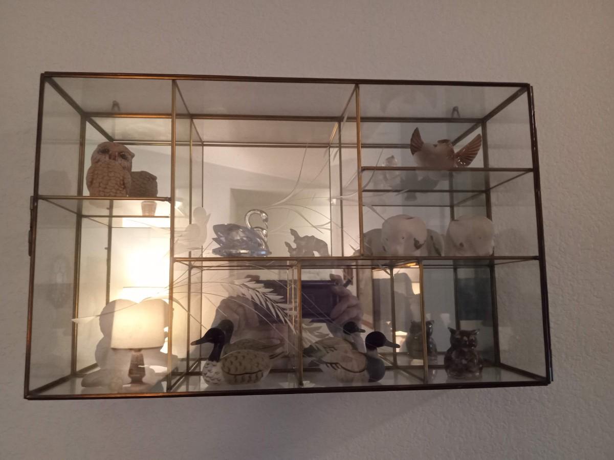 SECTIONED DISPLAY CASE WITH MIRRORED BACK AND SWING OPEN GLASS DOOR IT MEASURES 15" X 9.5" X 4"