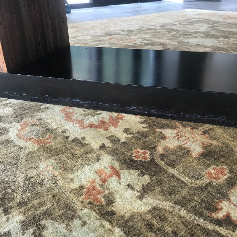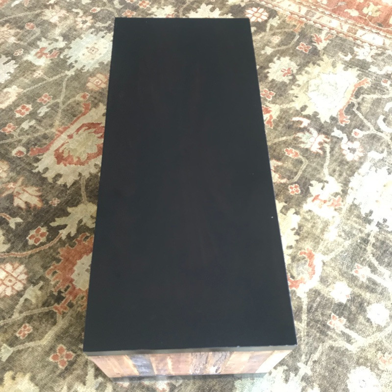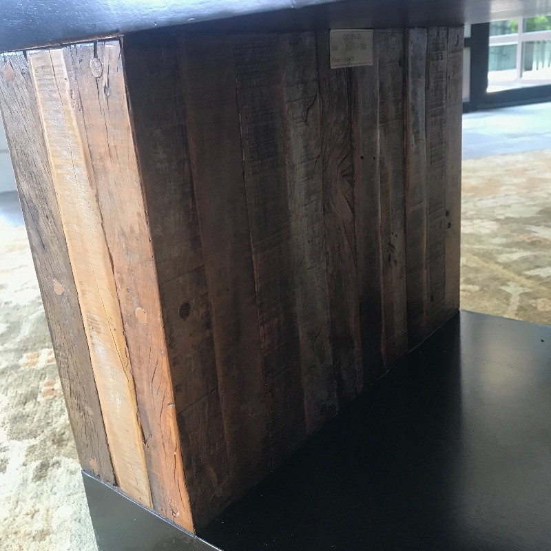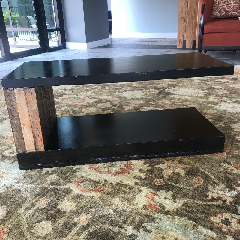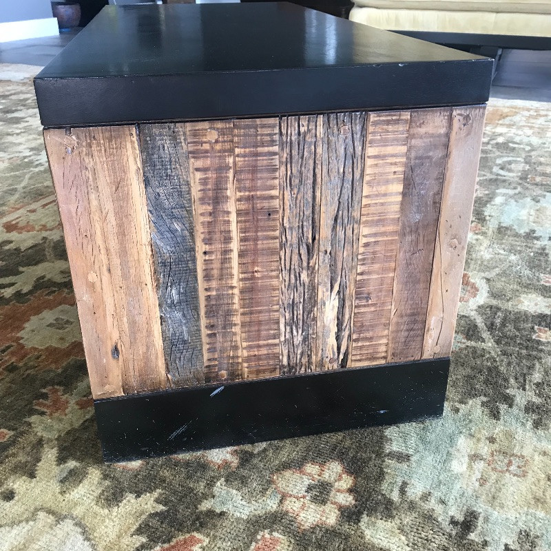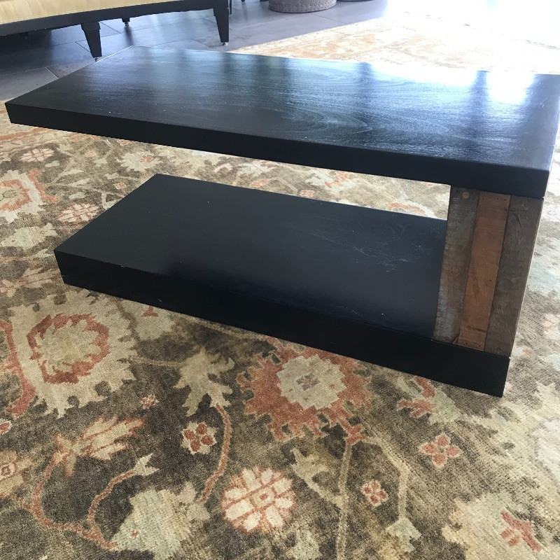 This is a modern solid wood coffee table with raw wood and black laminate to give an earthy yet up to date look. There are a few scuffs at the bottom that might rub out or cover up easily, see images. Measures 41” x17.5” x18”.