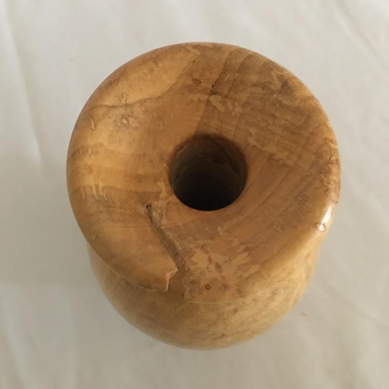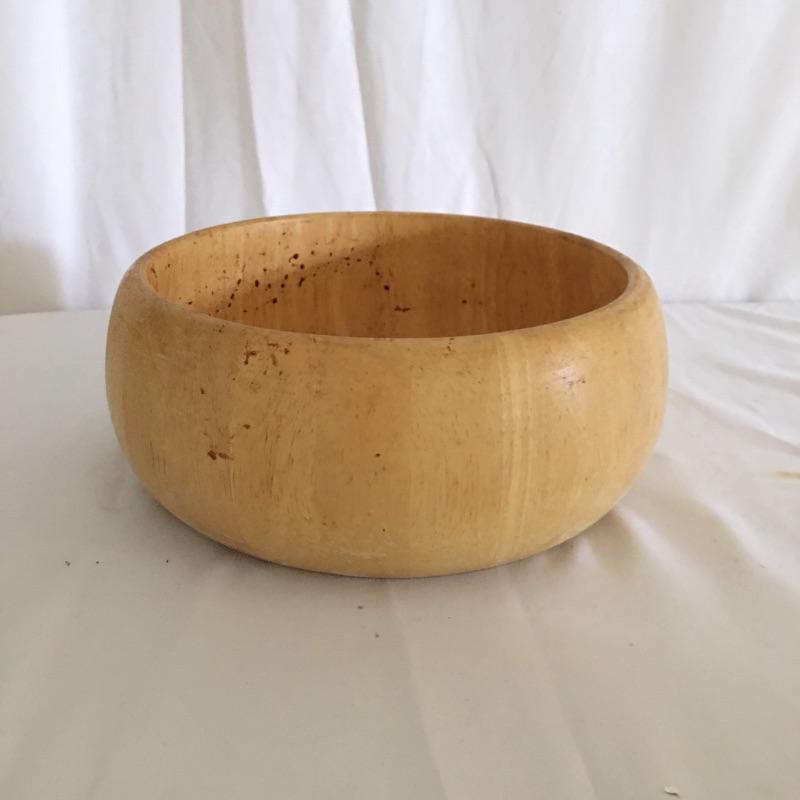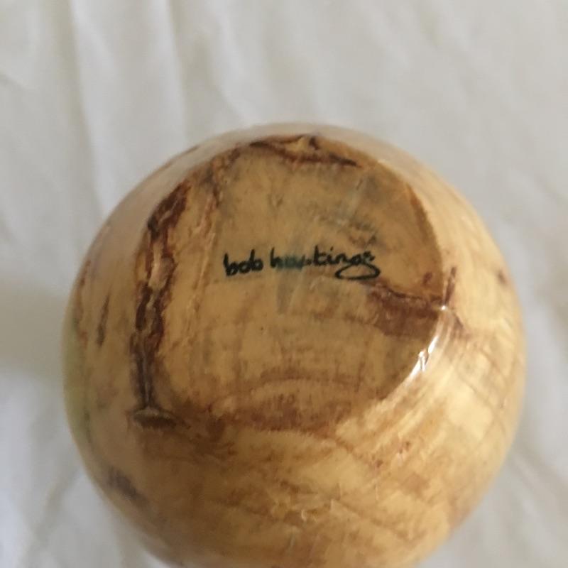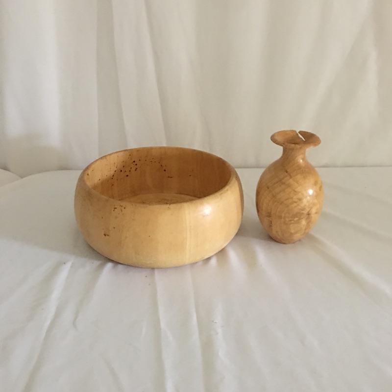 Stunning wooden vase and bowl. Vase is signed by Bob Hastings and has a natural cut in the top that appears to be part of the wood grain. Bring the outdoors inside with this natural pair of decorations. Bowl measures 9”D x 4” tall.