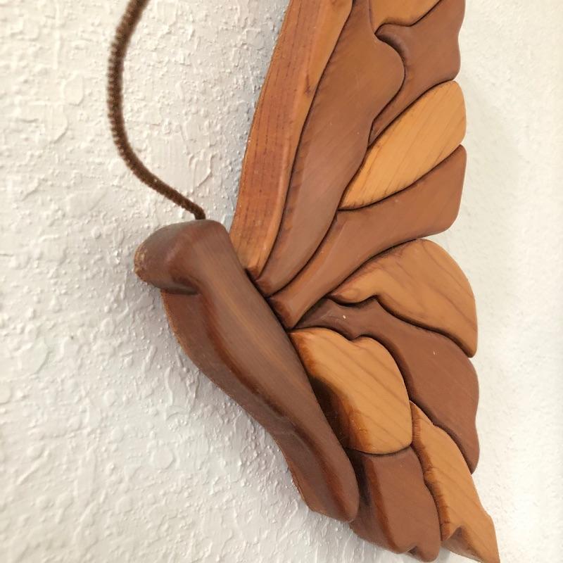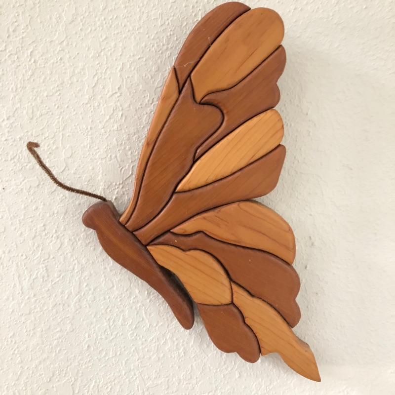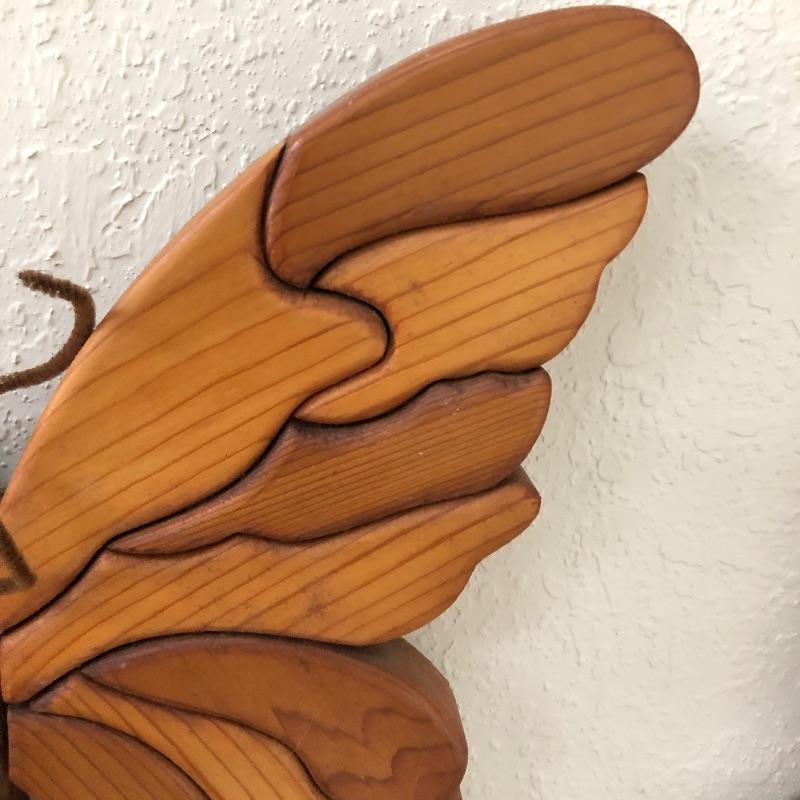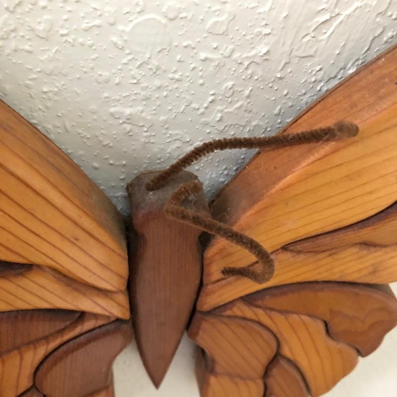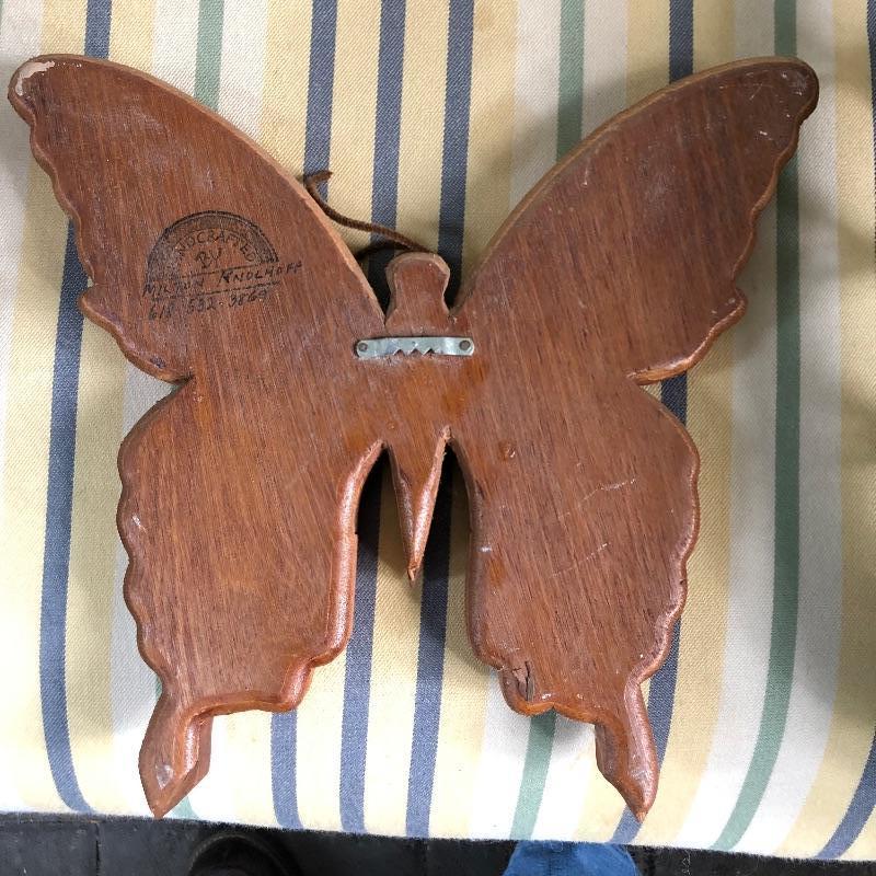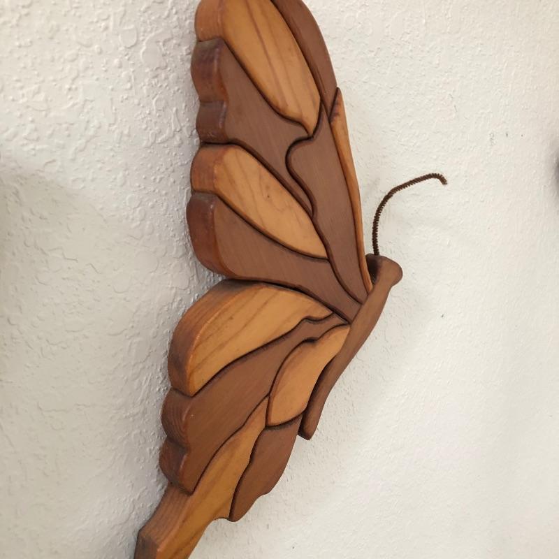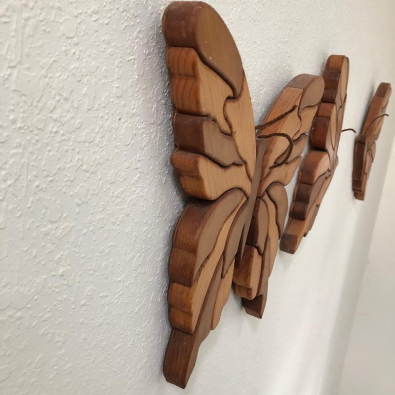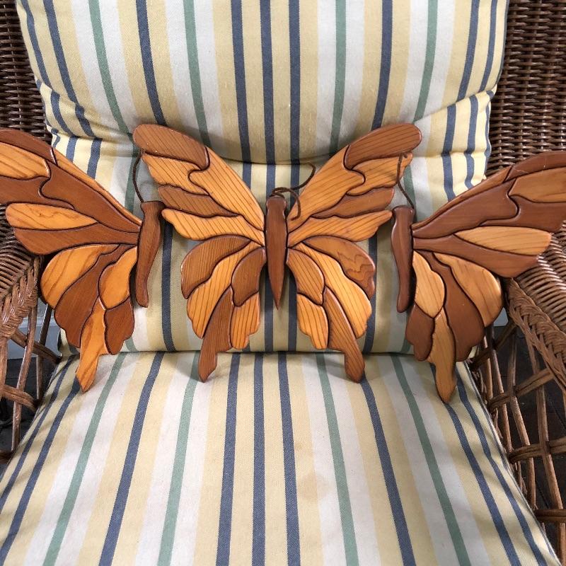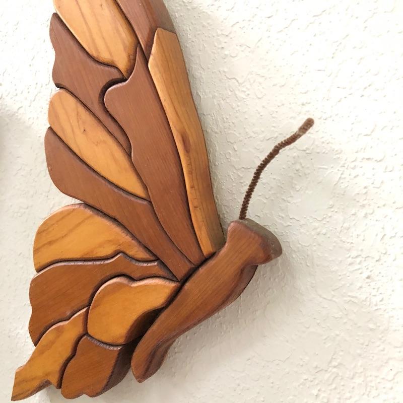 This delightful set of wooden butterflies handcrafted by Milton Knolhoff will become a conversation piece wherever you decide to display them. Watch how the light dances around the warm shades of wood in morning, afternoon, and evening times. Antlers are made of pipe cleaners. Three pieces in lot. The large butterfly measures 12 x 1x 12”. Shipping available.