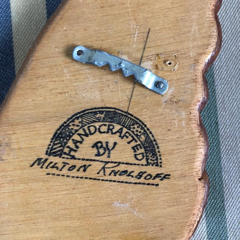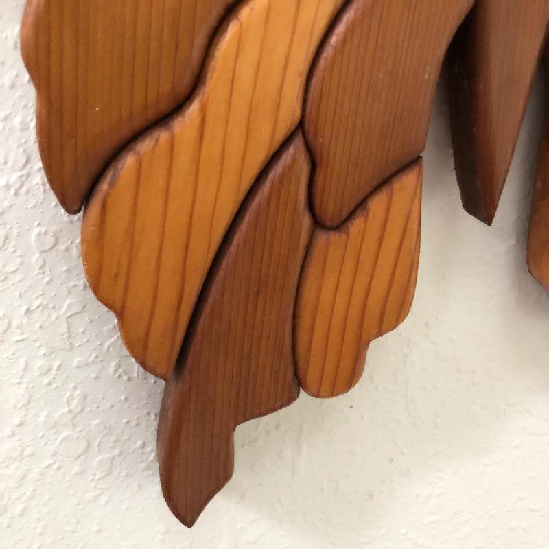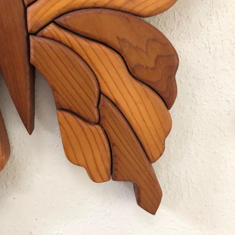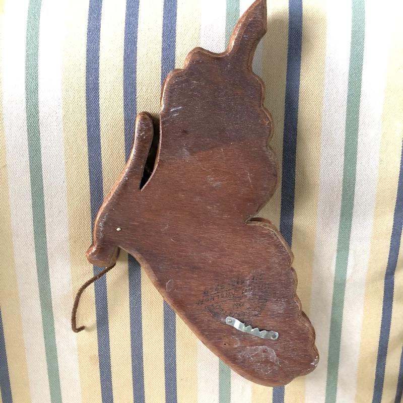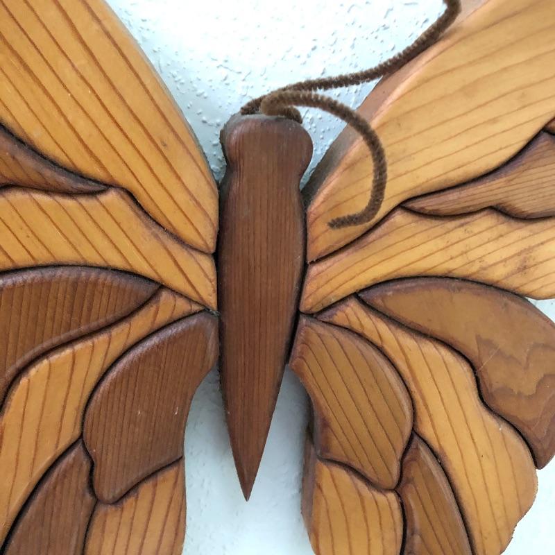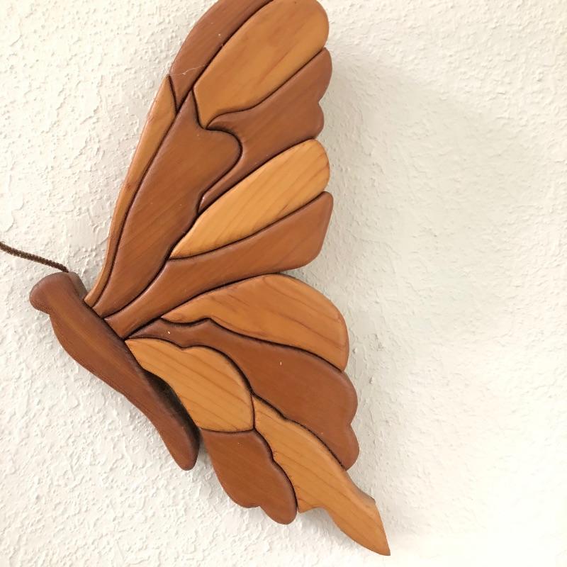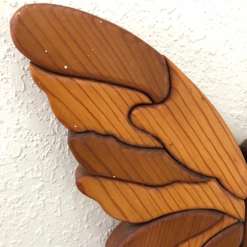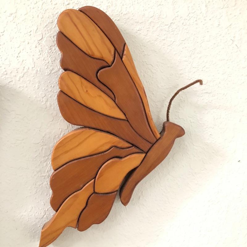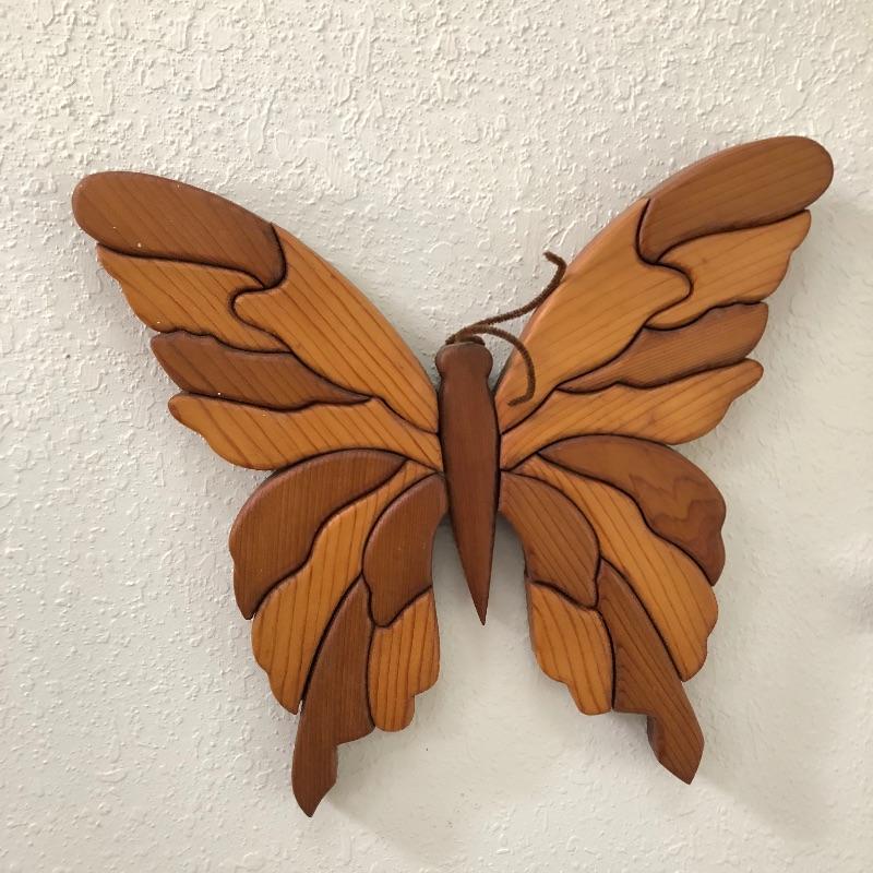This delightful set of wooden butterflies handcrafted by Milton Knolhoff will become a conversation piece wherever you decide to display them. Watch how the light dances around the warm shades of wood in morning, afternoon, and evening times. Antlers are made of pipe cleaners. Three pieces in lot. The large butterfly measures 12 x 1x 12”. Shipping available.