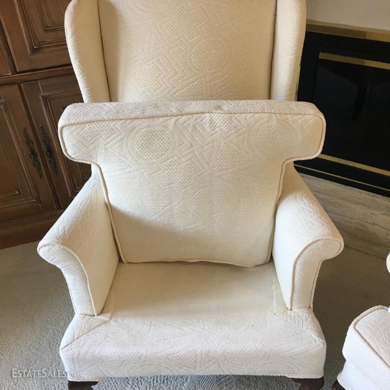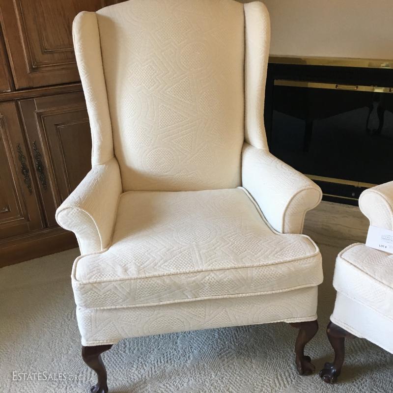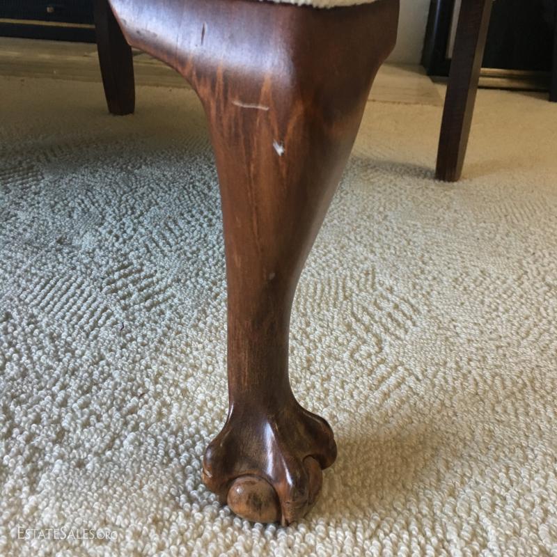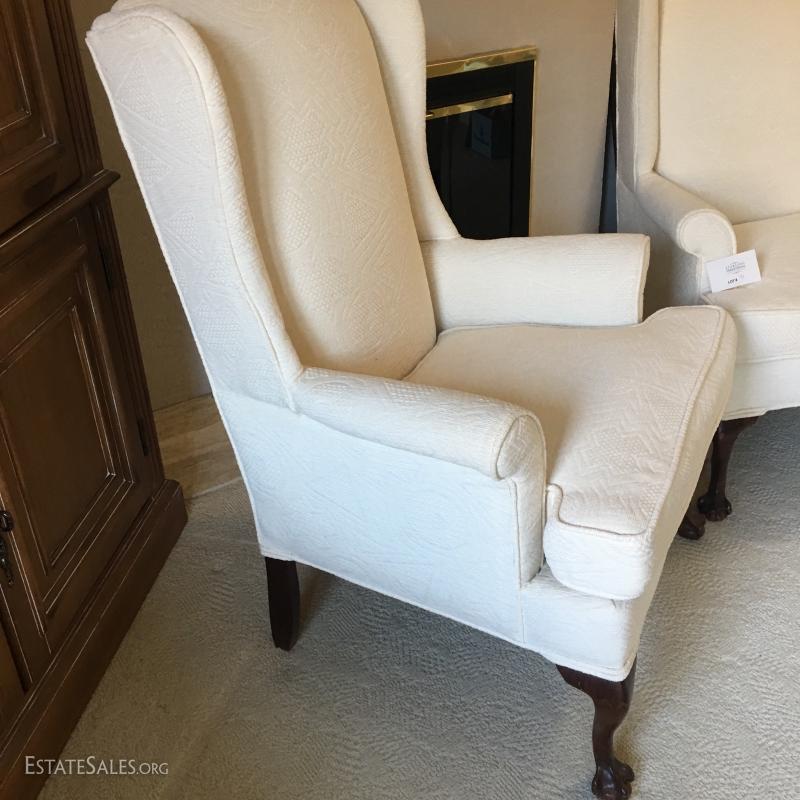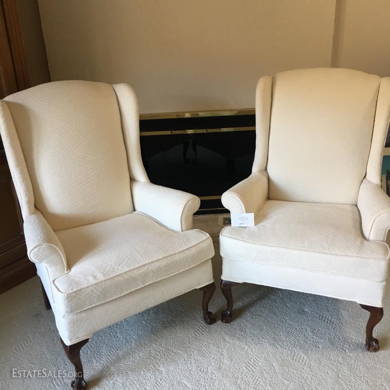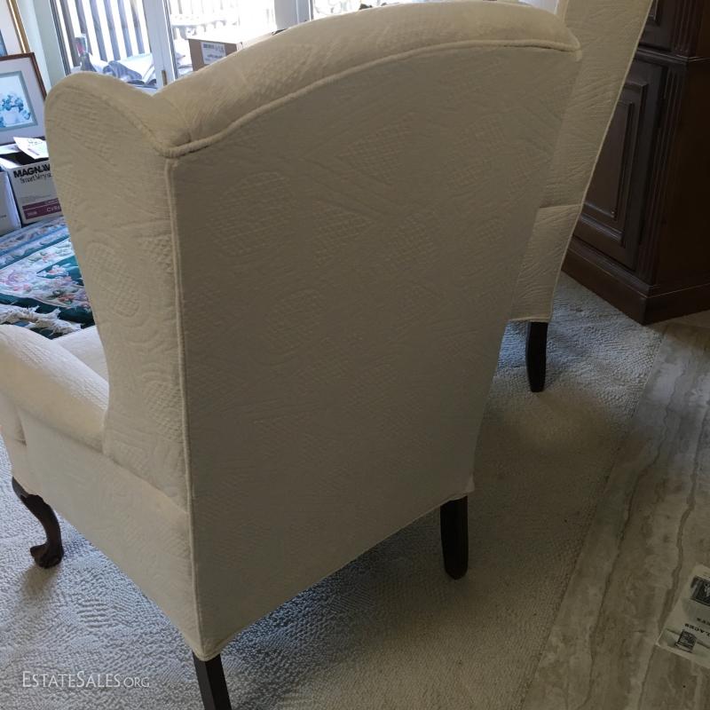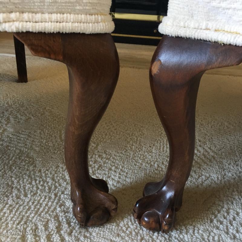 Set of 2 matching Chippendale style chairs, High back. Light cream/off-white fabric. Looks to be newly upholstered. No stains or rips. Smoke free home. Claw & ball feet/legs.