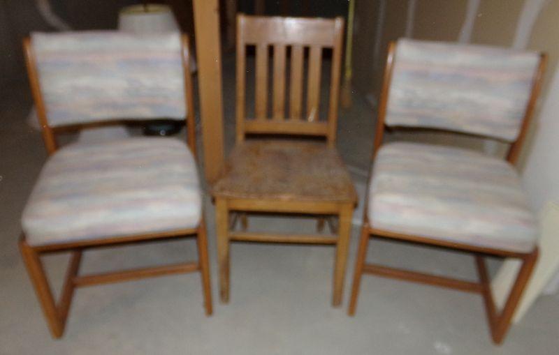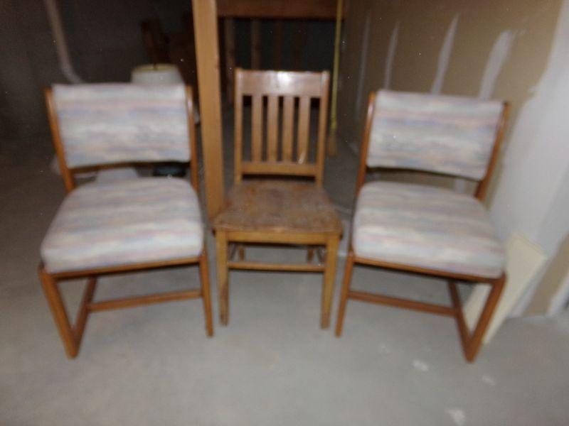 2 MATCHING CHAIRS AND 1 VINTAGE OAK DESK CHAIR WHICH HAS SOME LOSE OF IT'S FINISH
