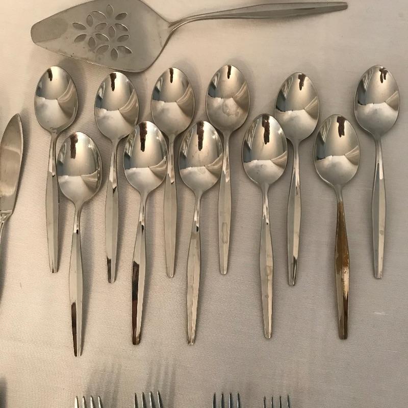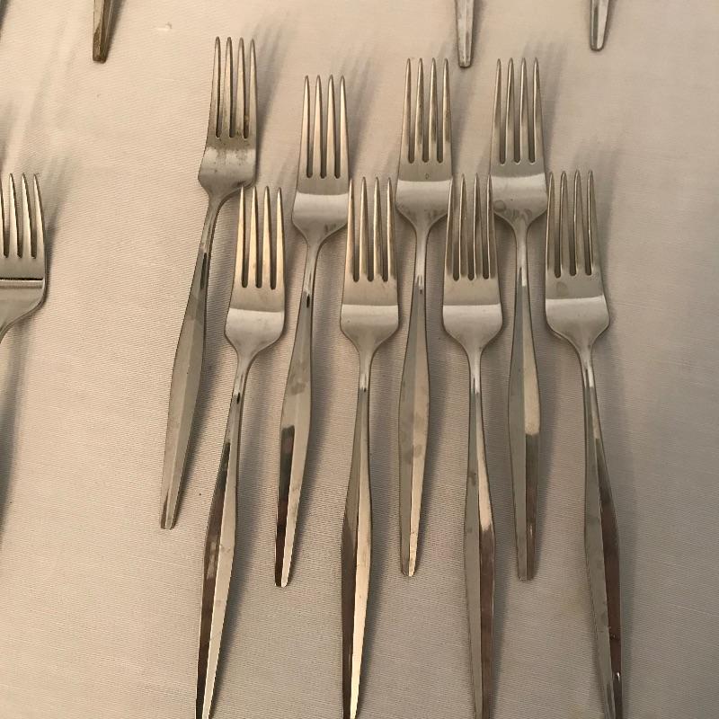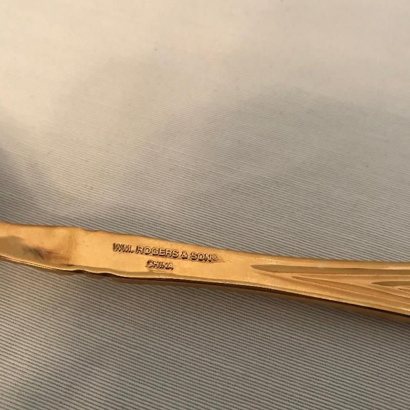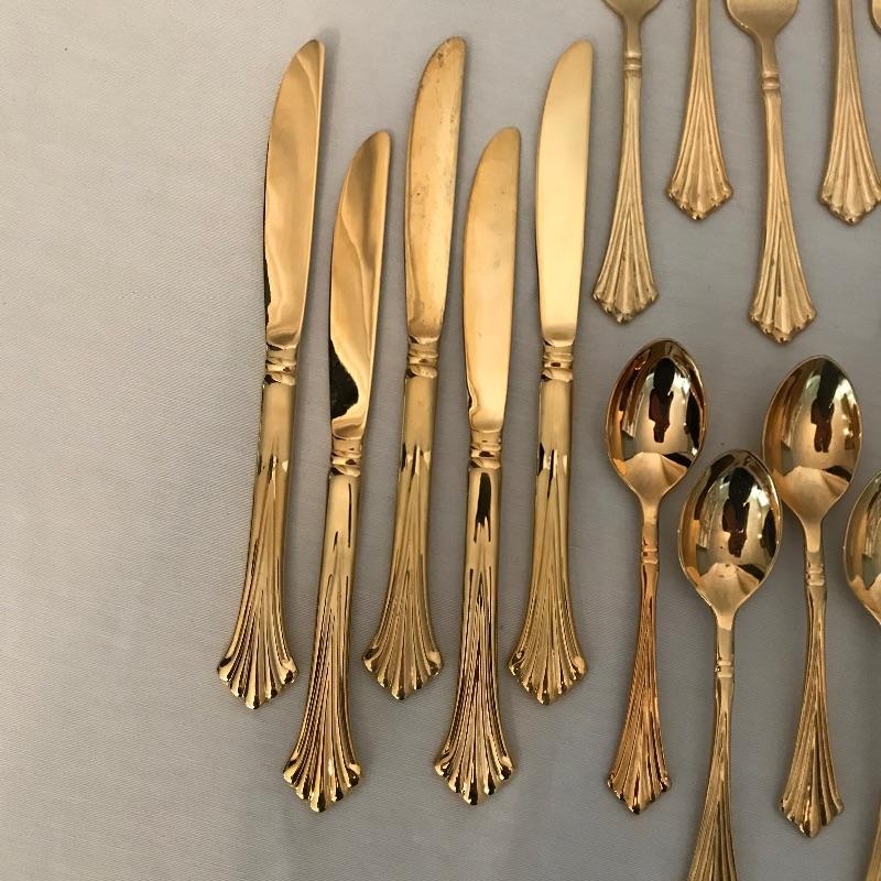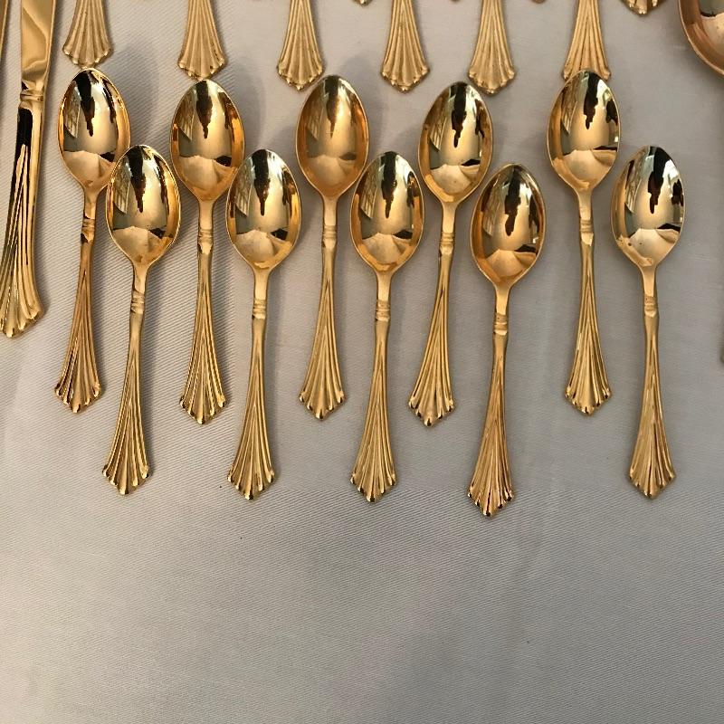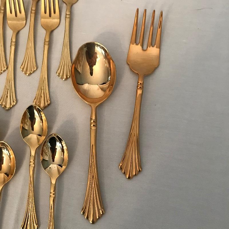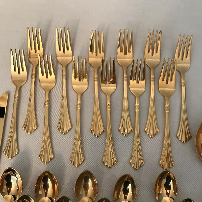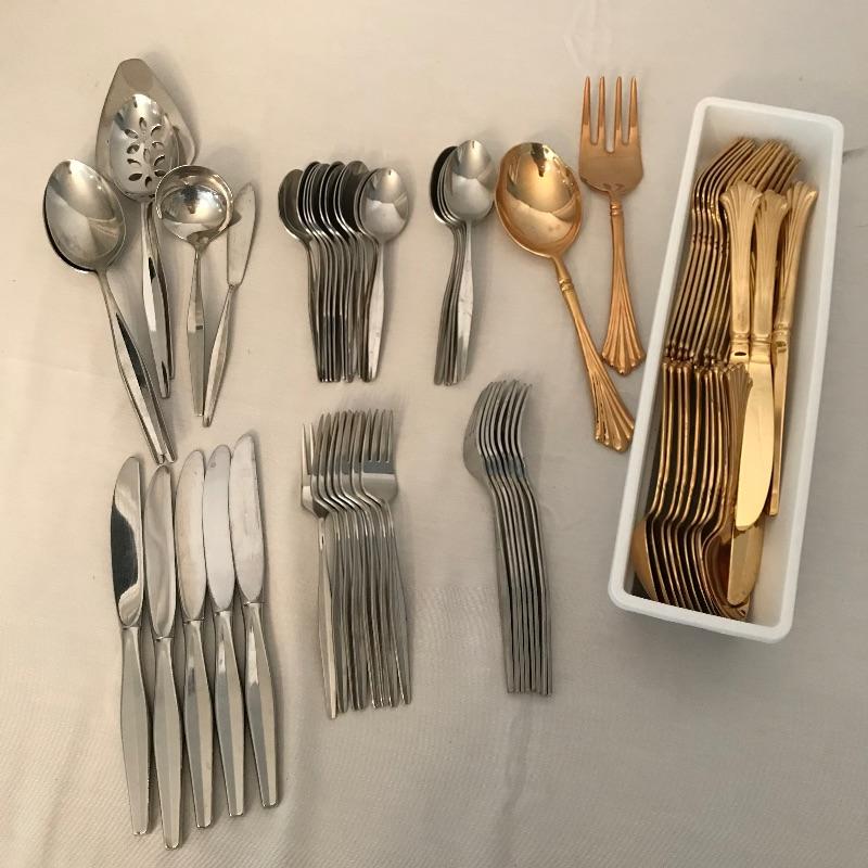 Two sets of cutlery so you can change your dinner table depending on your mood. Bold and elegant gold colored WM Rogers & Son comes with five dinner knives, twelve forks, ten coffee spoons and a large serving spoon and fork. The serving cutlery has a more copper color compared to the dining cutlery. The MCM style Gorham stainless collection includes three large serving spoons, a pair of slotted utensils, butter knife and ladle. Dinner silverware includes five knives, eight entree forks, eight salad forks, eleven coffee/dessert spoons and four soup spoons. See photos. Shipping available.