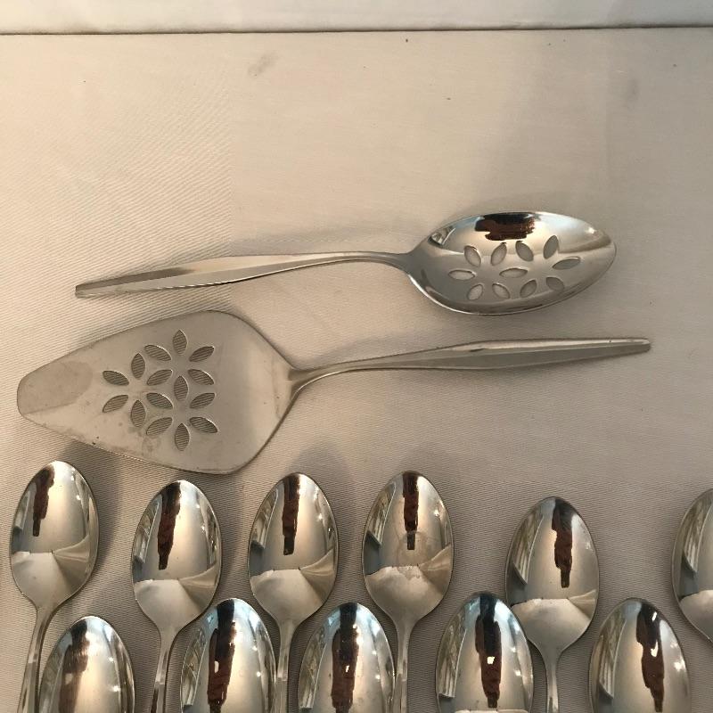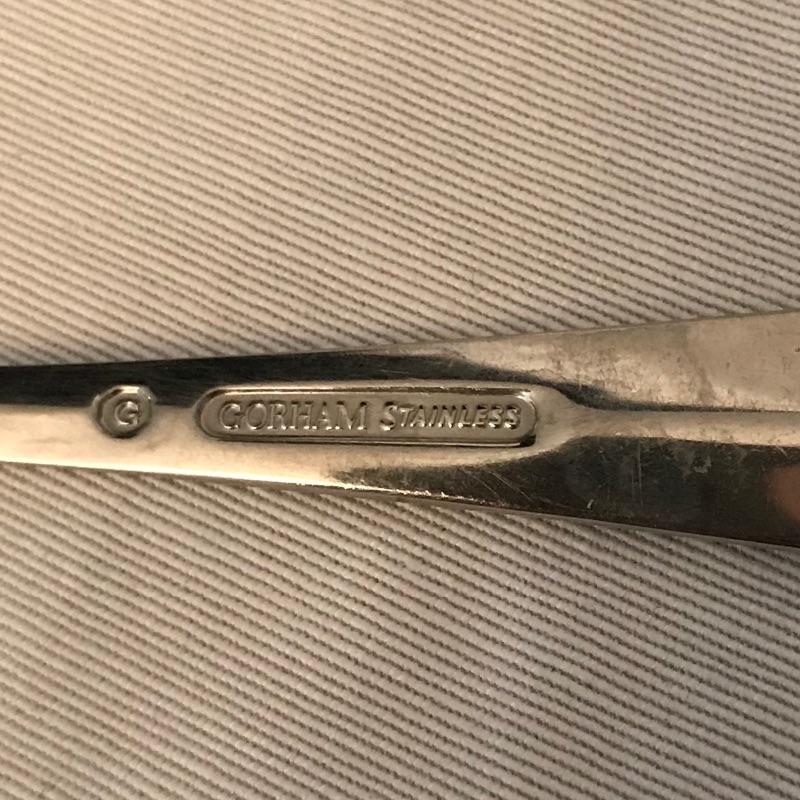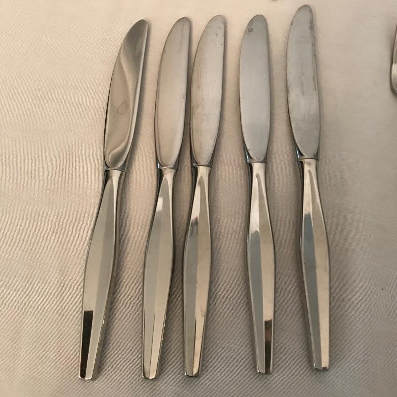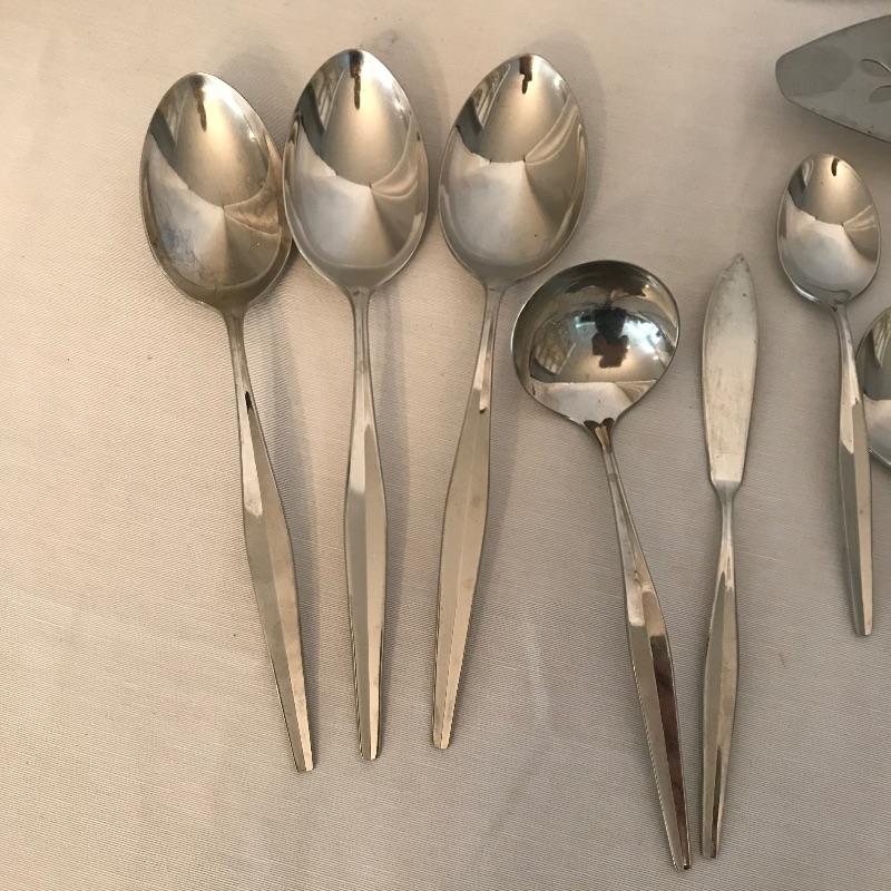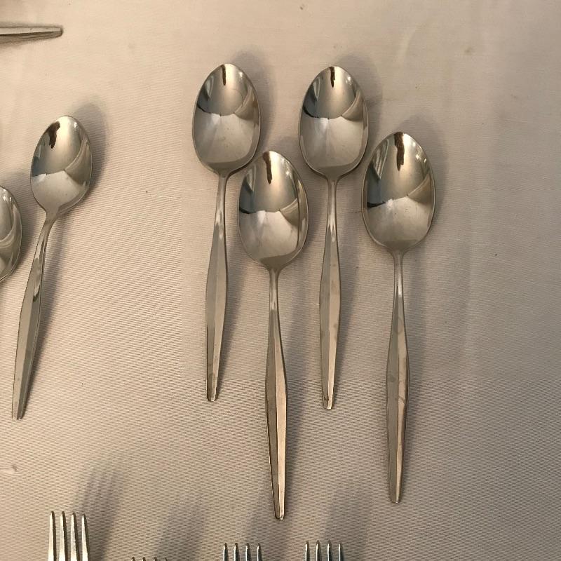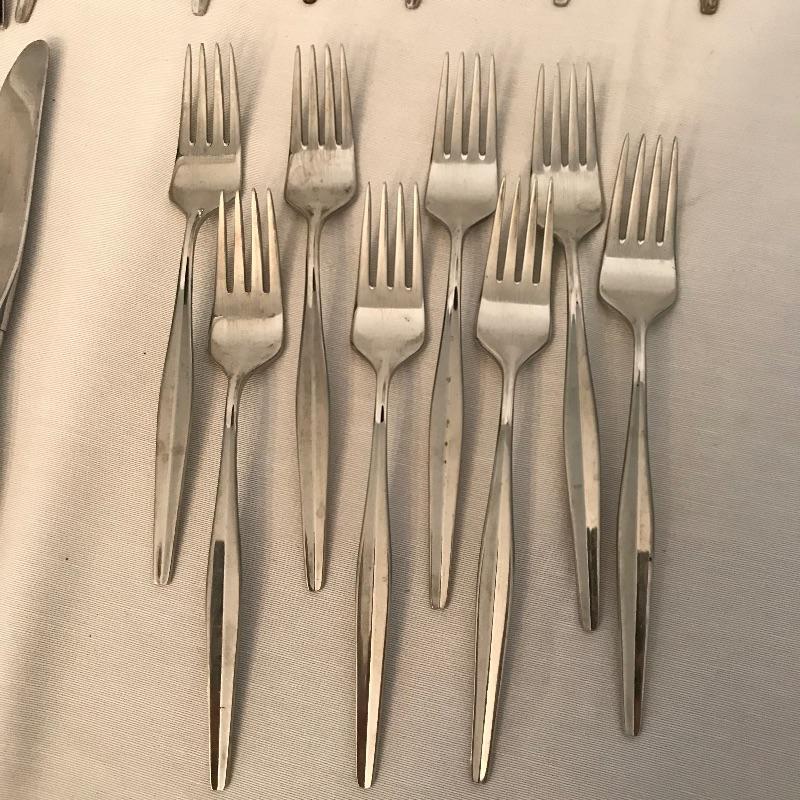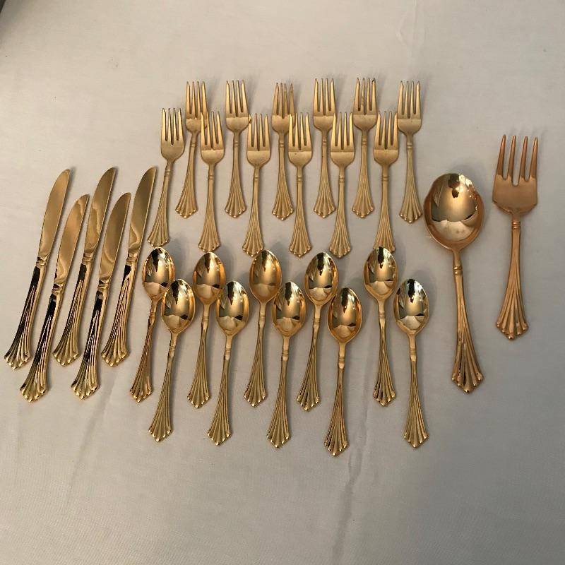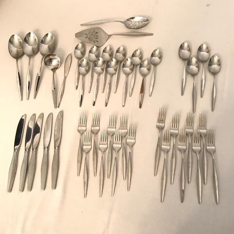 Two sets of cutlery so you can change your dinner table depending on your mood. Bold and elegant gold colored WM Rogers & Son comes with five dinner knives, twelve forks, ten coffee spoons and a large serving spoon and fork. The serving cutlery has a more copper color compared to the dining cutlery. The MCM style Gorham stainless collection includes three large serving spoons, a pair of slotted utensils, butter knife and ladle. Dinner silverware includes five knives, eight entree forks, eight salad forks, eleven coffee/dessert spoons and four soup spoons. See photos. Shipping available.
