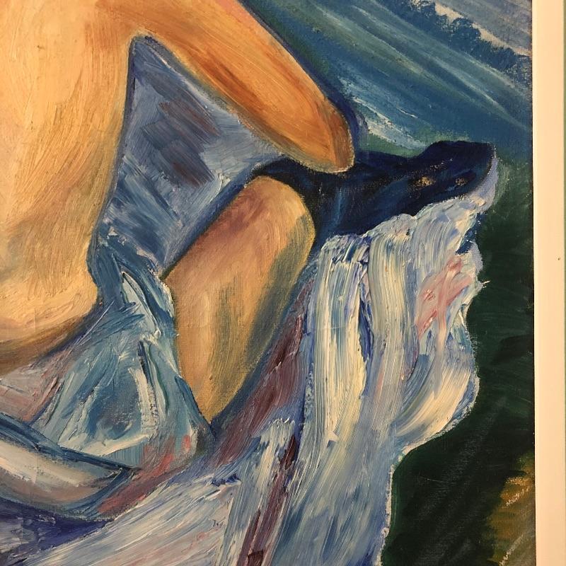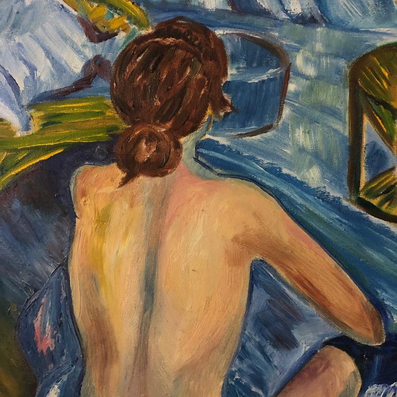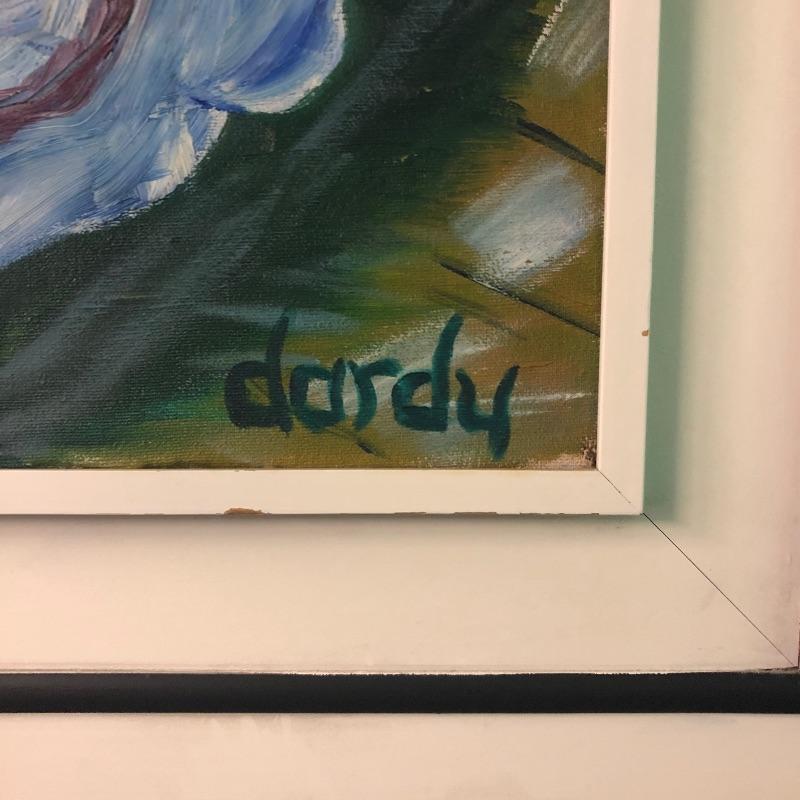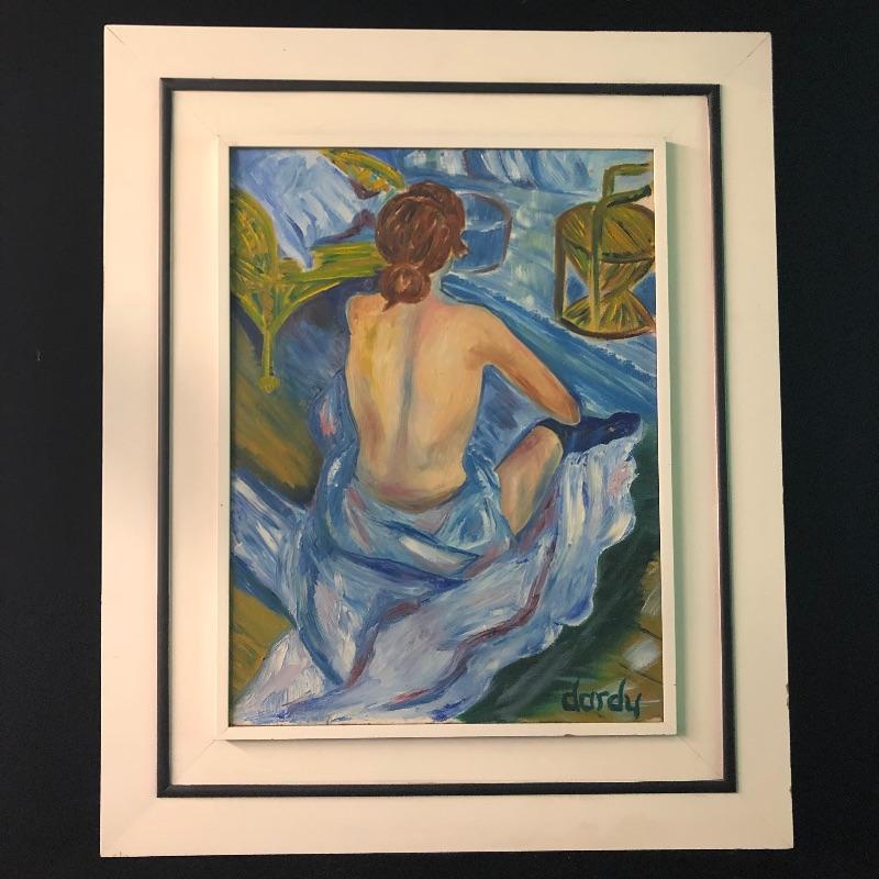 The an original and signed Dardy oil painting of a seated woman from behind. It is mounted on canvas and displayed in a wooden frame. The brushstrokes are expressive and lively.