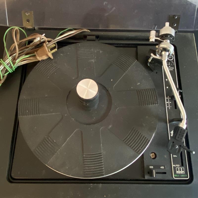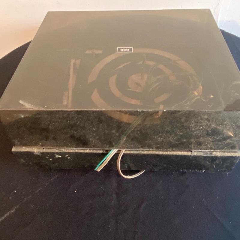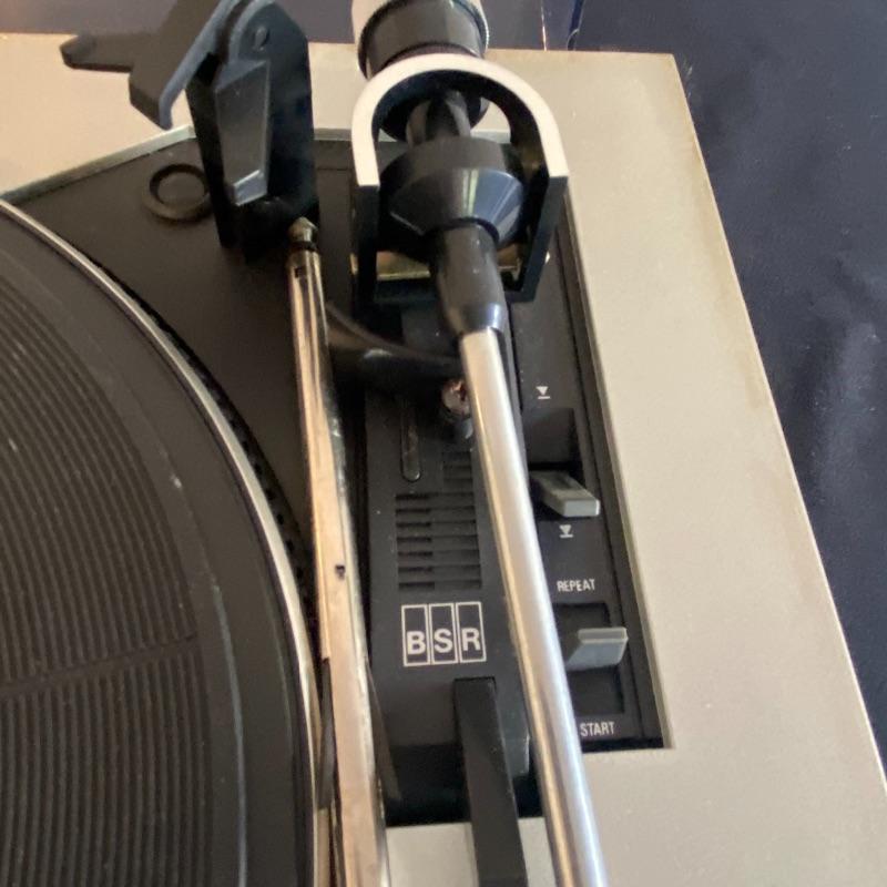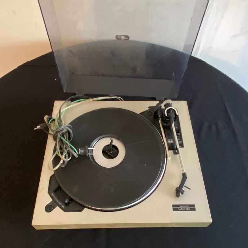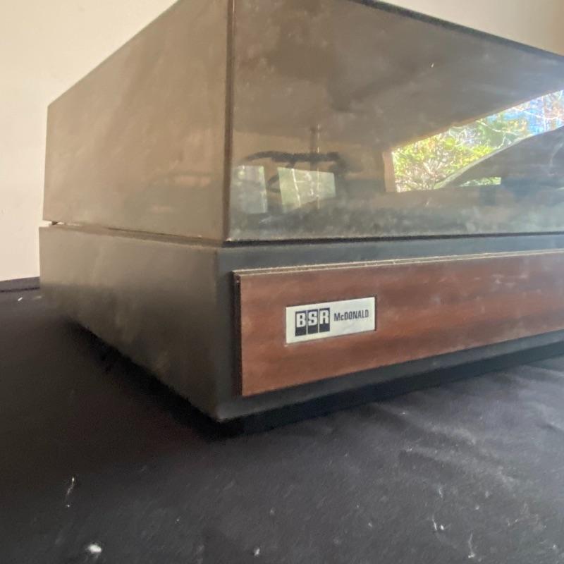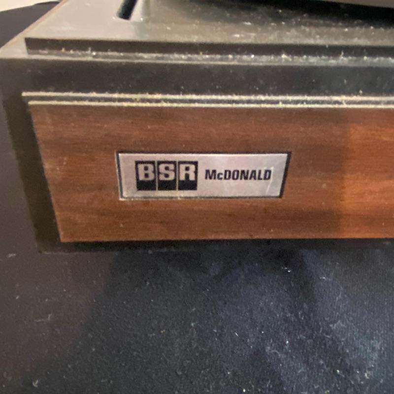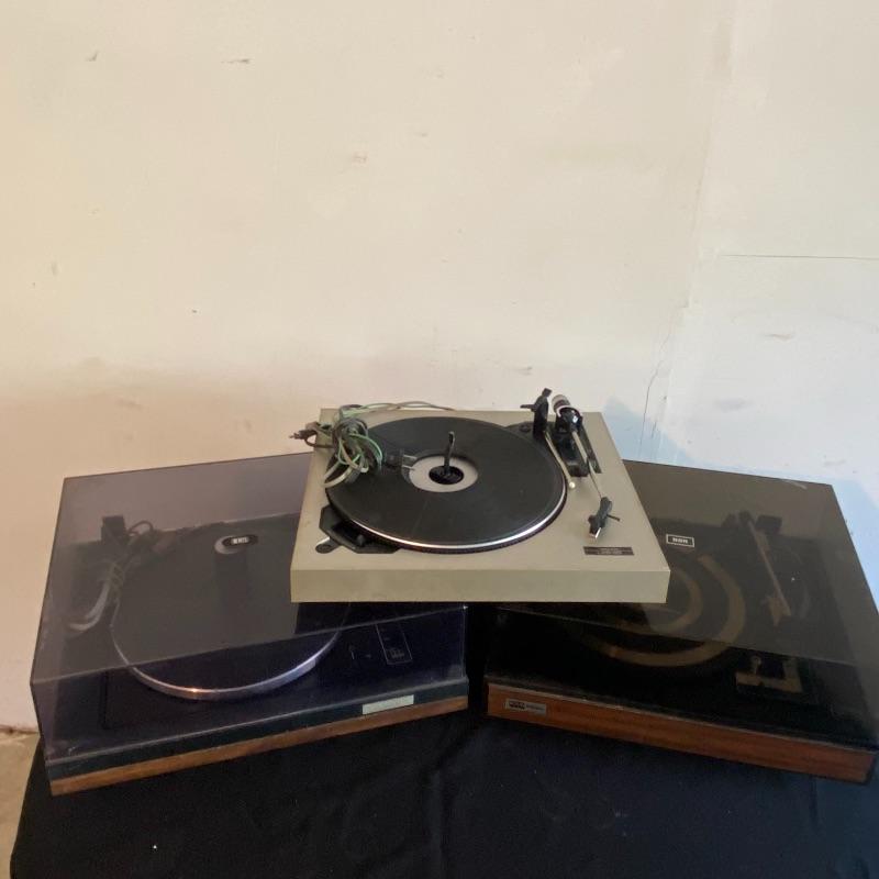 Lot includes three turntables. The first turntable is a BSR LAB 58 0106. Turntable sits in a plastic wood-like base with plastic lid attached by hinges. Chords included and spinning when tested. Second BSR Turntable is a lab 89. Serial number 64731652. Turntable sits in gray vase with adjustable legs. Cords included and powered on with humming noise when tested. Third turntable is a BSR2260BX and sits in black plastic base with top lid. Cords included but start button was jammed. See photos!