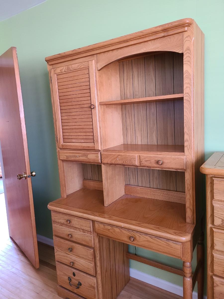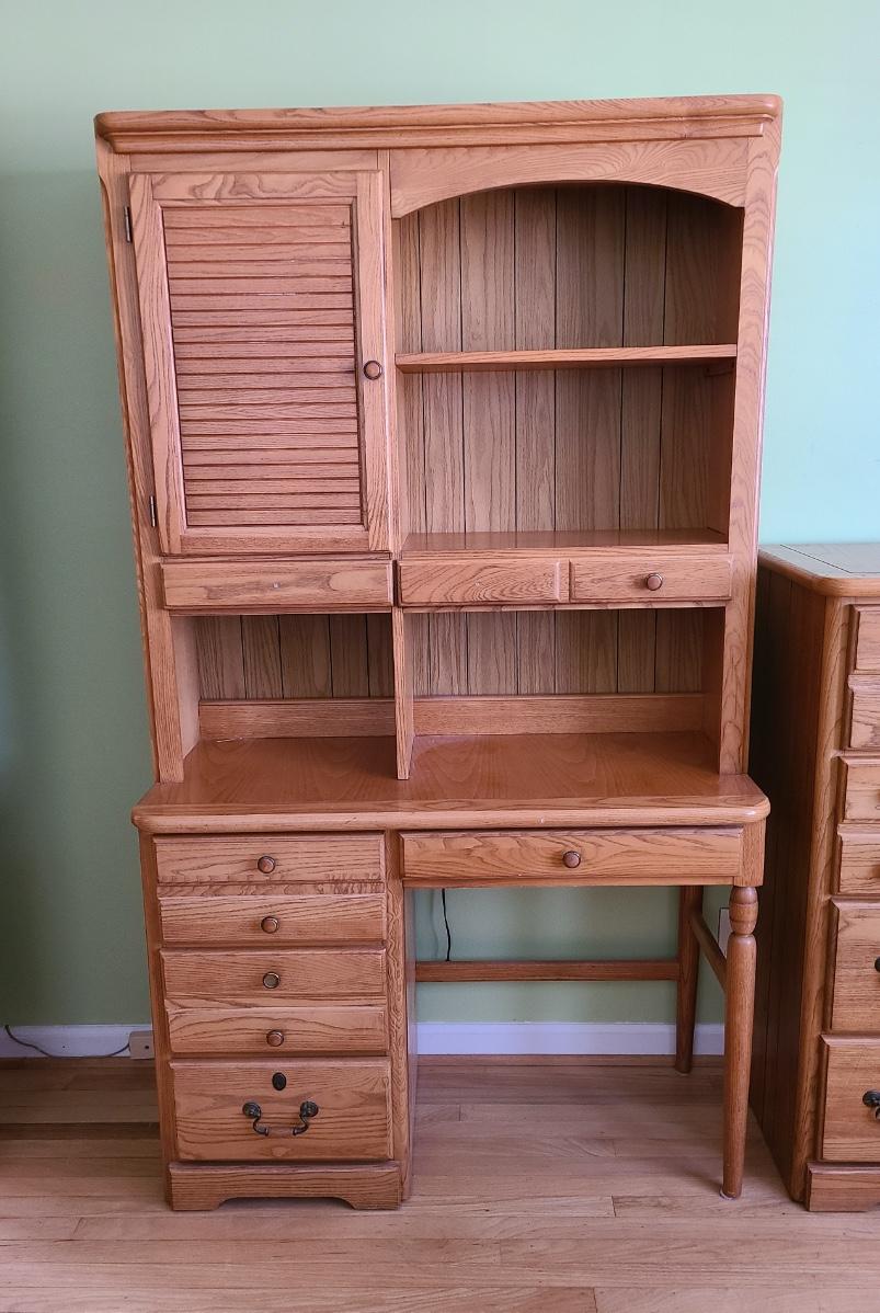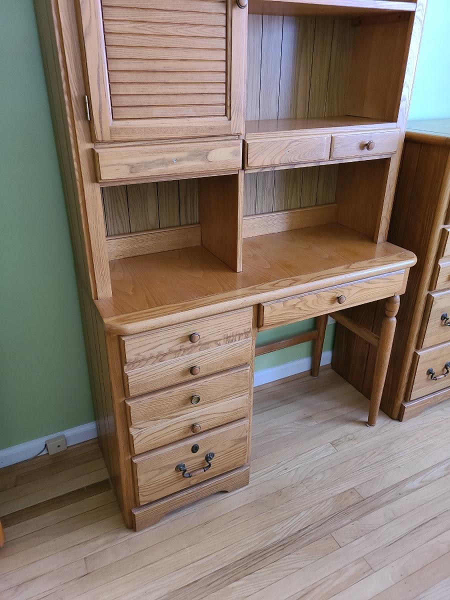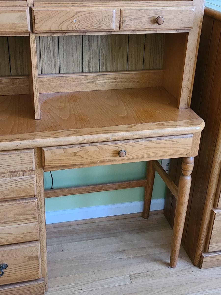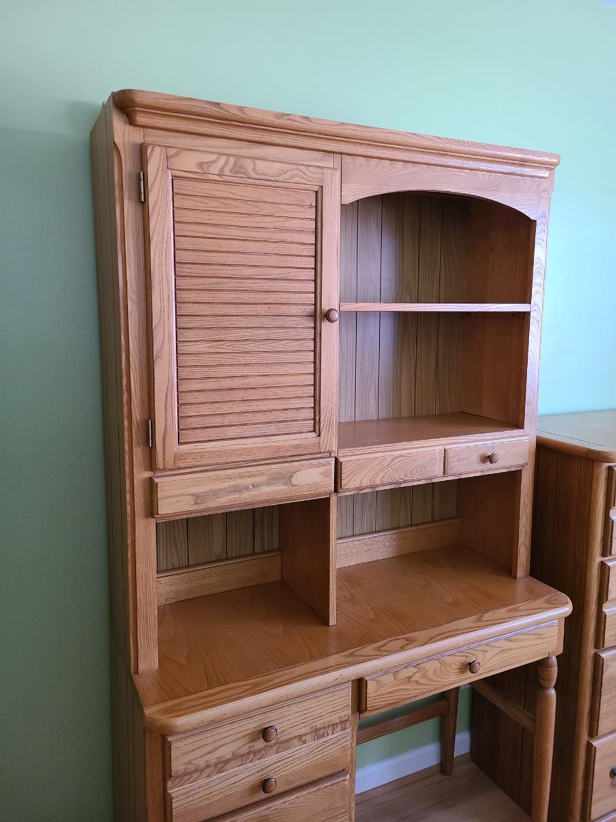 This is pre-owned and does show some wear, but has years of life left and is perfect for any room in the home. Solid design. 50 inches long, 72 inches tall. 30 inches tall the desk, 19 inches deep. Please see all pictures as they are the best representation of the items. The pictures show condition, measurements if taken, and what is included in the lot. Due to the large amount that we photograph and the time frame, we are not always able to take measurements. All items unless noted, are pre-owned and have been used. If you purchased furniture, you must bring help. We do not allow one person to carry large furniture out on their own. Bring help, tools and a truck for the safety of our client’s homes, and your personal safety. Any damages that result to the property including walls, and floors due to moving of the furniture will be charged to the buyer. Company policy. Thank you.
