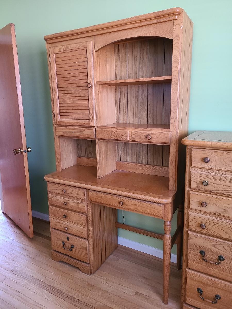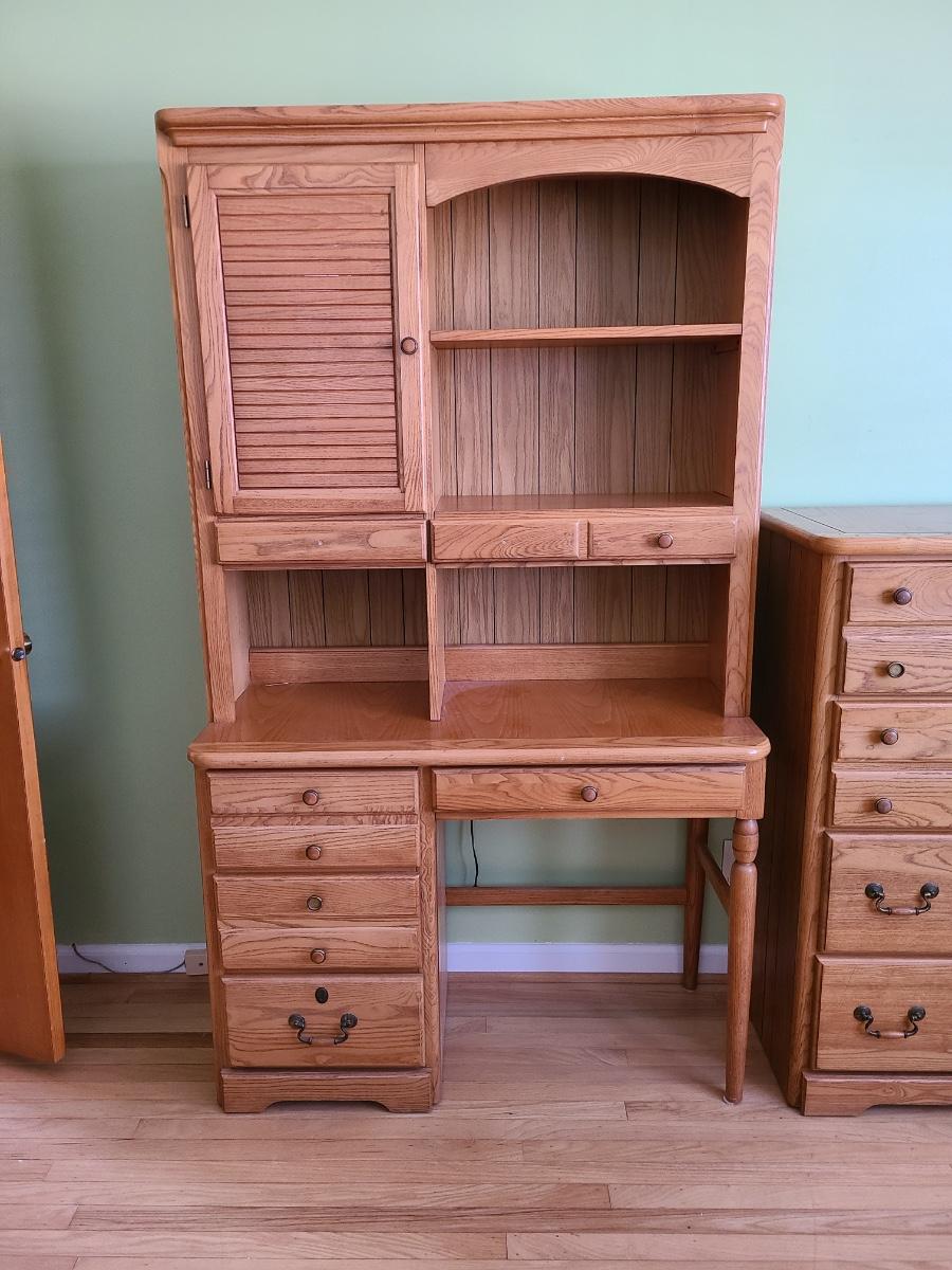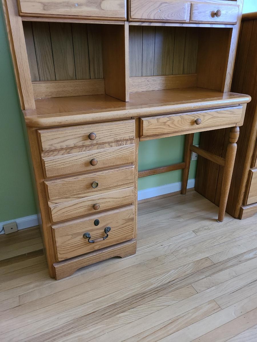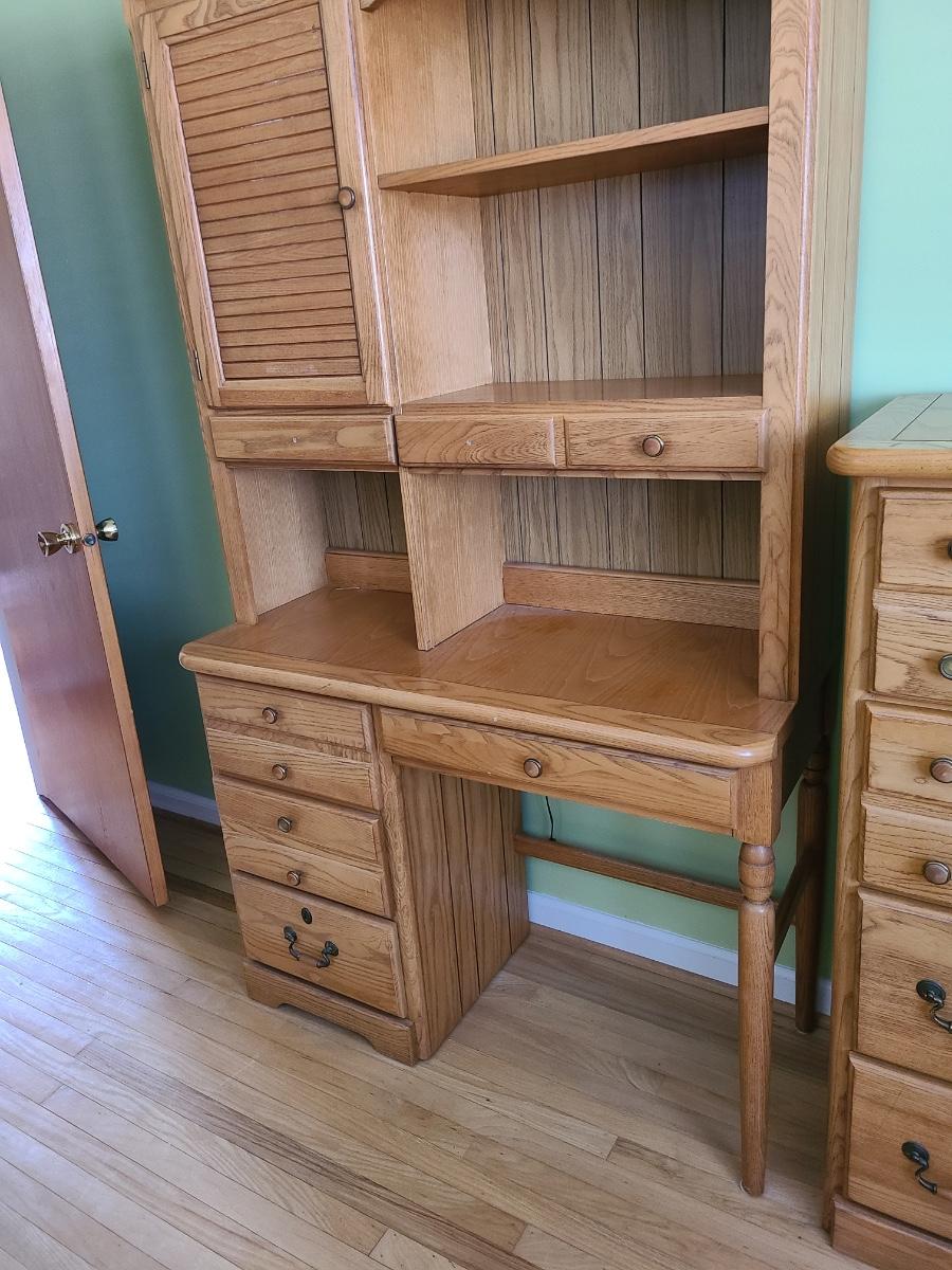 This is pre-owned and does show some wear, but has years of life left and is perfect for any room in the home. Solid design. 50 inches long, 72 inches tall. 30 inches tall the desk, 19 inches deep. Please see all pictures as they are the best representation of the items. The pictures show condition, measurements if taken, and what is included in the lot. Due to the large amount that we photograph and the time frame, we are not always able to take measurements. All items unless noted, are pre-owned and have been used. If you purchased furniture, you must bring help. We do not allow one person to carry large furniture out on their own. Bring help, tools and a truck for the safety of our client’s homes, and your personal safety. Any damages that result to the property including walls, and floors due to moving of the furniture will be charged to the buyer. Company policy. Thank you.