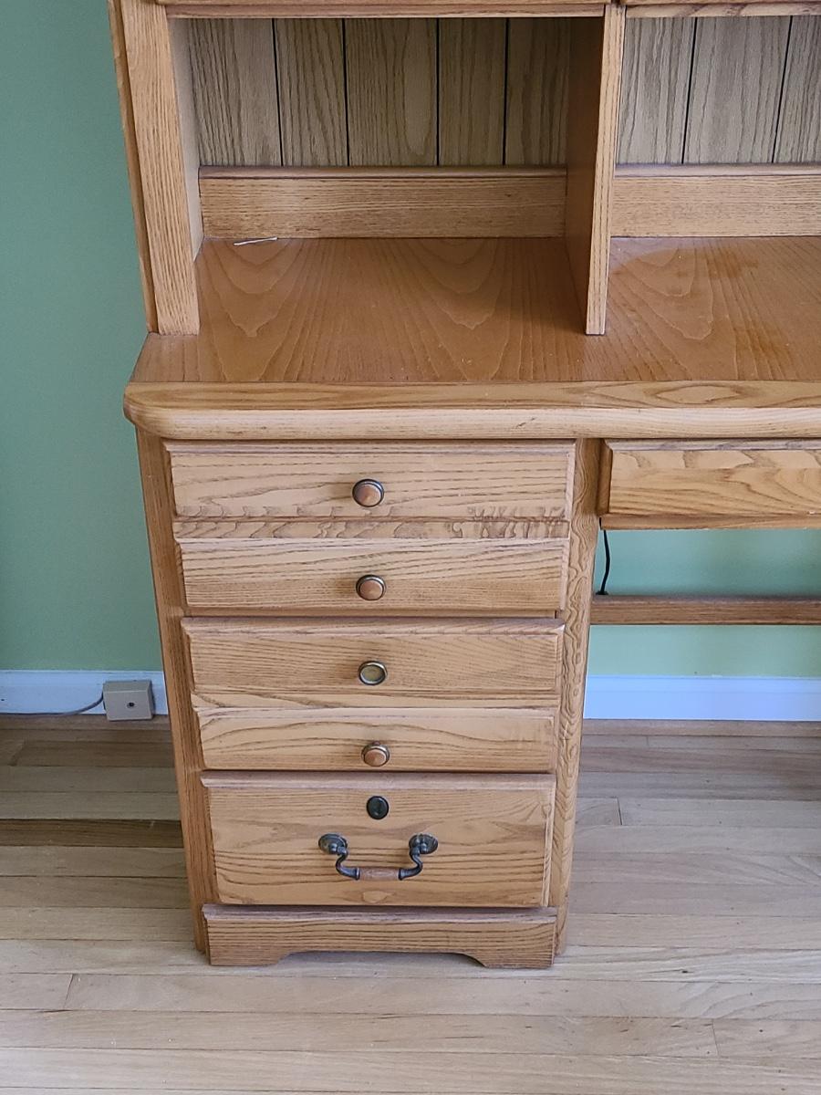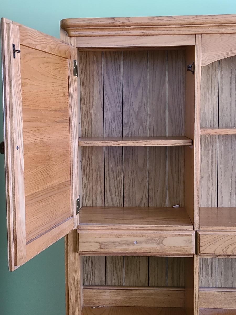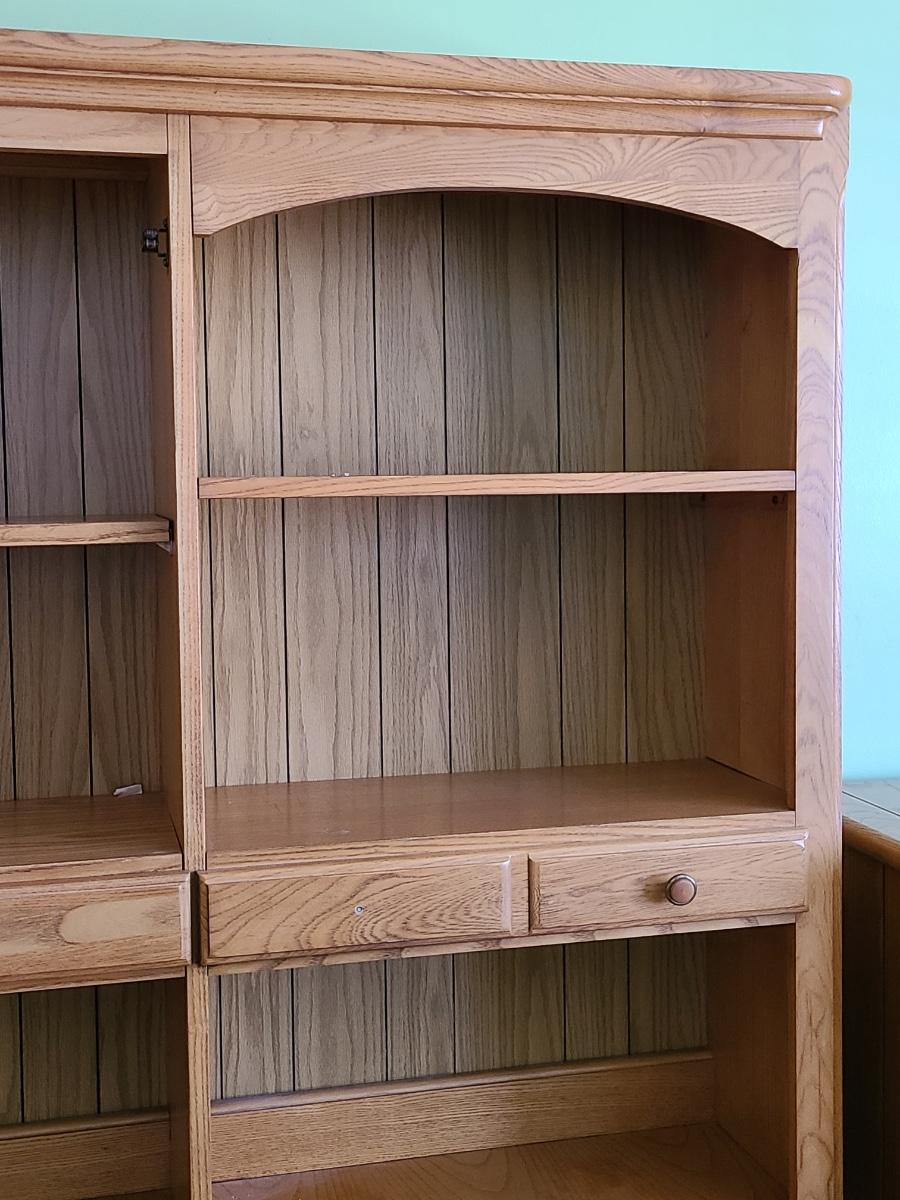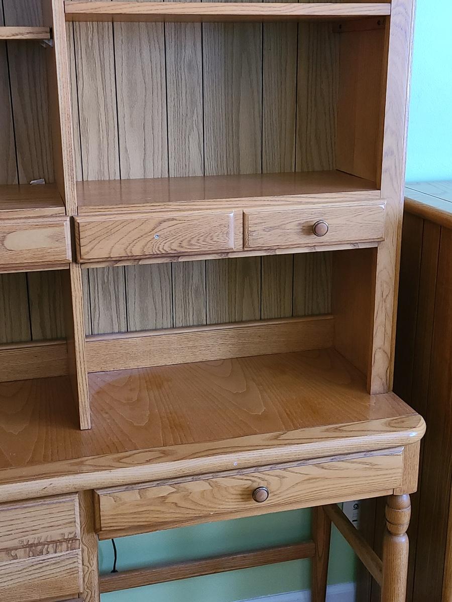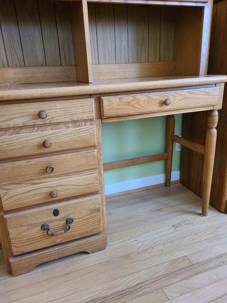 This is pre-owned and does show some wear, but has years of life left and is perfect for any room in the home. Solid design. 50 inches long, 72 inches tall. 30 inches tall the desk, 19 inches deep. Please see all pictures as they are the best representation of the items. The pictures show condition, measurements if taken, and what is included in the lot. Due to the large amount that we photograph and the time frame, we are not always able to take measurements. All items unless noted, are pre-owned and have been used. If you purchased furniture, you must bring help. We do not allow one person to carry large furniture out on their own. Bring help, tools and a truck for the safety of our client’s homes, and your personal safety. Any damages that result to the property including walls, and floors due to moving of the furniture will be charged to the buyer. Company policy. Thank you.