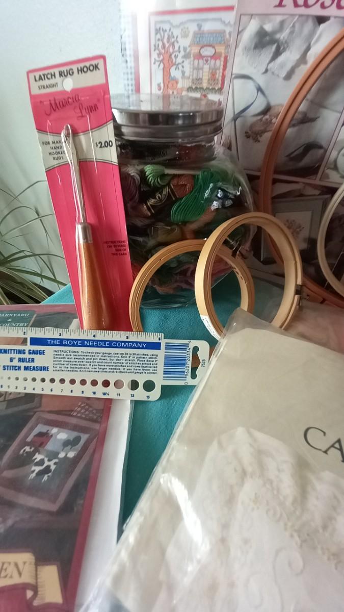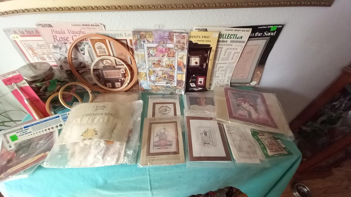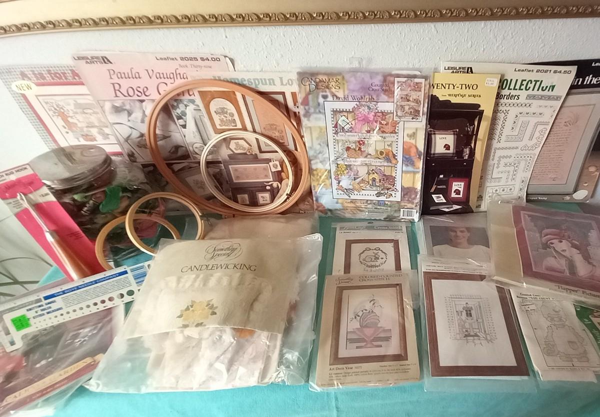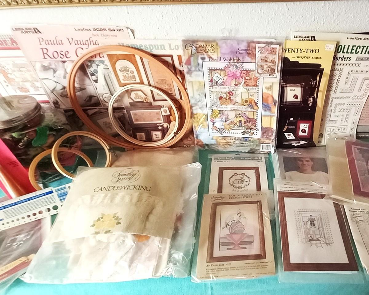 PROJECTS TO KEEP YOU BUSY FOR AWHILE. EMBROIDARY THREADS-LOOPS-PATTERN BOOKS-KITS -LOOP RUG HOOK AND MORE. MOST OF THE ITEMS ARE NEW