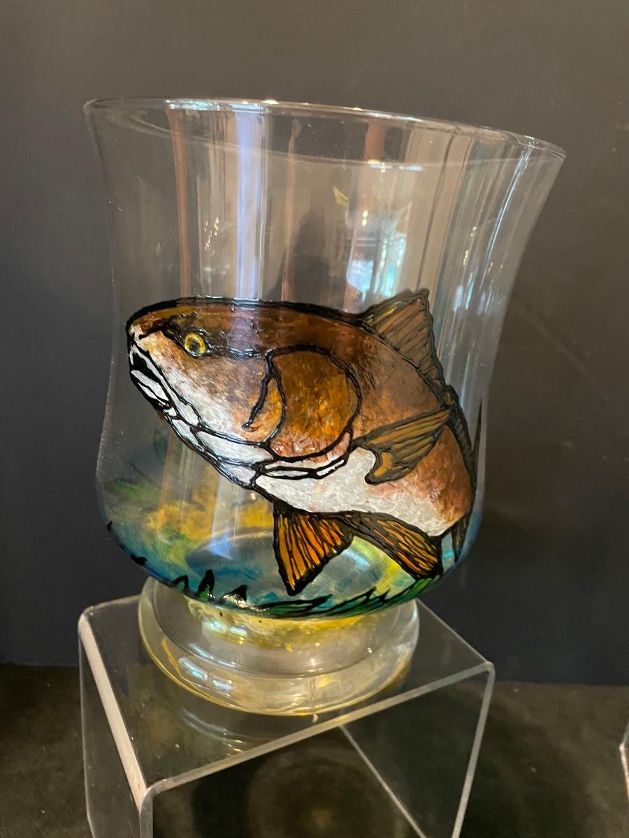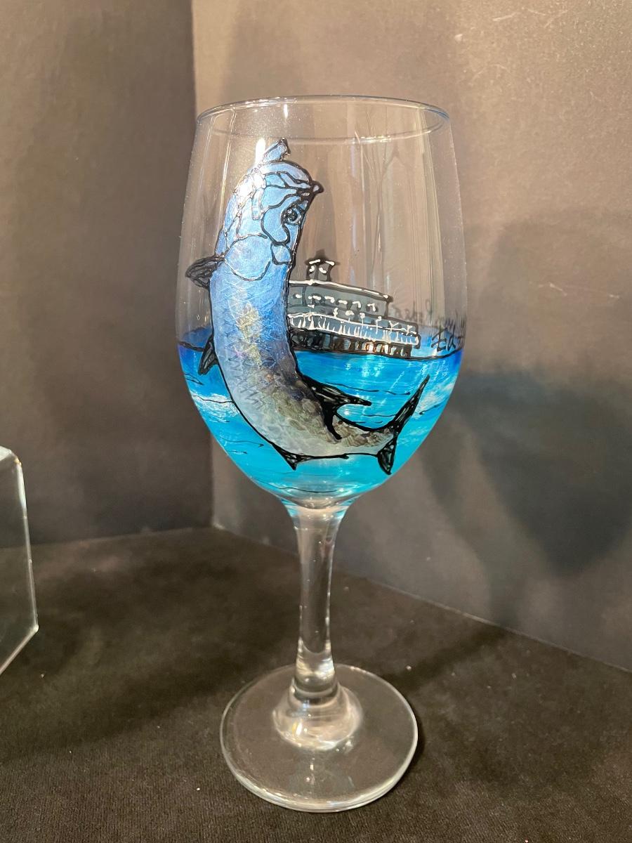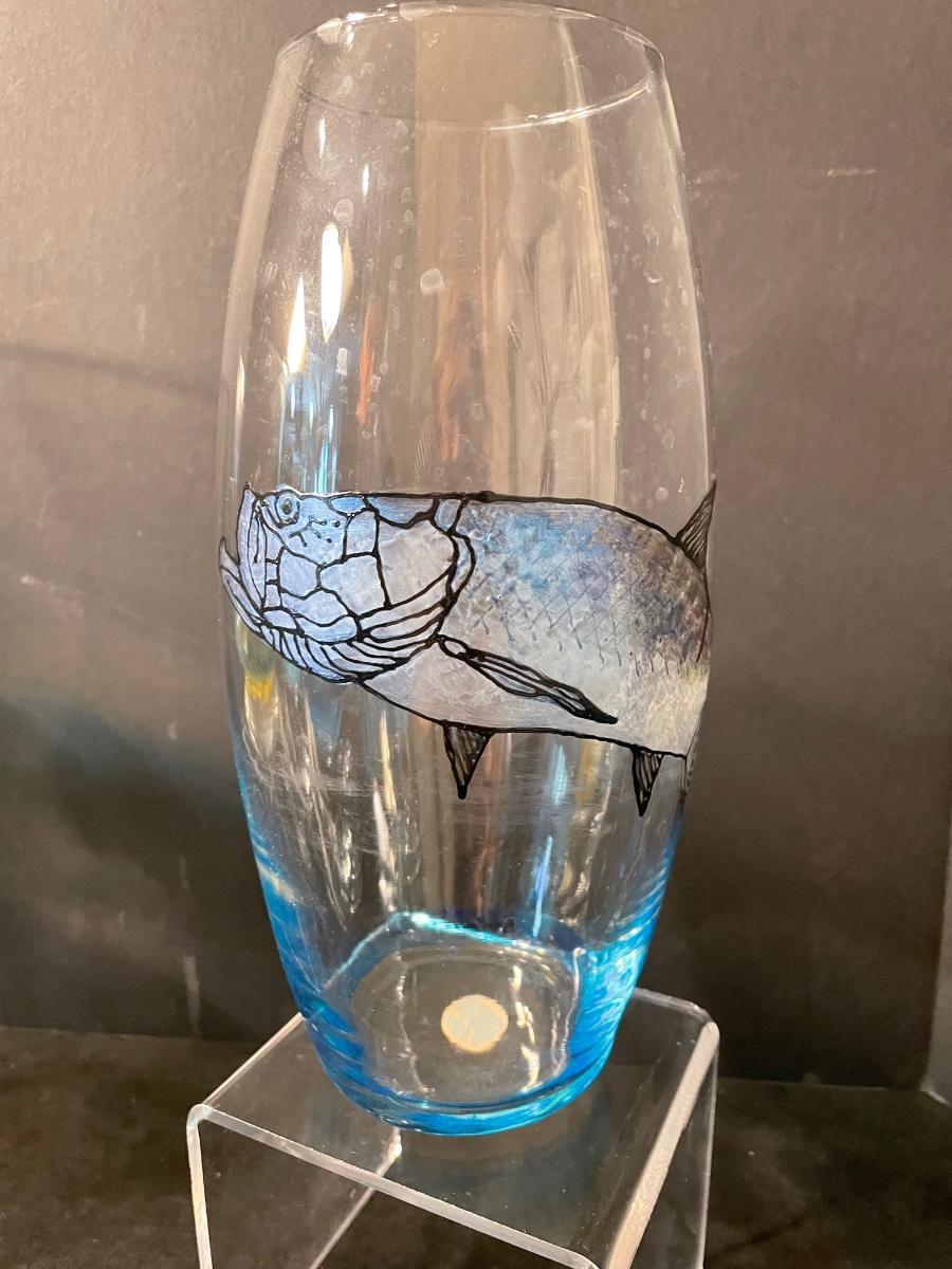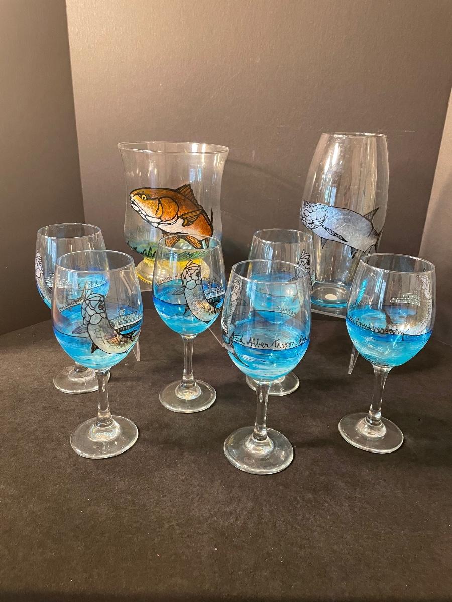 Ed Albert Tarpon Rodeo commemorative vase, pitcher and six wine glasses, hand painted by a Florida artist