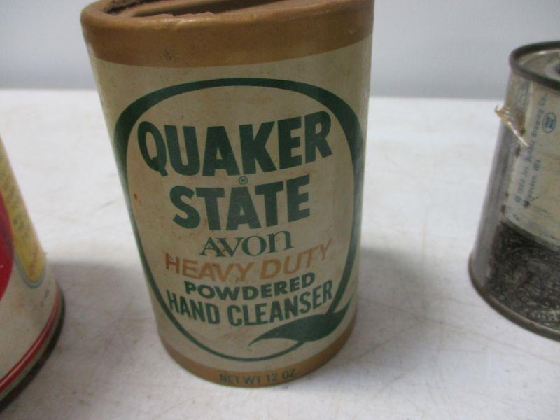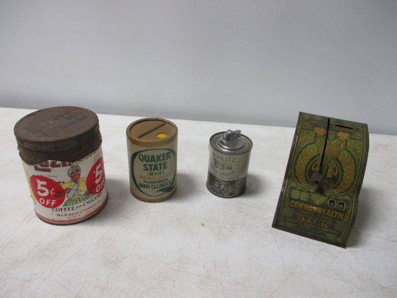 This lot includes Quaker State Avon hand cleanser container, Schlitz malt liquor lighter we did not test, Commonwealth three coin bank. we did not test the bank and Vintage Luzianne Coffee container