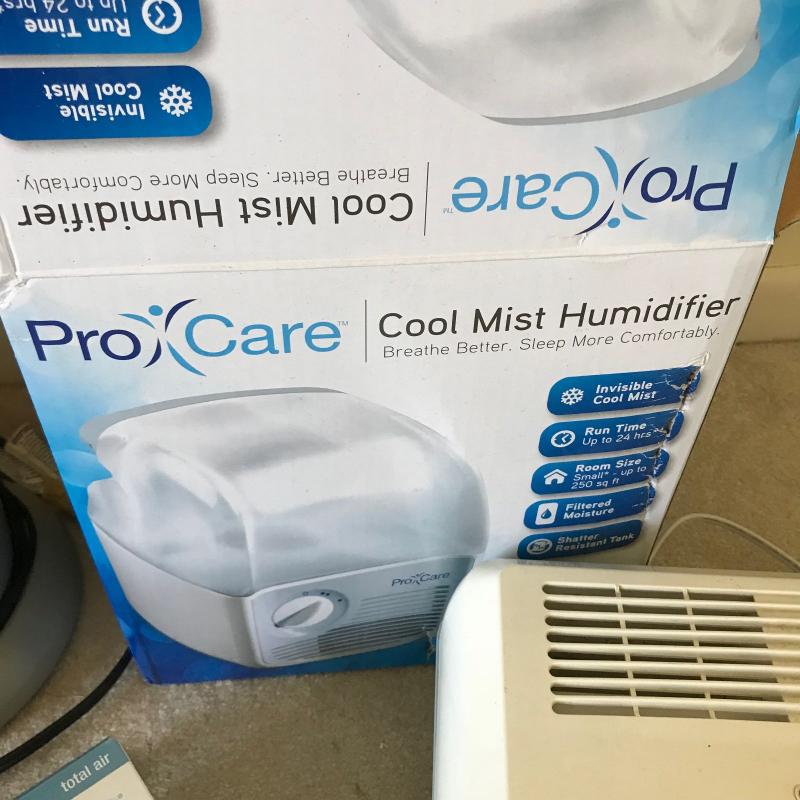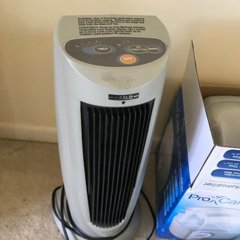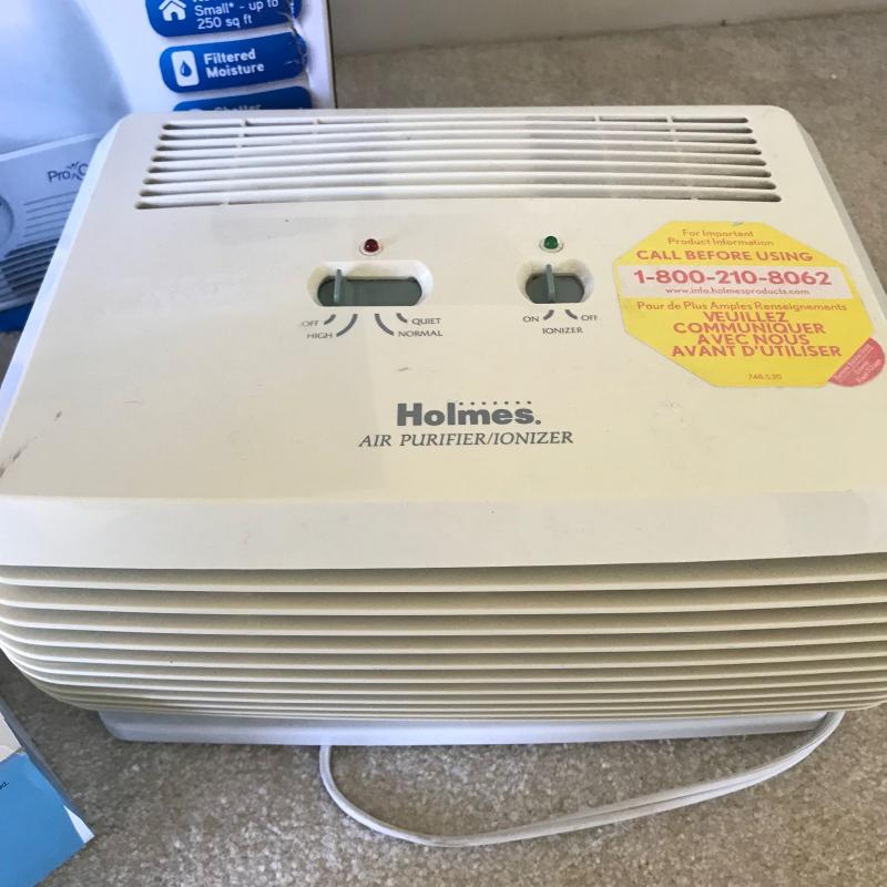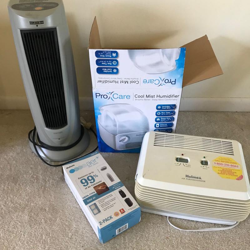 Lot includes several items to improve the air in your home. This includes a Holmes Air Purifies/Ionizer, a Pro Care Cool Mist Humidifier, a Lasso Oscillating Heater and an extra Holmes Filter. No shipping.