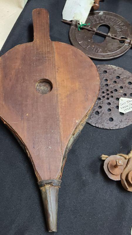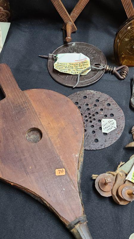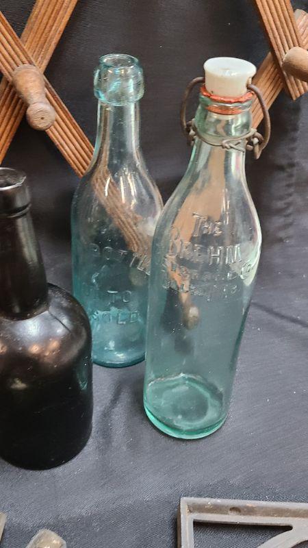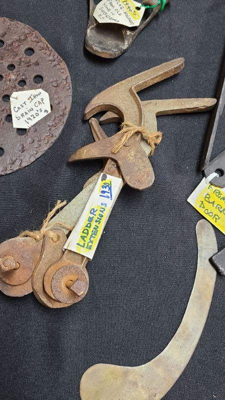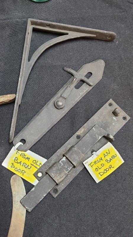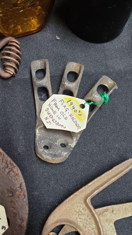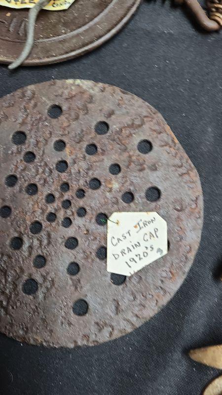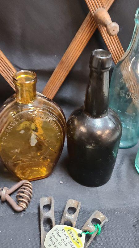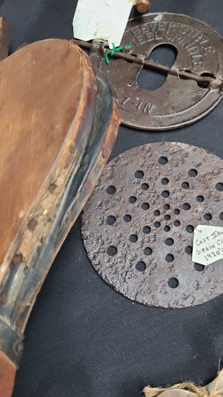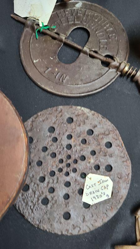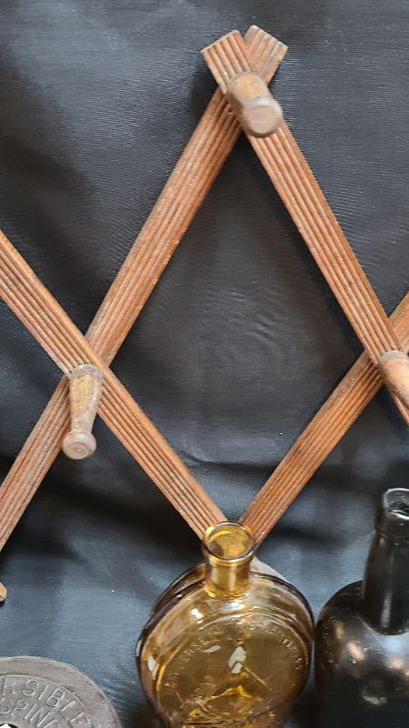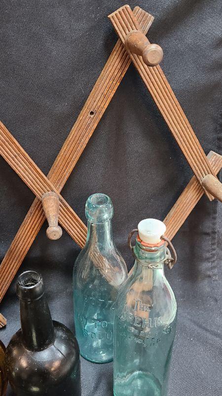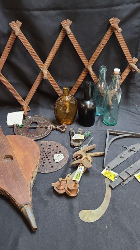 Random lot of vintage/antique items: Barn door latch, bottles, wall rack, drain covers and more. Please see all pictures for condition of the items listed and what is included in the lot. Pictures will also show any measurements if taken and is the best representation of the items. Thank you for looking and have fun bidding! We appreciate Treasure Hunters!