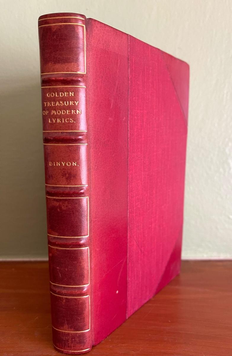 LOT 70 - Golden Treasury of Modern Lyrics selected and arranged by Laurence Binyon. Published in 1924. Leather-bound. with gold gilt lettering. This book was part of the David-Pleydell-Bouverie library at Bouverie Ranch in Glen Ellen. This item can be viewed at our Green + Cate Showroom in Sebastopol from July 15th - July 18th between the hours of 9am-5pm. For the benefit of the Bouverie Preserve of Audubon Canyon Ranch.