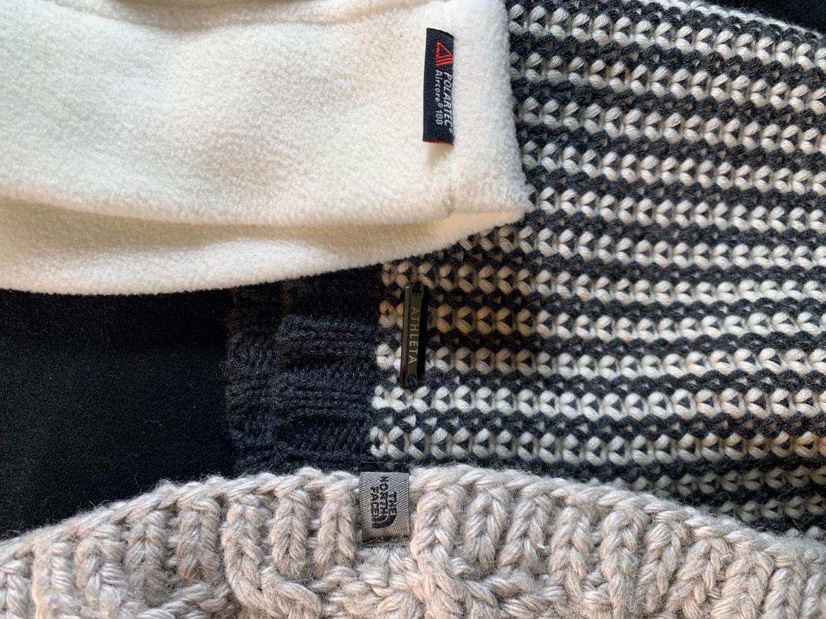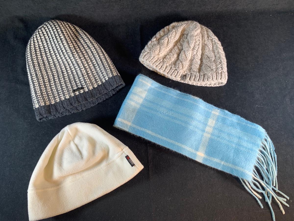North Face knit hat, Polartec Aircore 100 white hat, Athlete cable knit hat, blue scarf