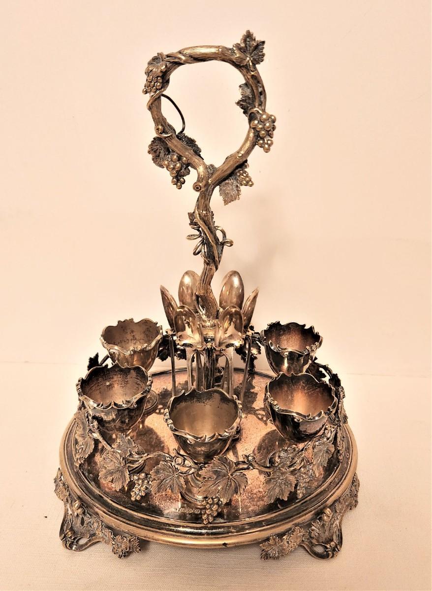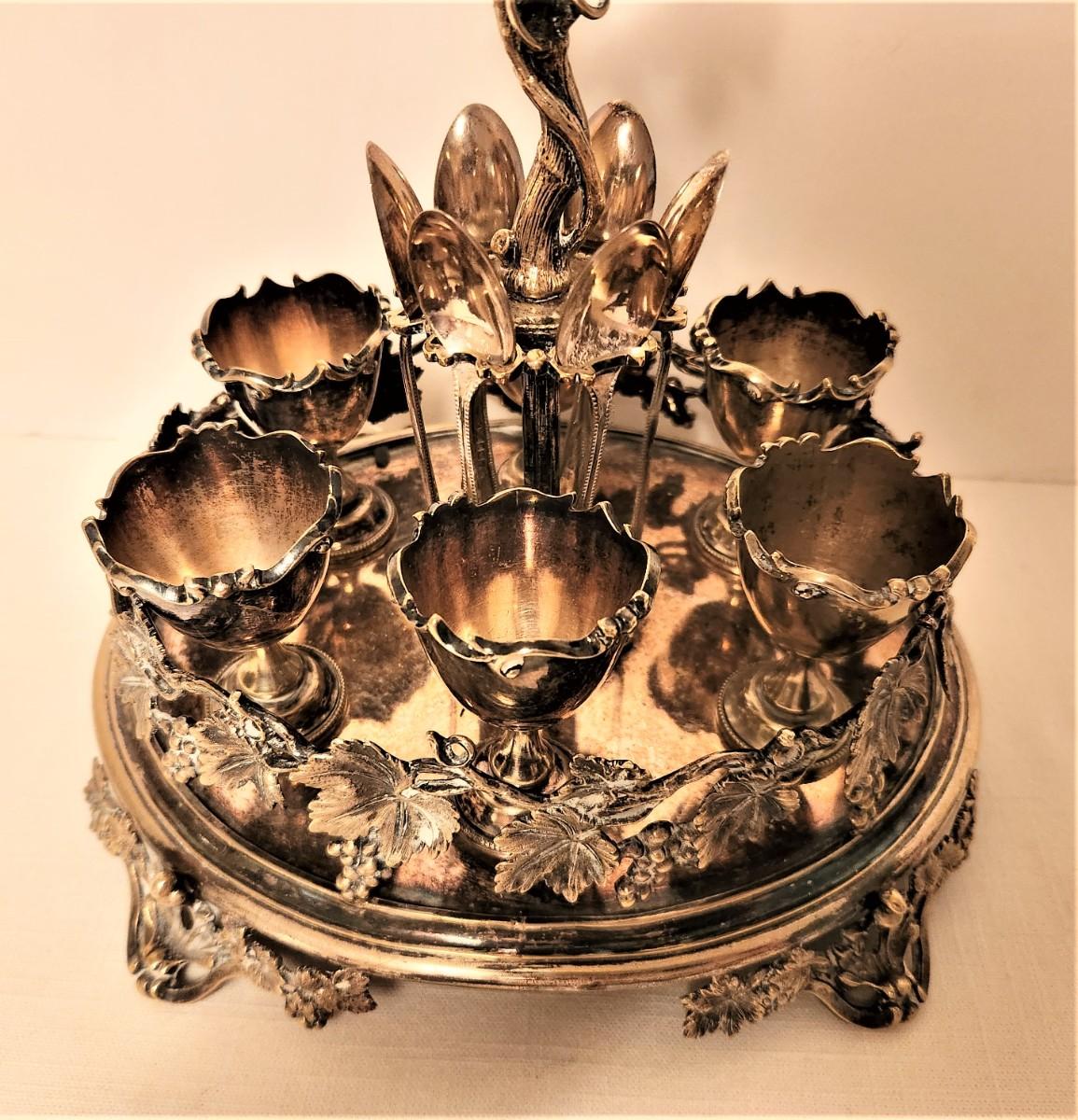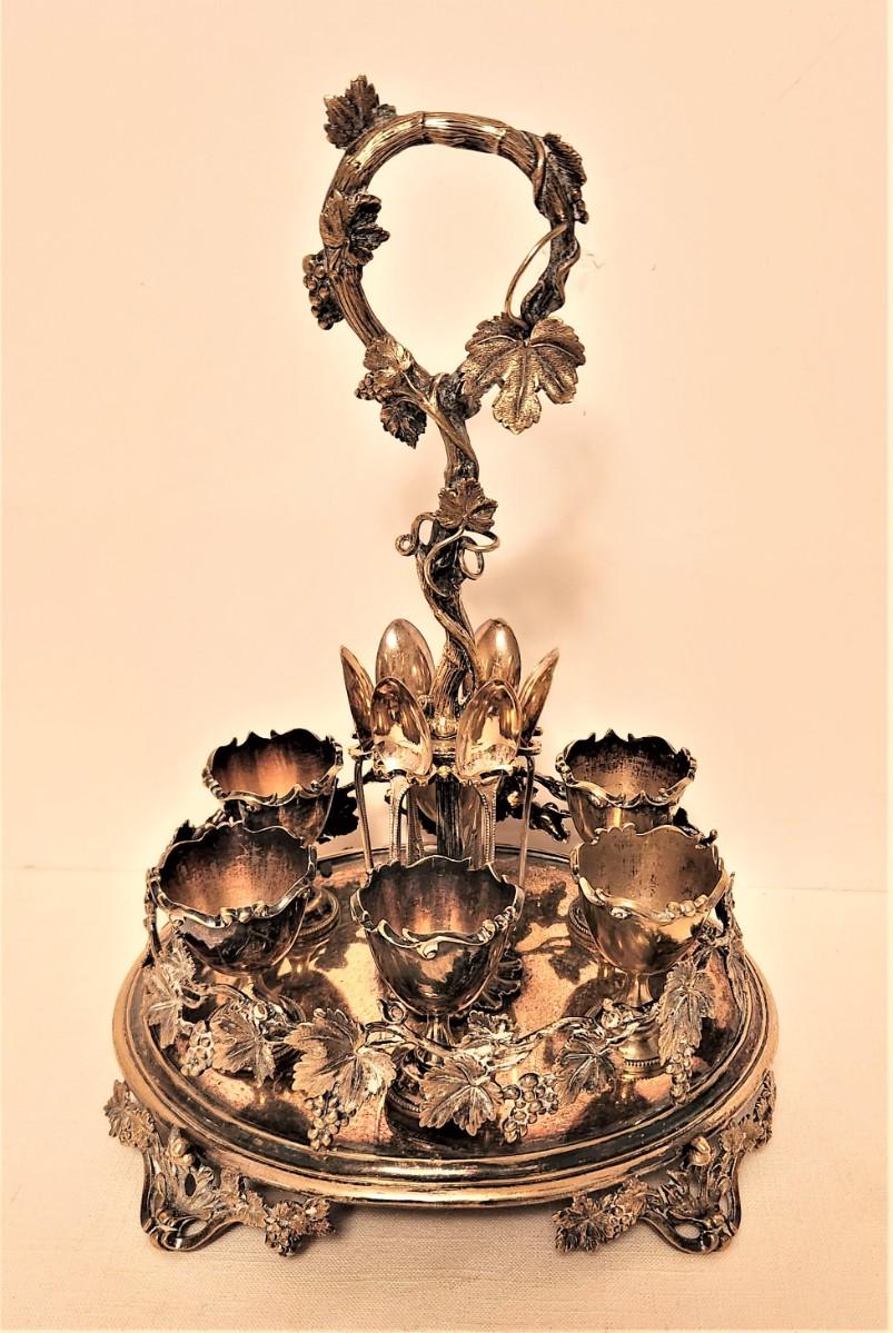 What a beauty! Complete silverplate breakfast egg set - silverplate with hallmarks - English, 12" tall. Six soft/hard boiled egg holders with spoons, elaborate foliate design.