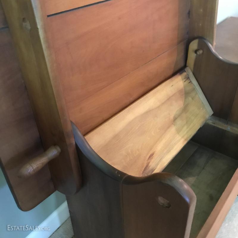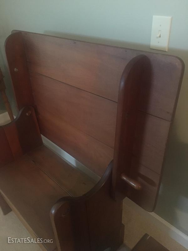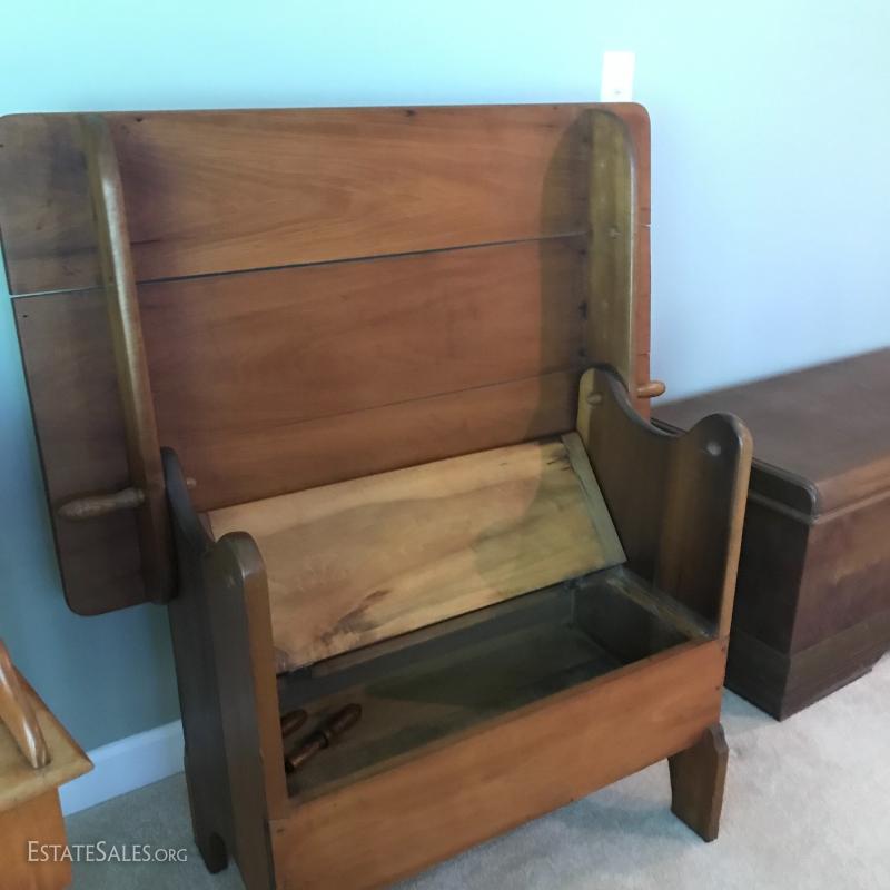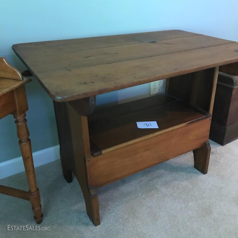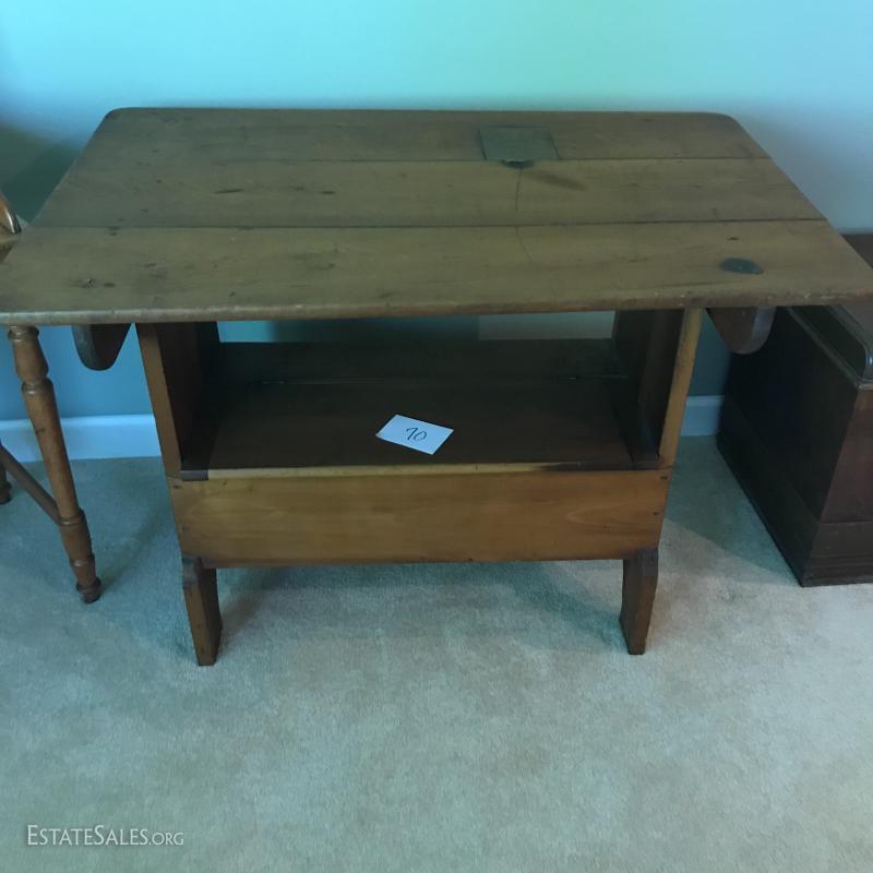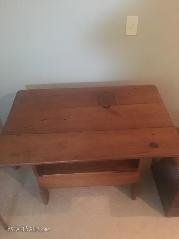 Primitive table or hall bench. Top can stay up or come down. Holes for wooden pole does not line up when it is down so it can not be secured.