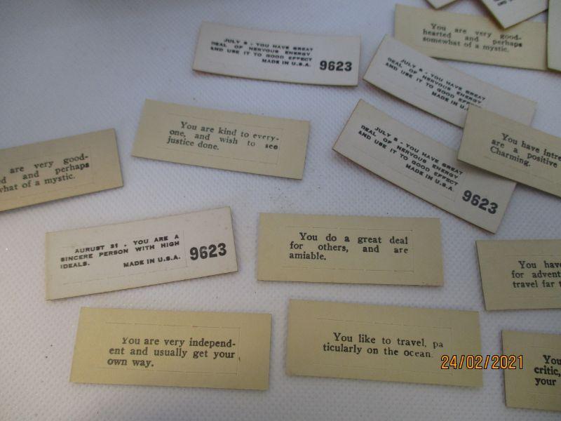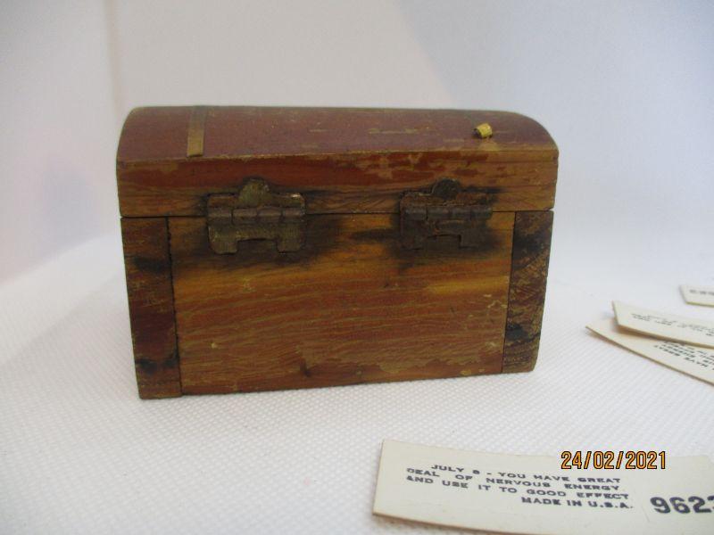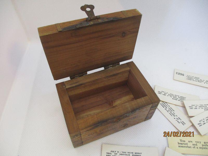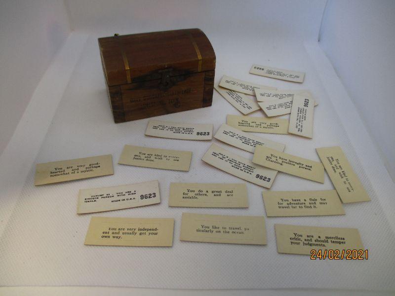 The box could stand to have a bit of oil re-moisturize the wood, but it's still in good condition. It has pieces of card stock that have positive sayings on them like a fortunue cookie would.