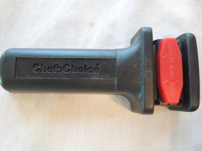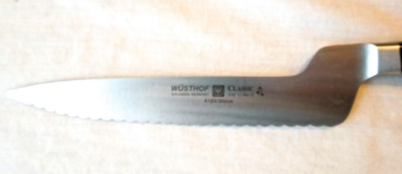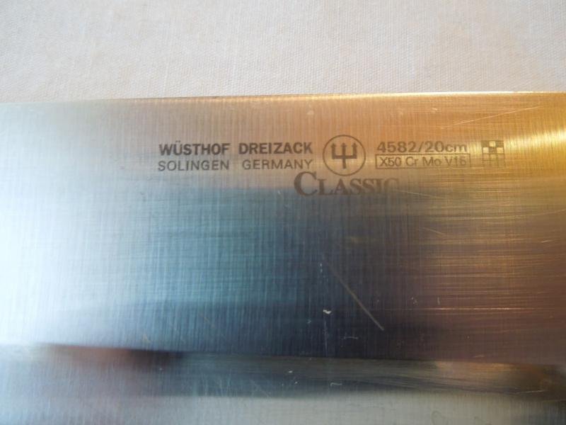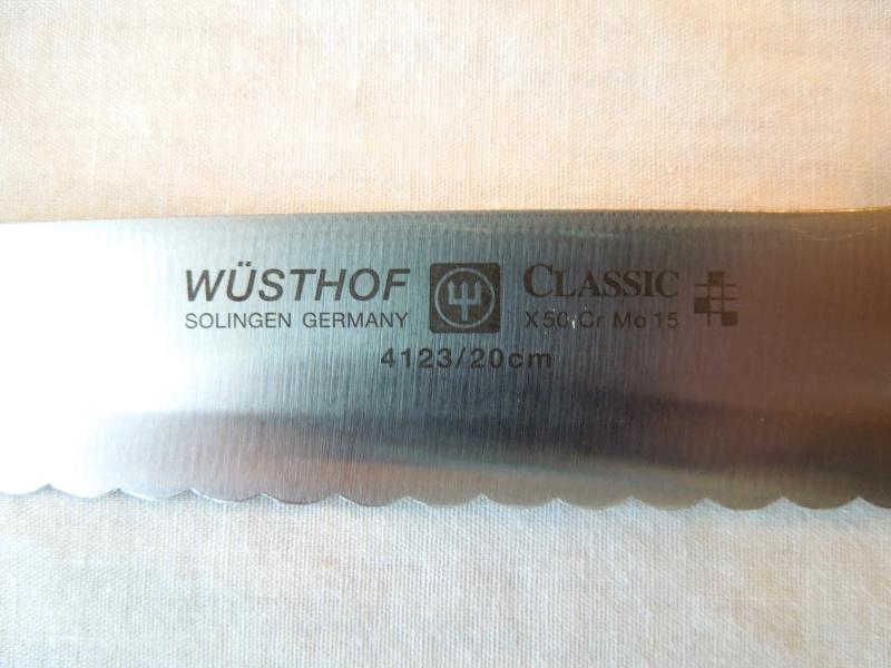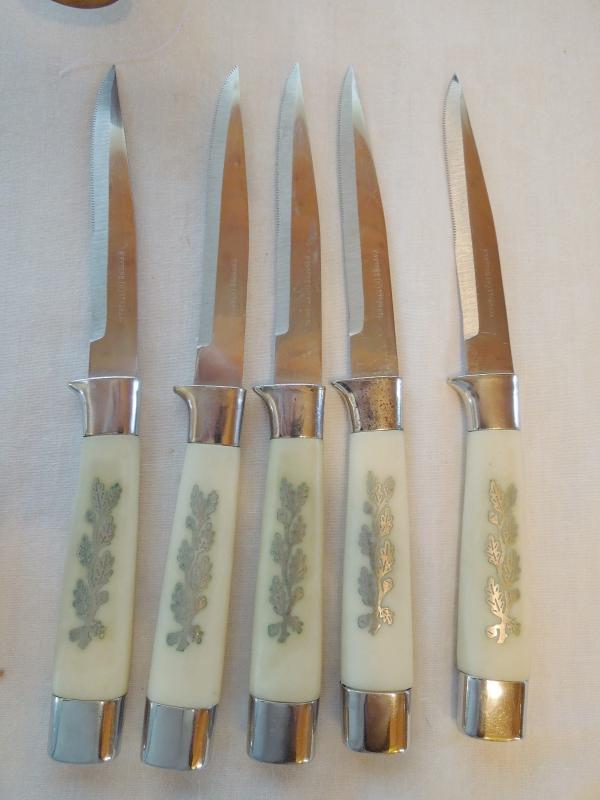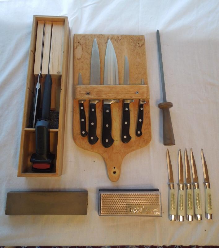 Wusthof Germany set of 5 in mounted wood cutting board; filet knife; serated knife and vintage set of 5 steak knives. Also included are 3 sharpeners: a Diamond whetstone, regular whetstone and Chef's Choice manual sharpener. In very good condition.