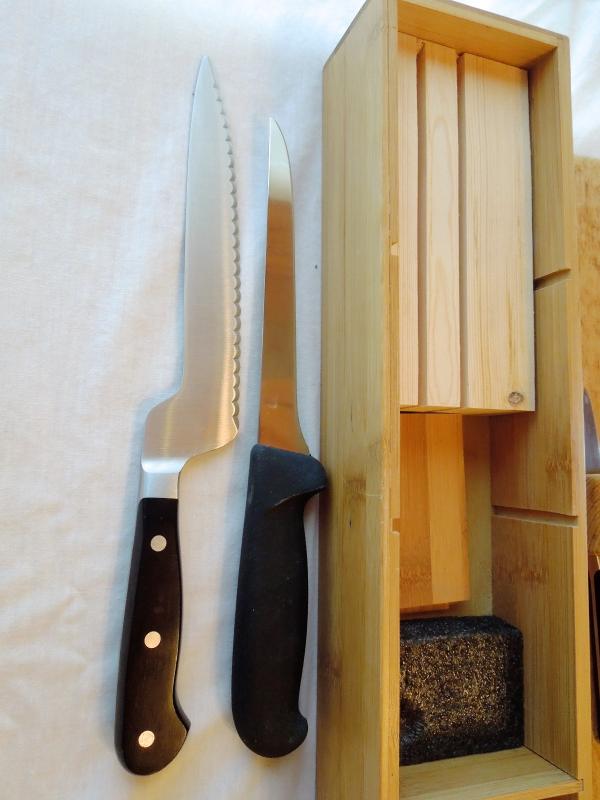 Lot 70: Eight Chef Knives and 5 Steak Knives, Whetstones and Cutting Board