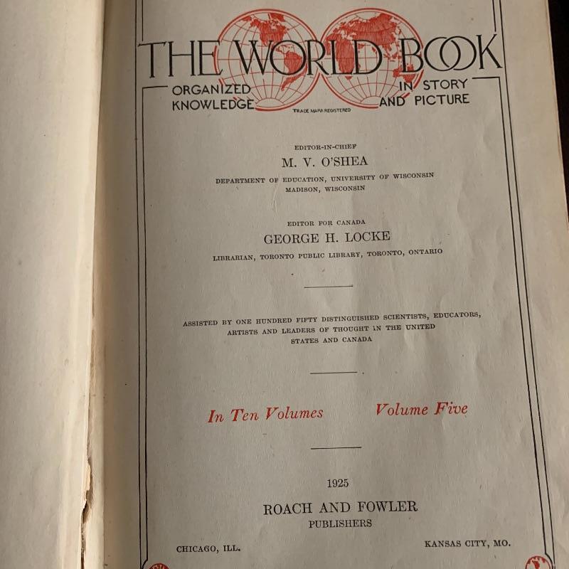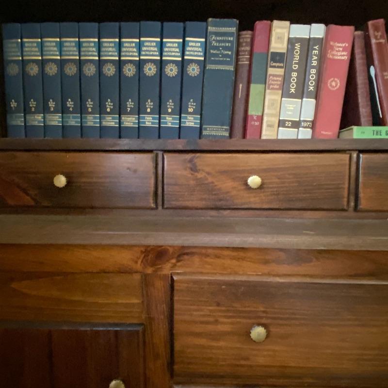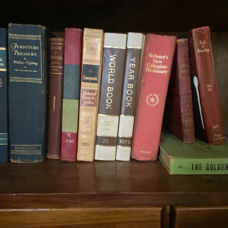Lot includes 10 piece Grolier Universal encyclopedia set. A Macmillan Furniture Treasury. Books of knowledge, World Book a Year Book from 1973, a Merriam-Webster Dictionary, as well as three additional encyclopedias. Local pickup only